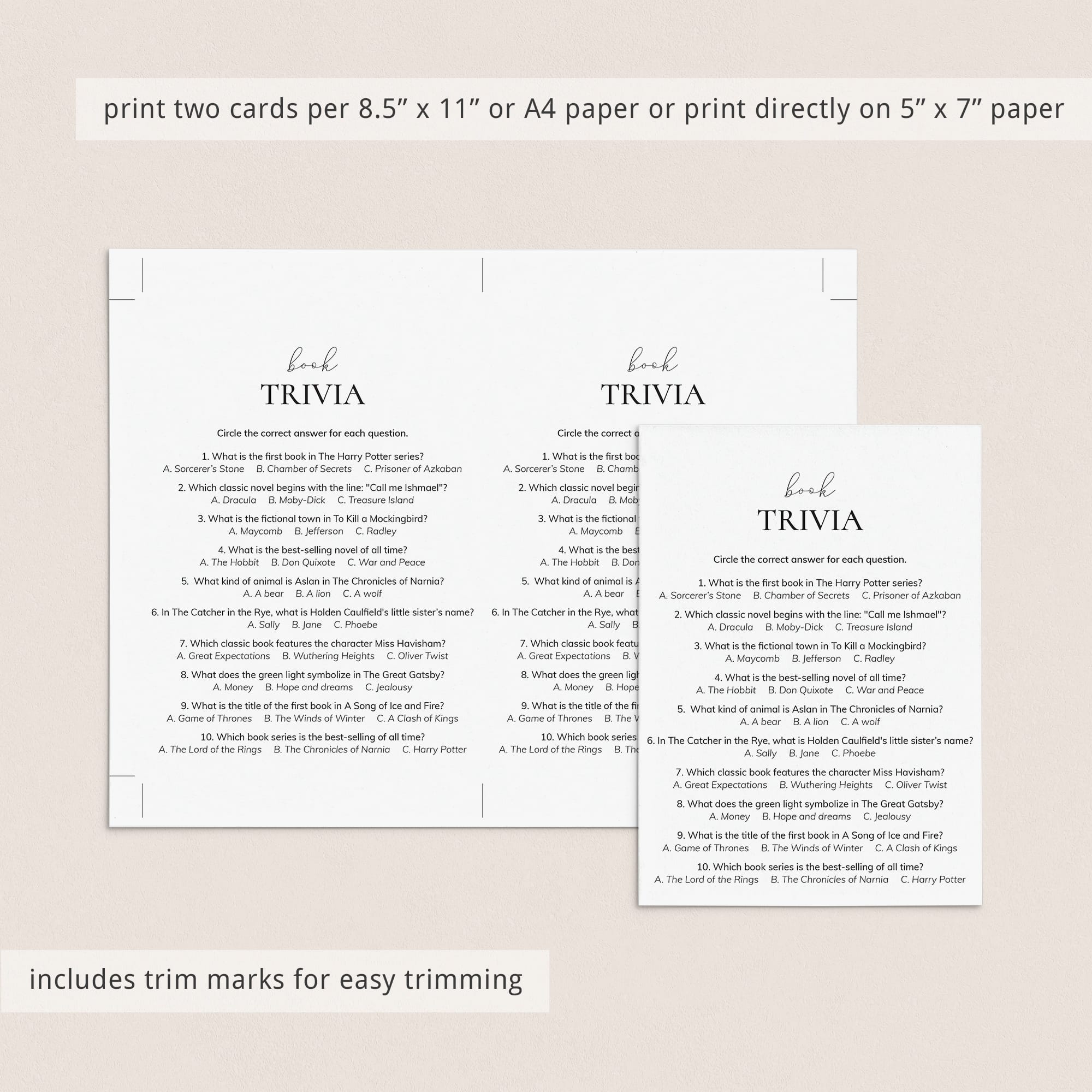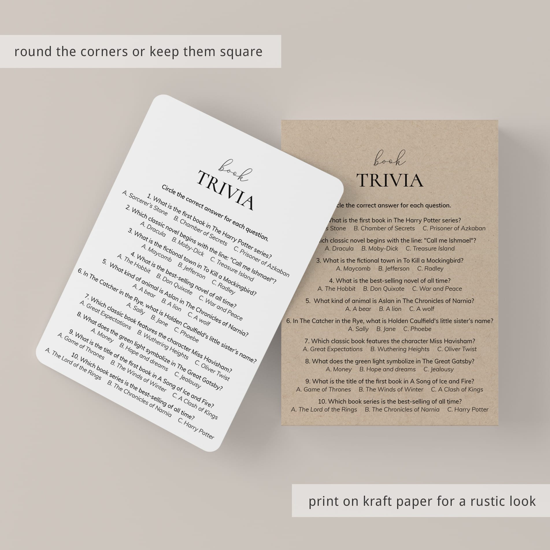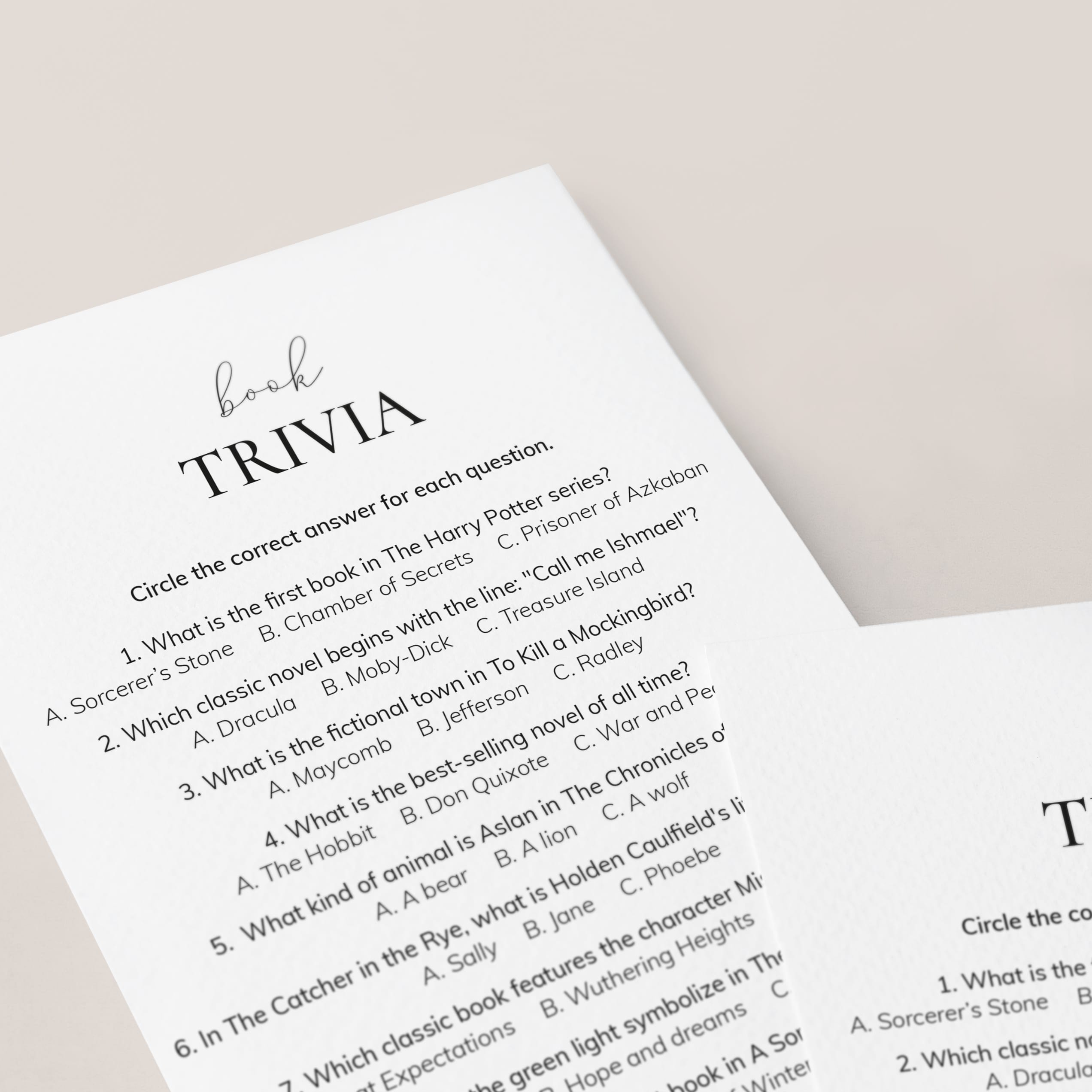 Challenge your literary knowledge with this fun Book Trivia quiz! Perfect for a Reading Group, Book Club meeting, or Book Party, this printable game includes 10 multiple-choice questions designed to test your knowledge of beloved books and authors.