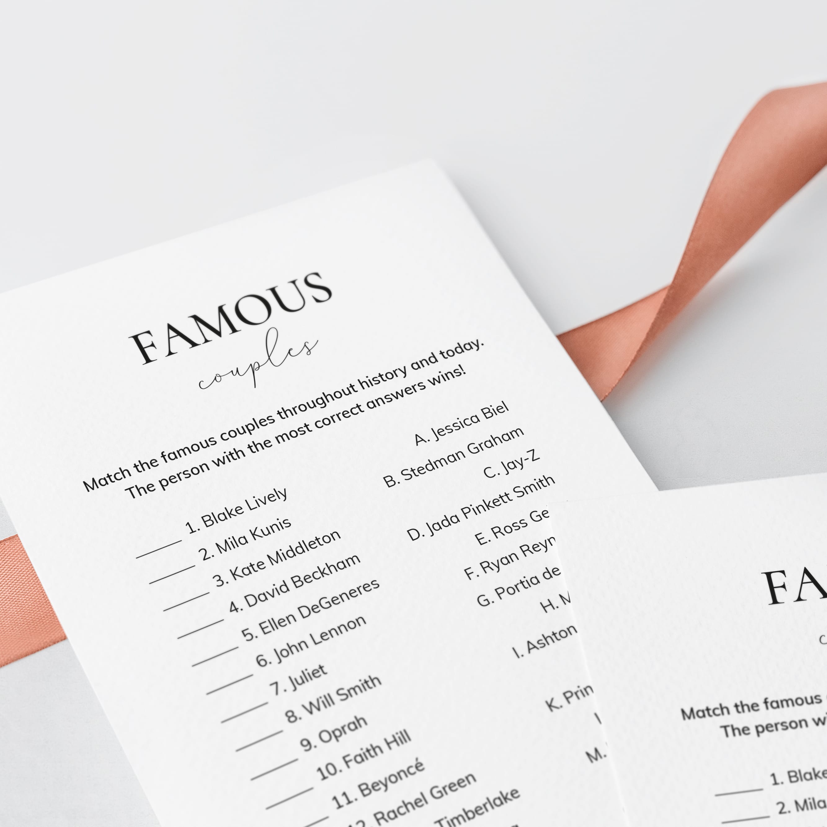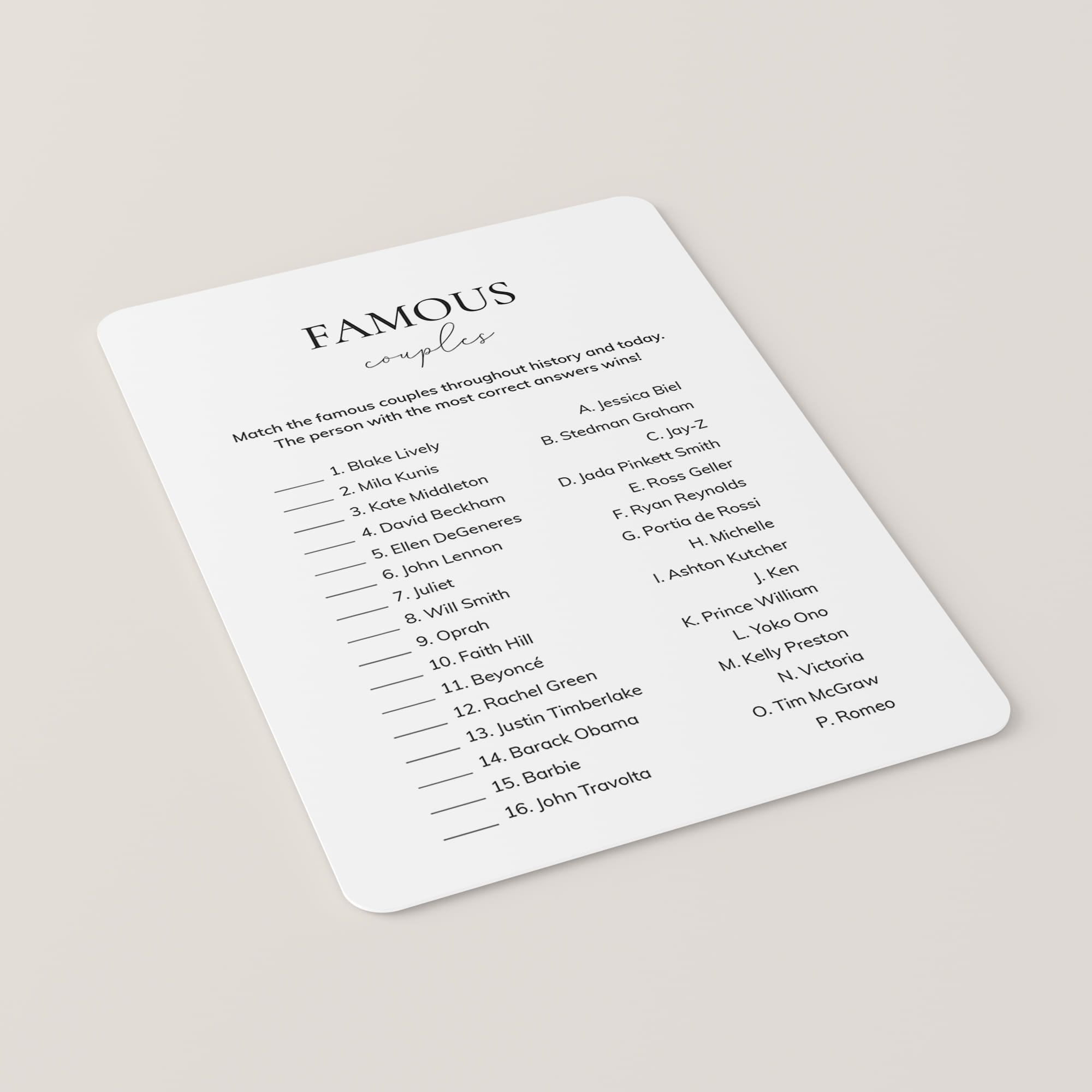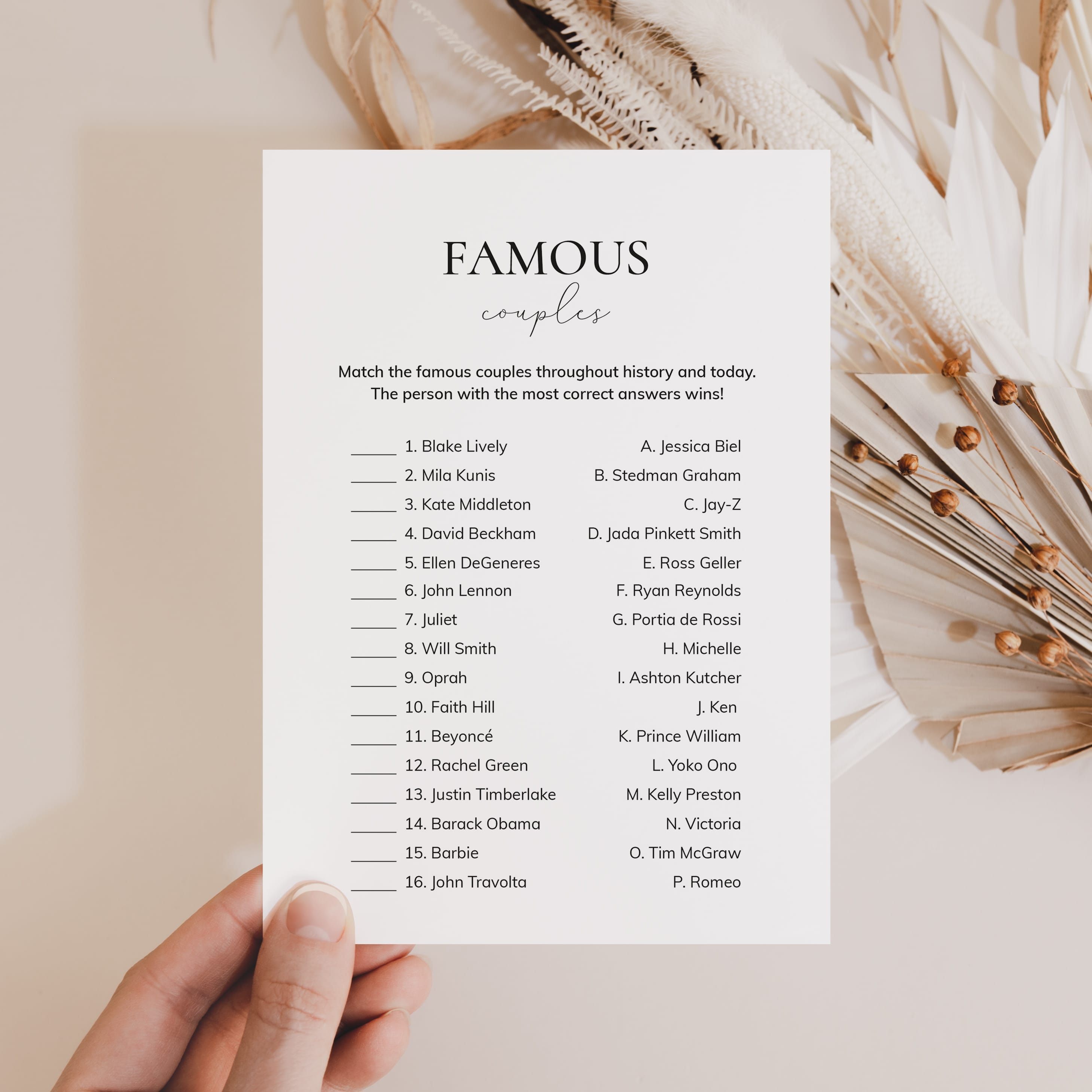 The game is very easy to play. Hand out this famous couples match game to your guests. Have them match the celebrity couples. The person with the most correct answers wins. An answer key is included.