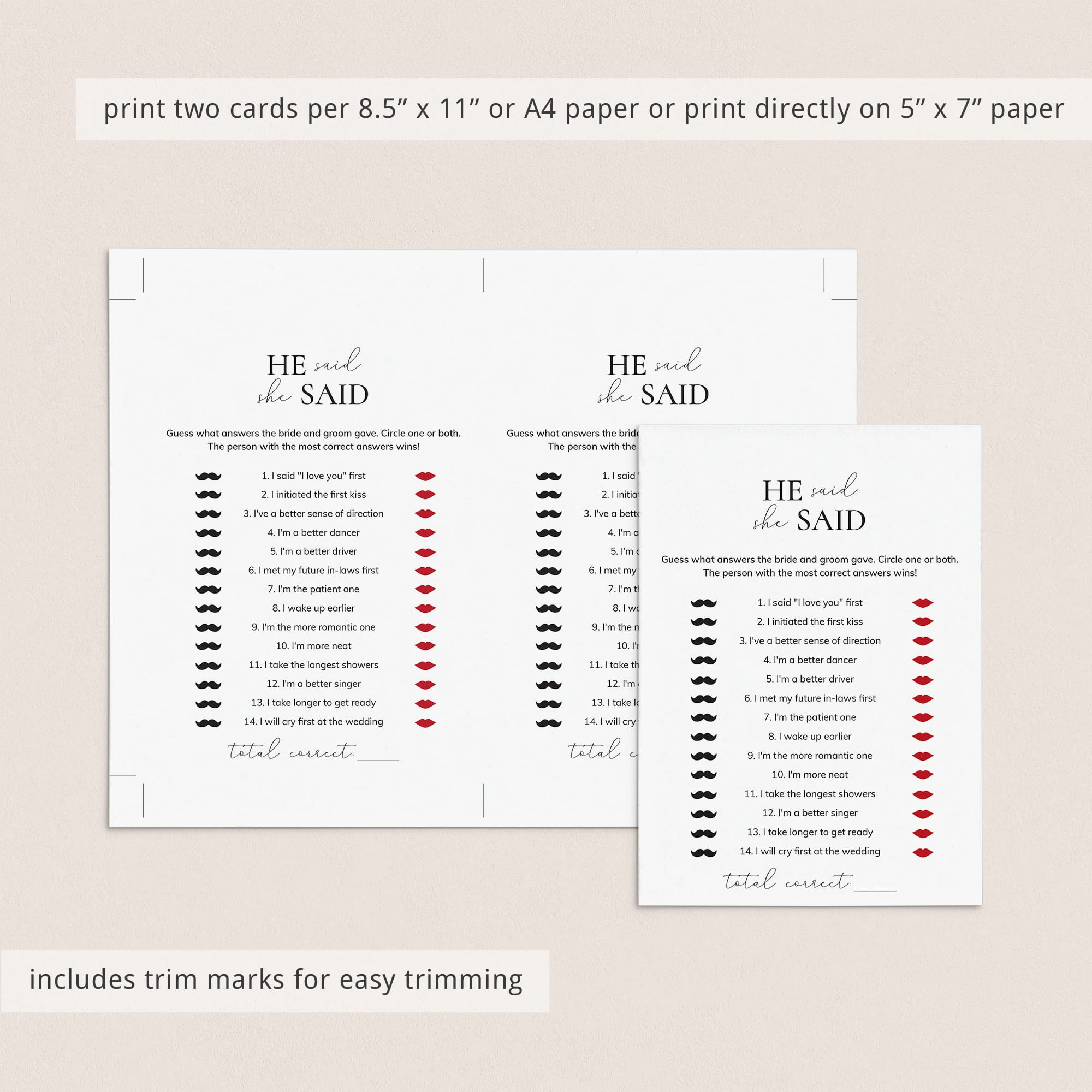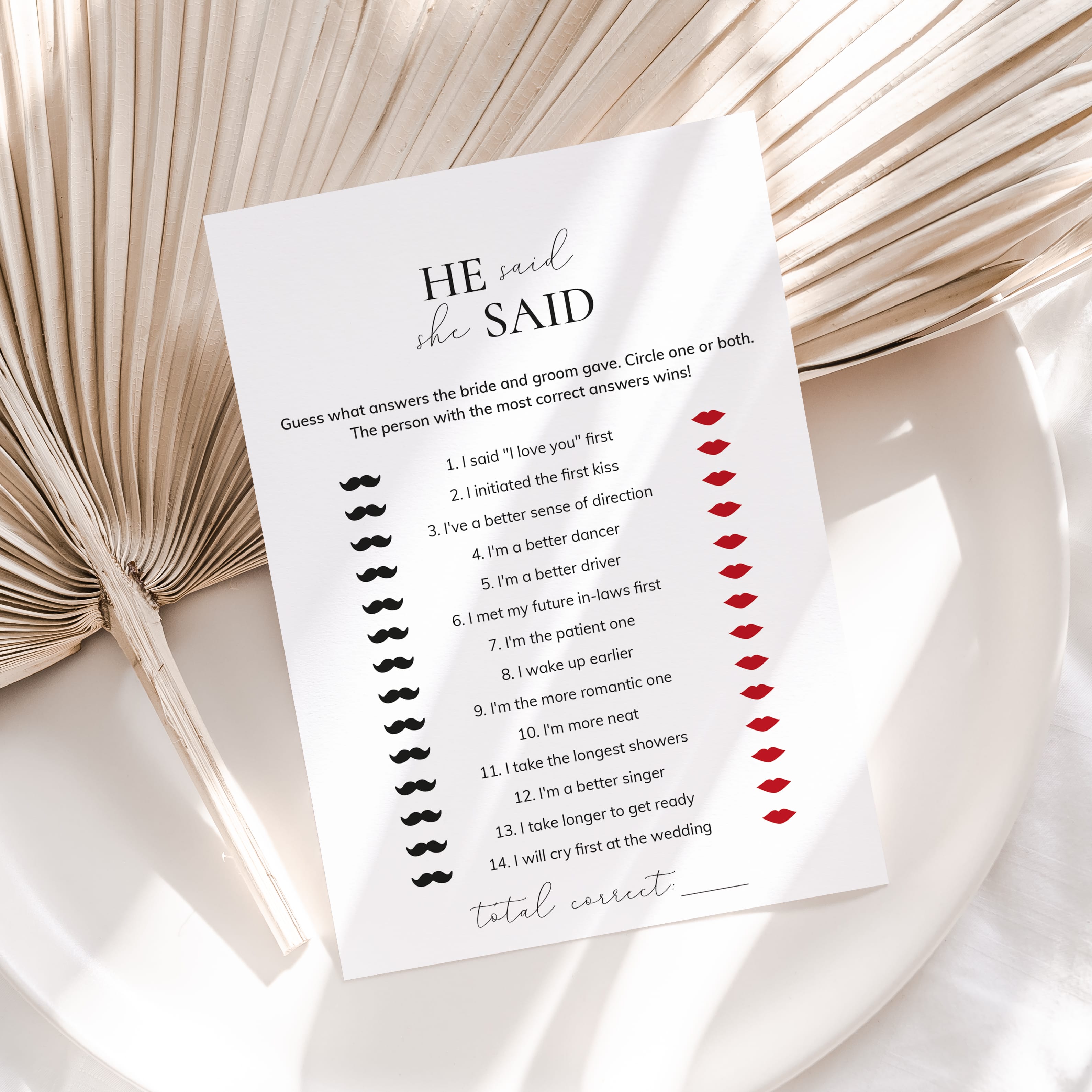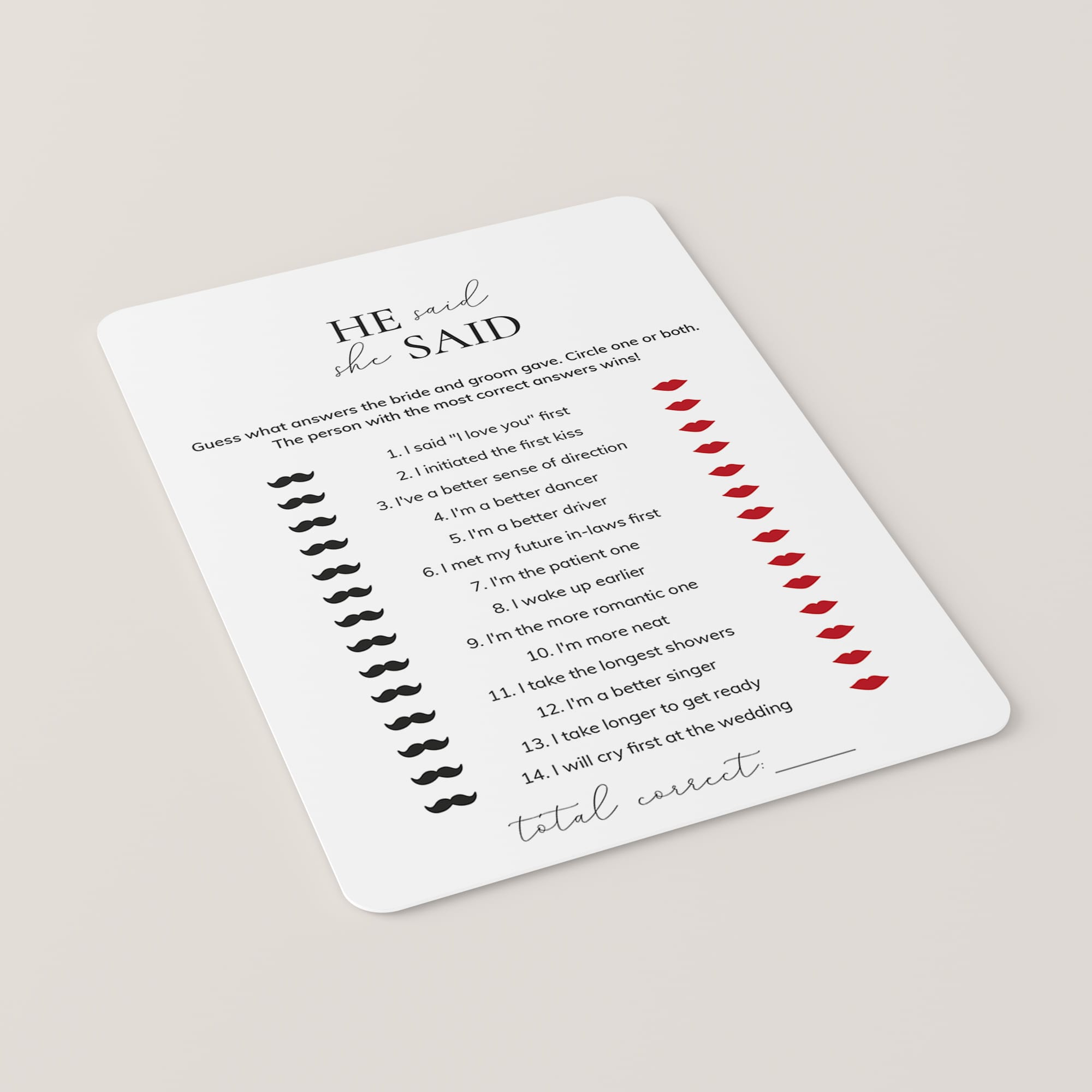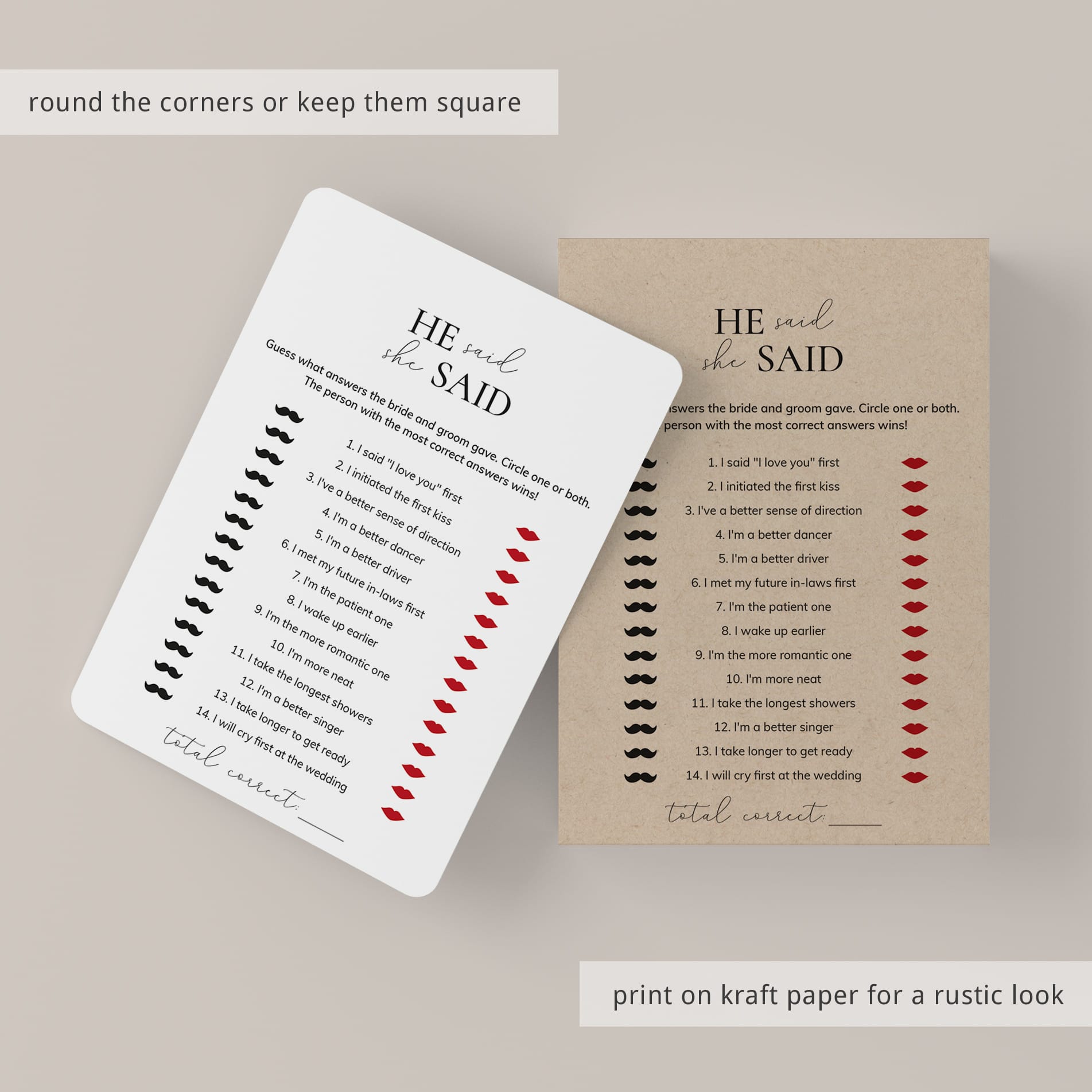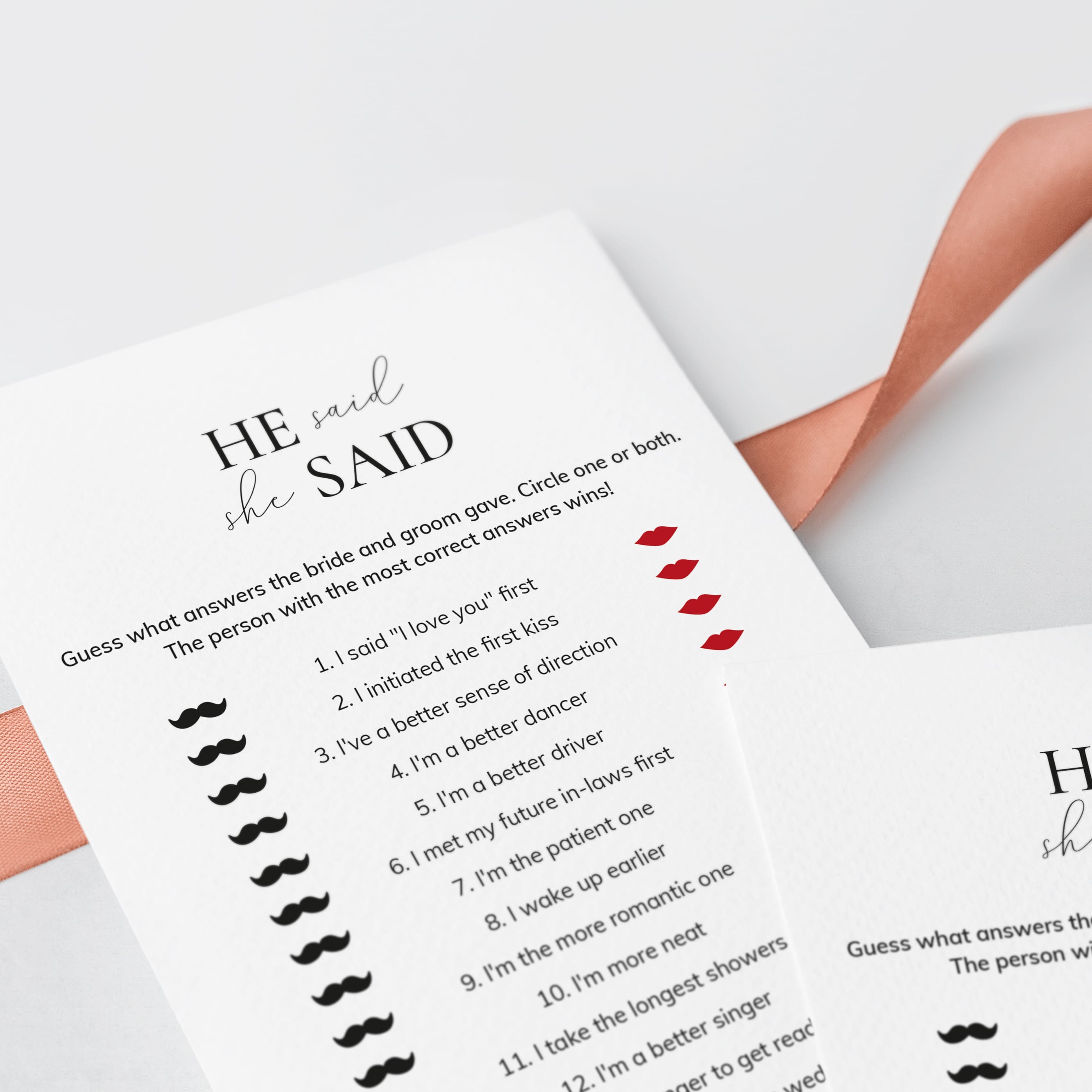 A He Said, She Said game is such a fun way to find out more about the soon-to-be-weds. These simple, yet elegant game cards are the perfect addition to an engagement party or couples wedding shower.
