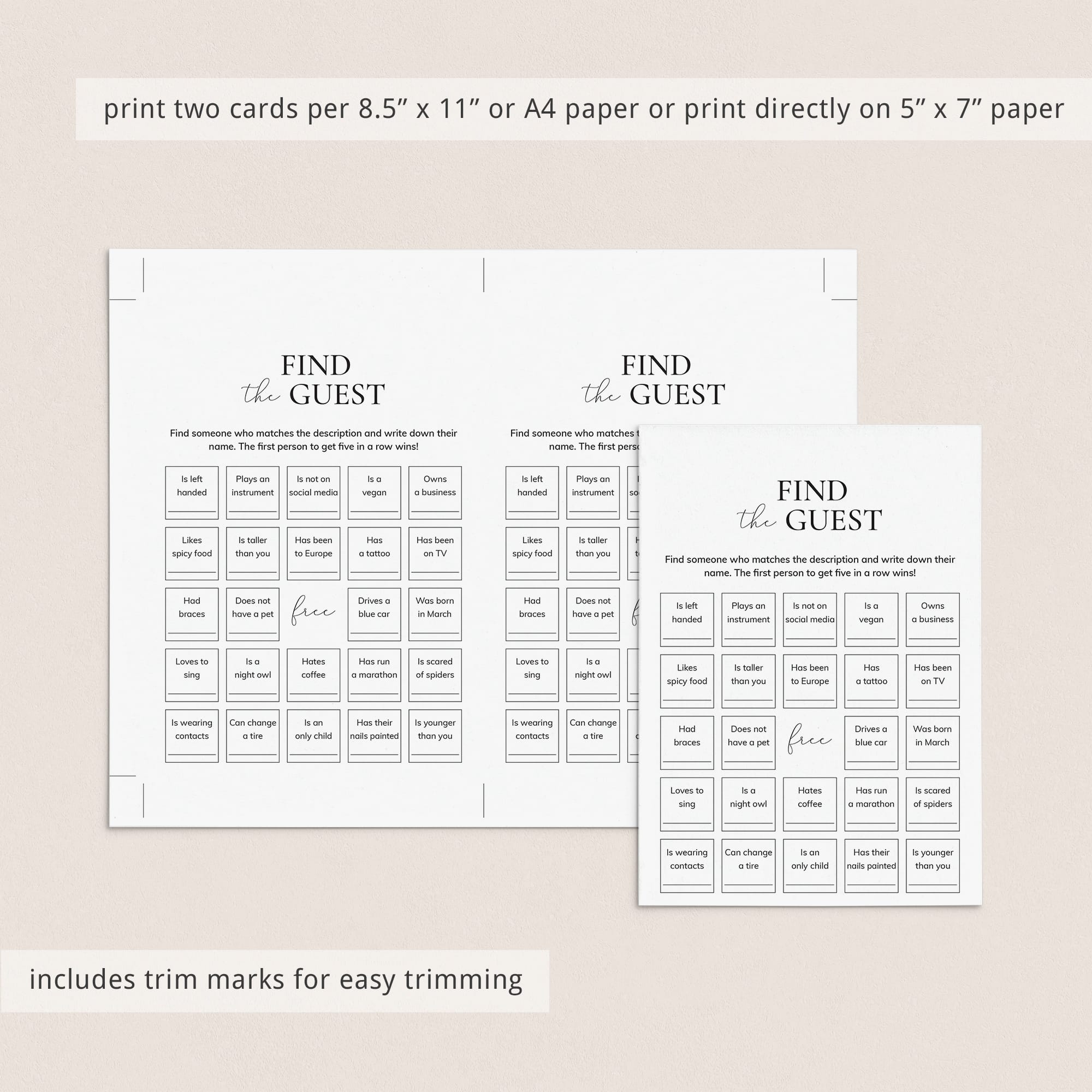Make sure everyone mingles with this Icebreaker Bingo Find The Guest game. Let your guests find the person that matches the description and write down their name on the bingo cards. The first person to get five in a row wins!