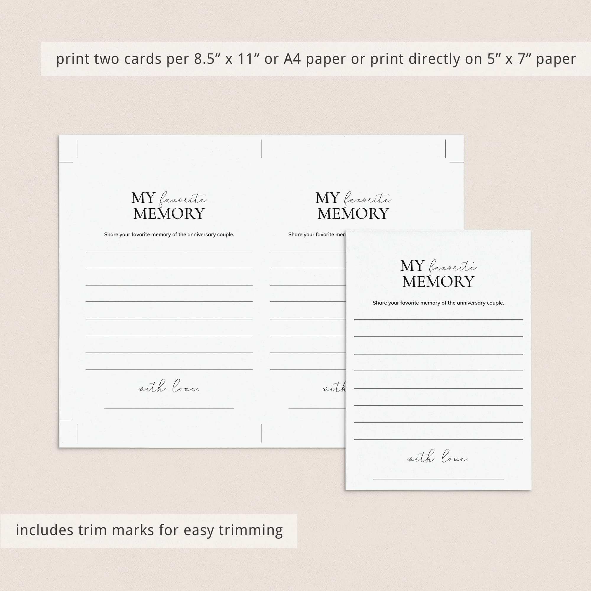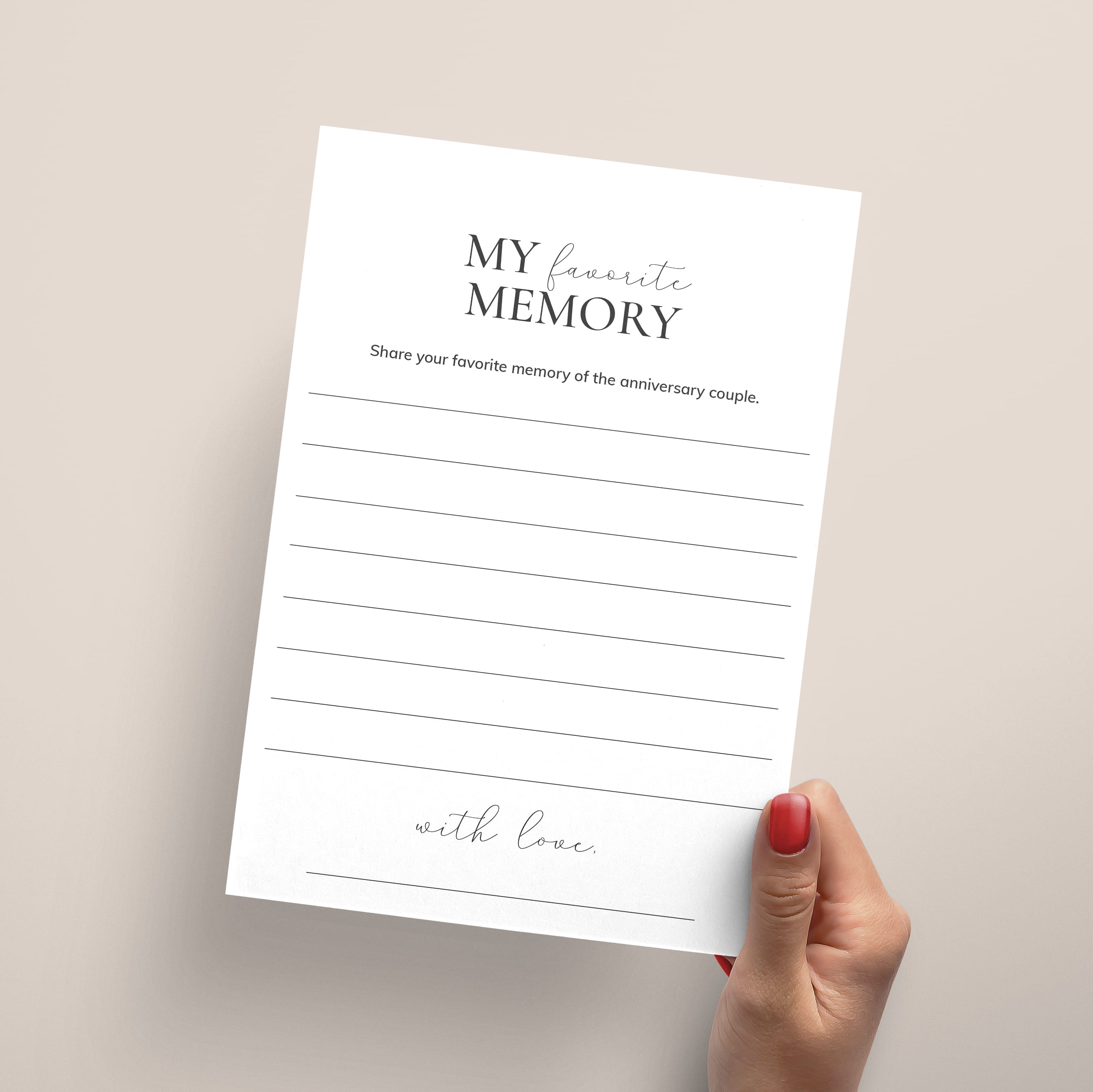 Are you looking for a memorable keepsake for an anniversary party? Have your guests share their Favorite Memory with the anniversary couple with these minimal and elegant wedding anniversary cards. It's the perfect addition to your anniversary party and sure to be a hit!