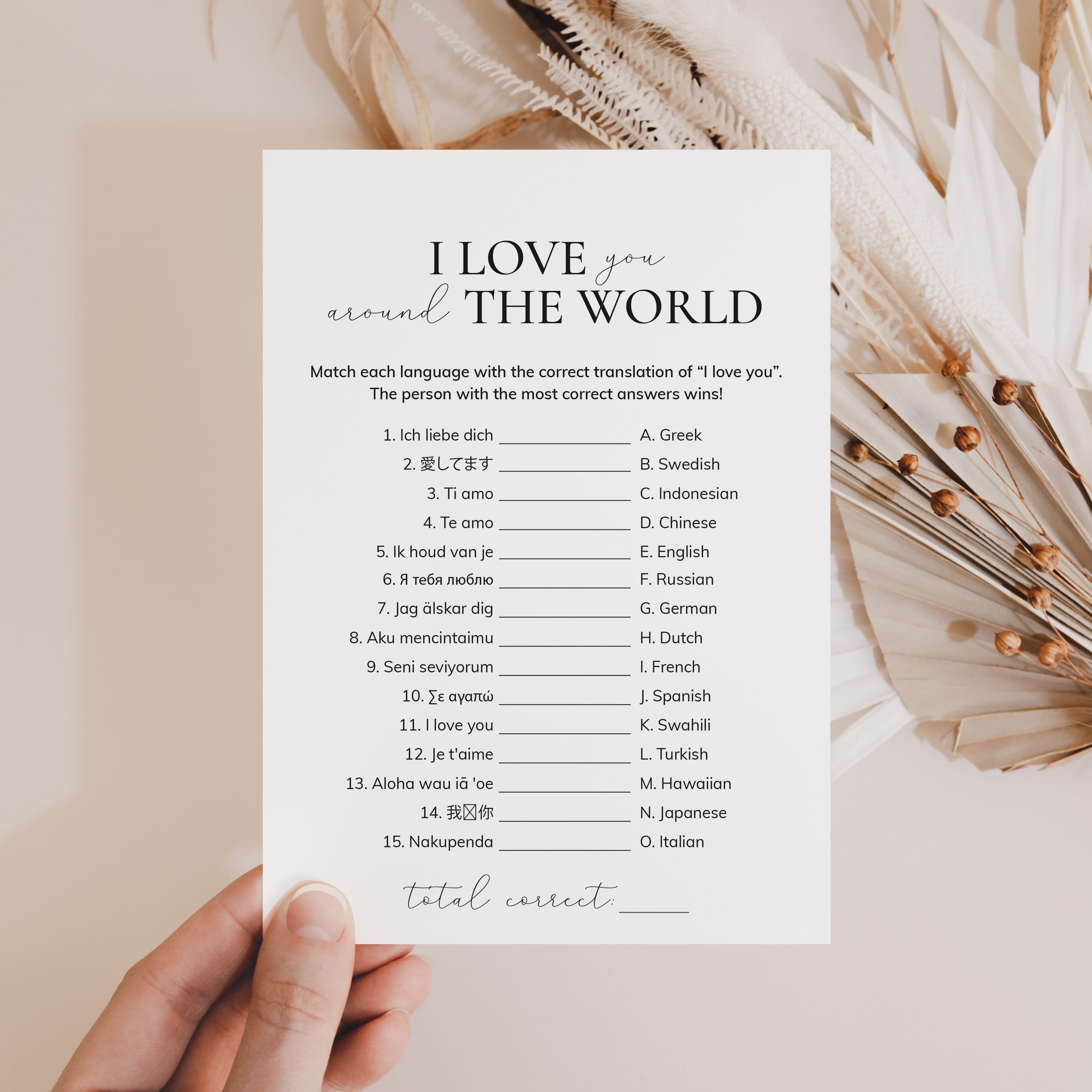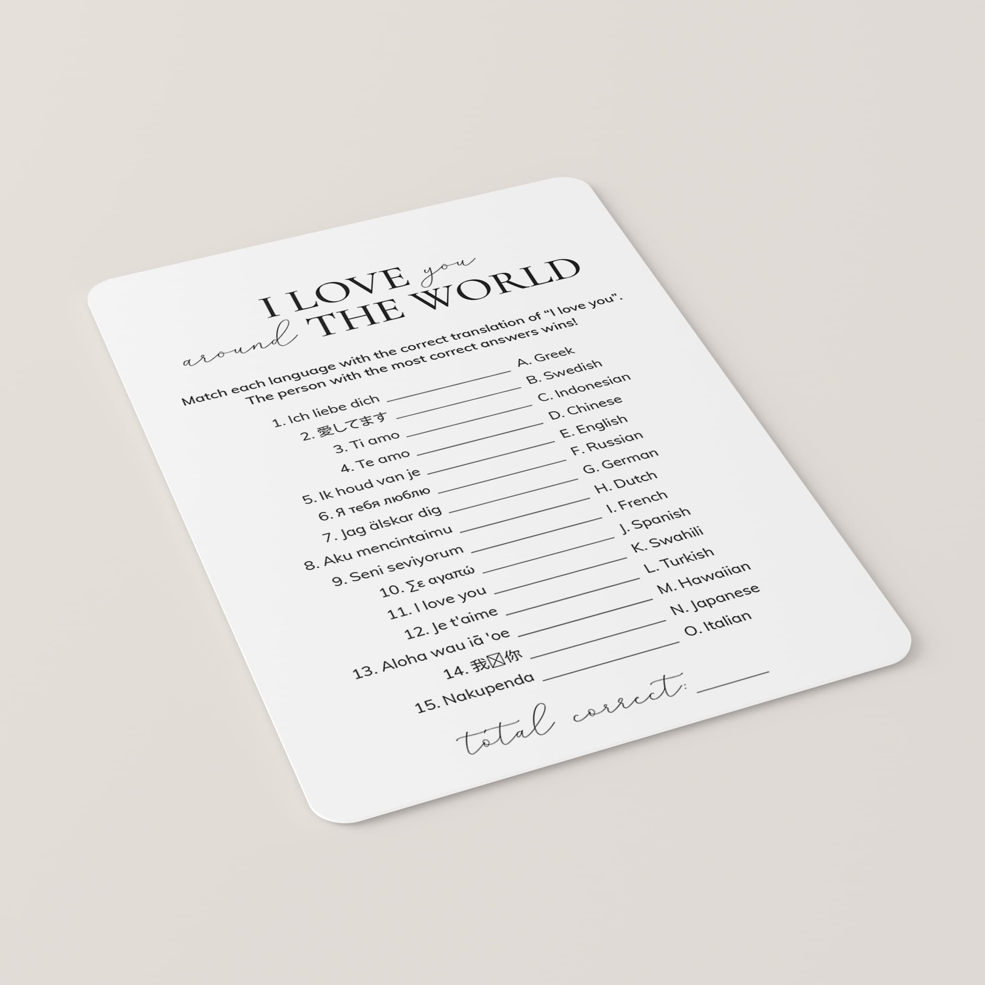 The game is very easy to play. Print and distribute these minimalist, yet elegant, I Love You Around The World game cards and a pen to each of your guests. They have to match each version of the words “I Love You” with its language of origin. The person with the most correct answers wins.