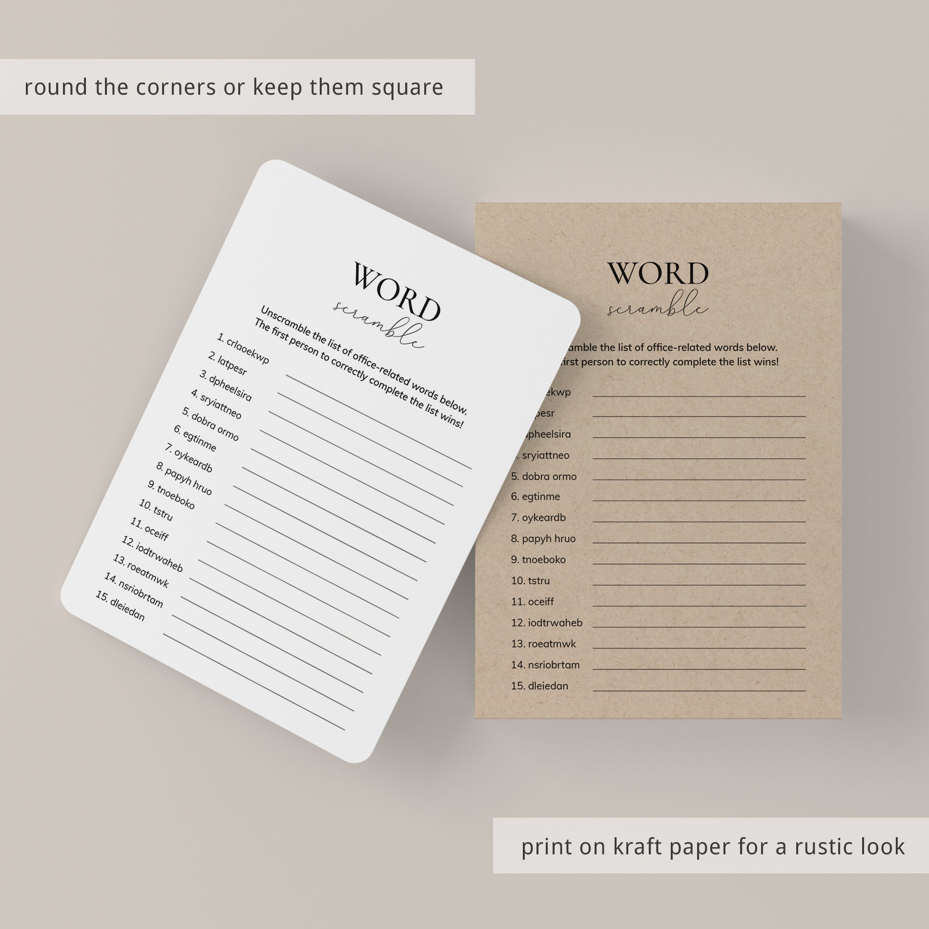 Play one of the most popular party games with this minimalist Office Word Scramble game. The black and white game will fit any office party theme. This game will create a fun and enjoyable moment for all of your co-workers.