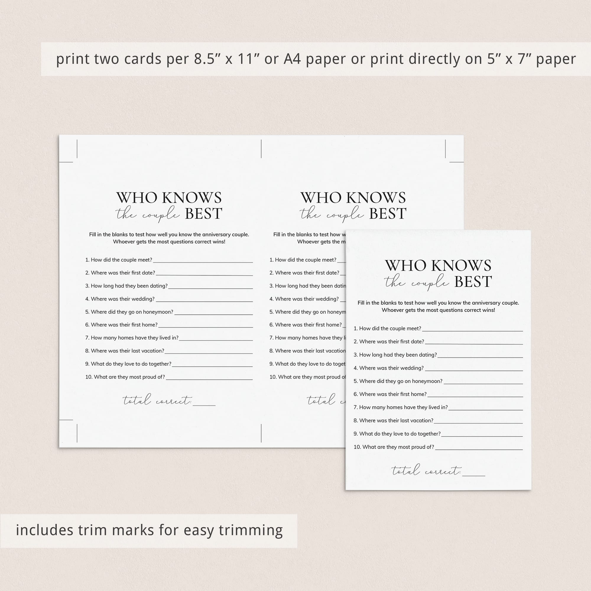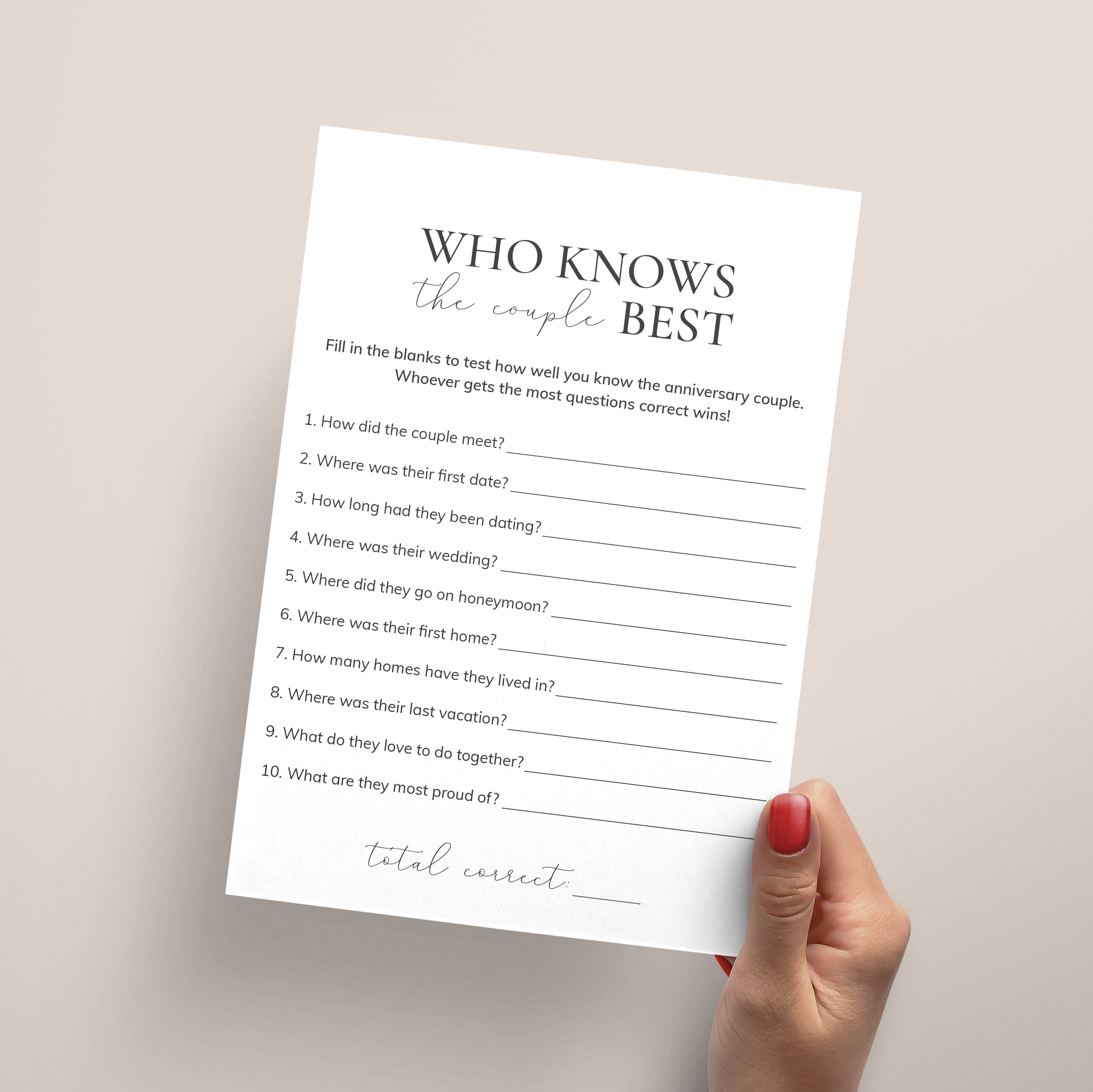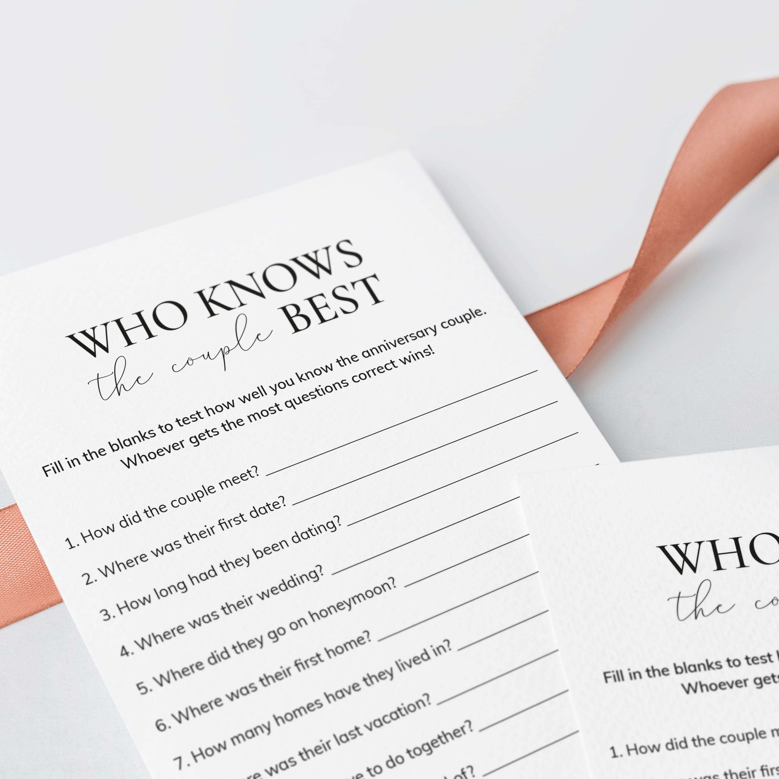 Test your guests how well they know the anniversary couple and play "Who knows the couple best" with this fun anniversary trivia quiz. This wedding anniversary trivia is a great way to bring disparate people together and to put them all in a party mood. It's the perfect addition to any anniversary party, no matter how many years you are celebrating.