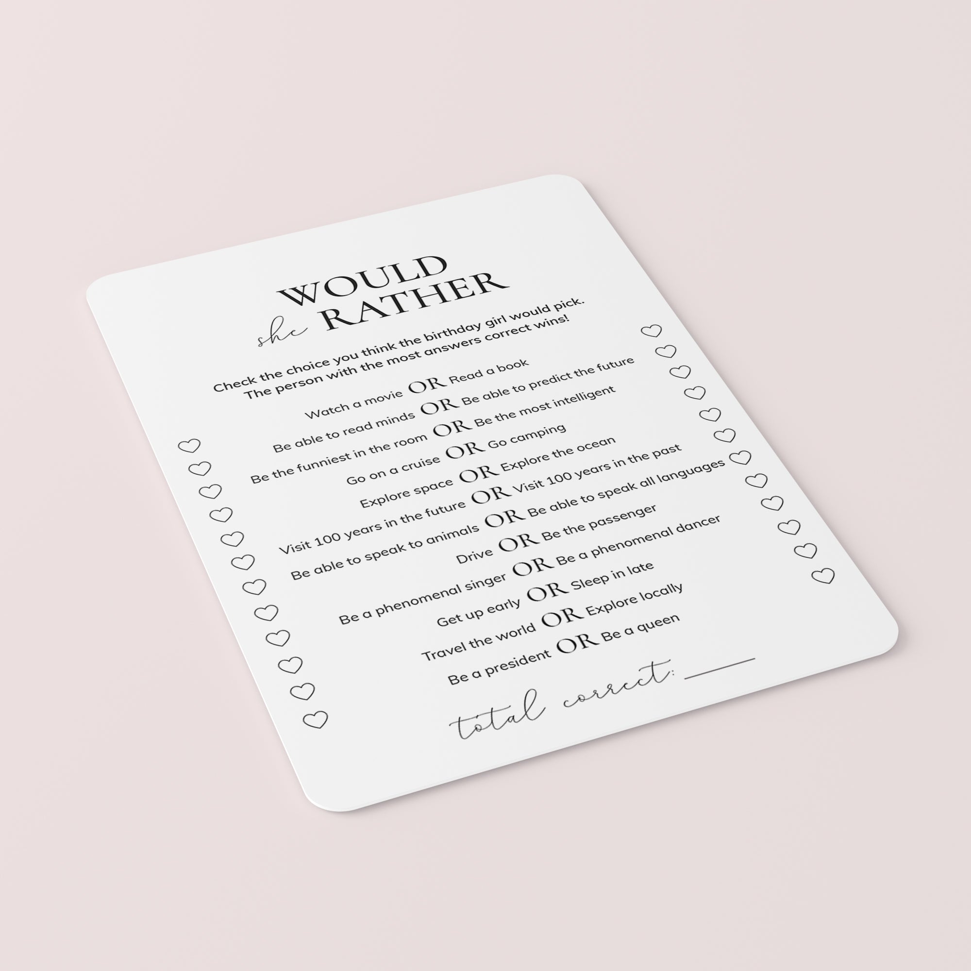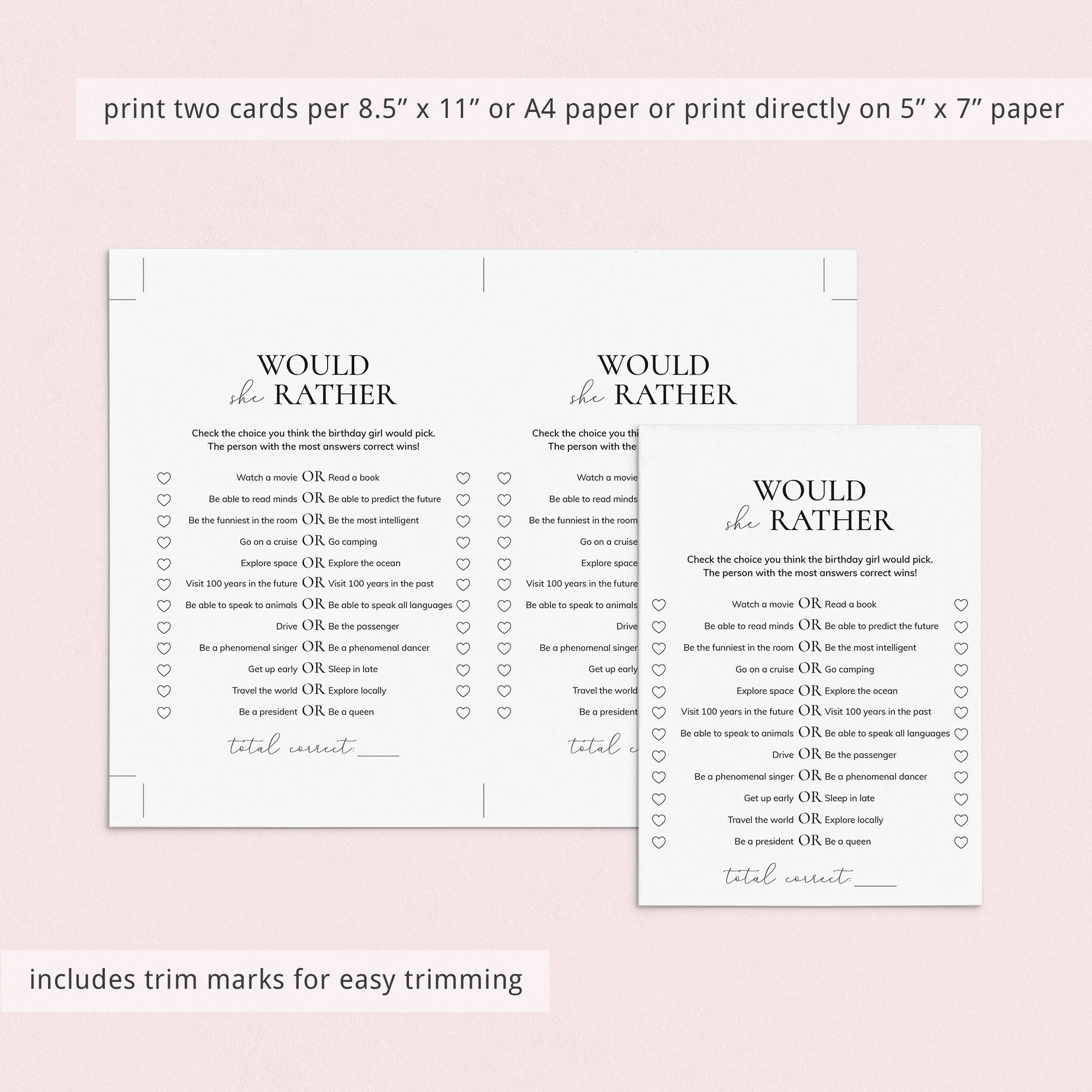 Play this fun birthday Would She Rather game and WOW your guests with your elegant game cards!