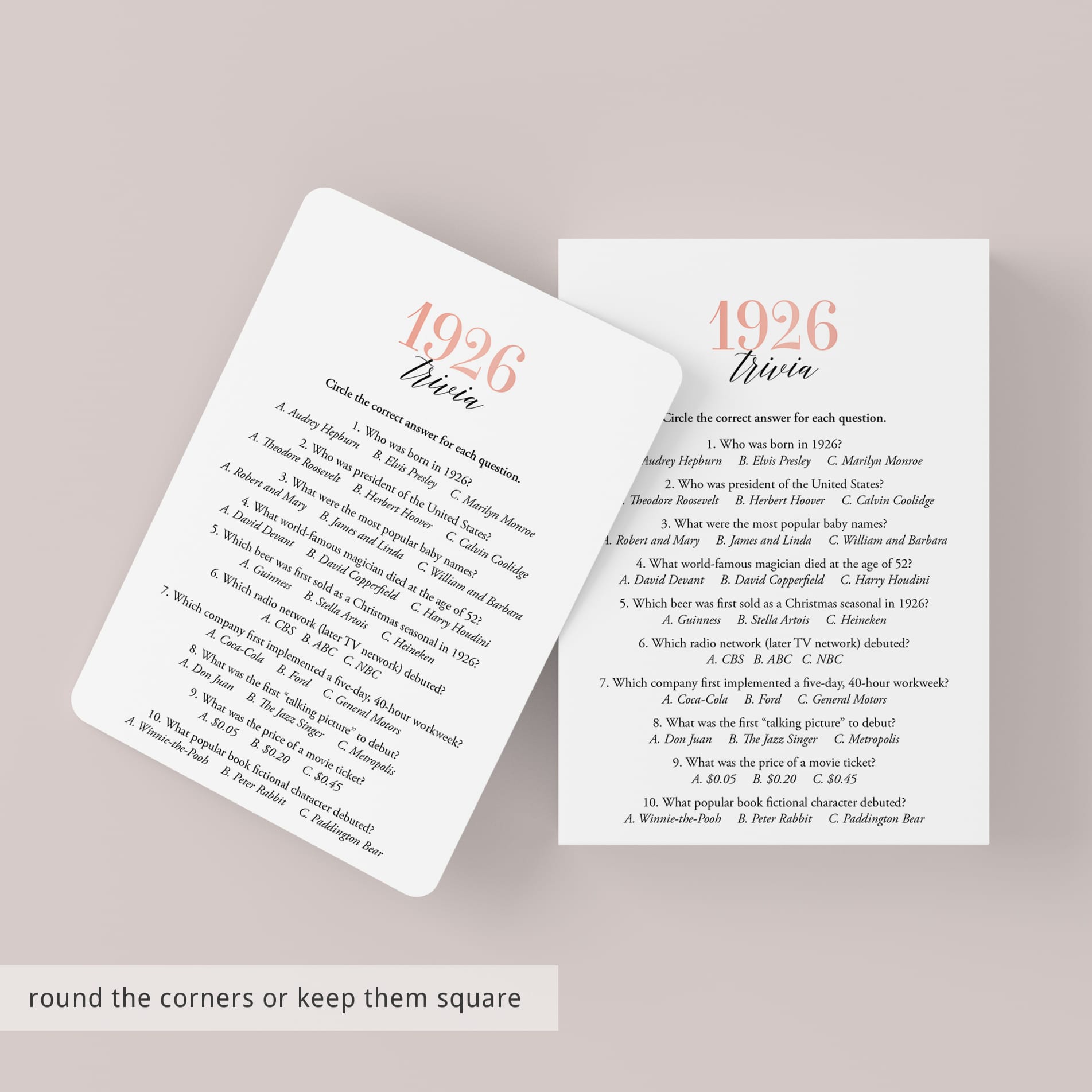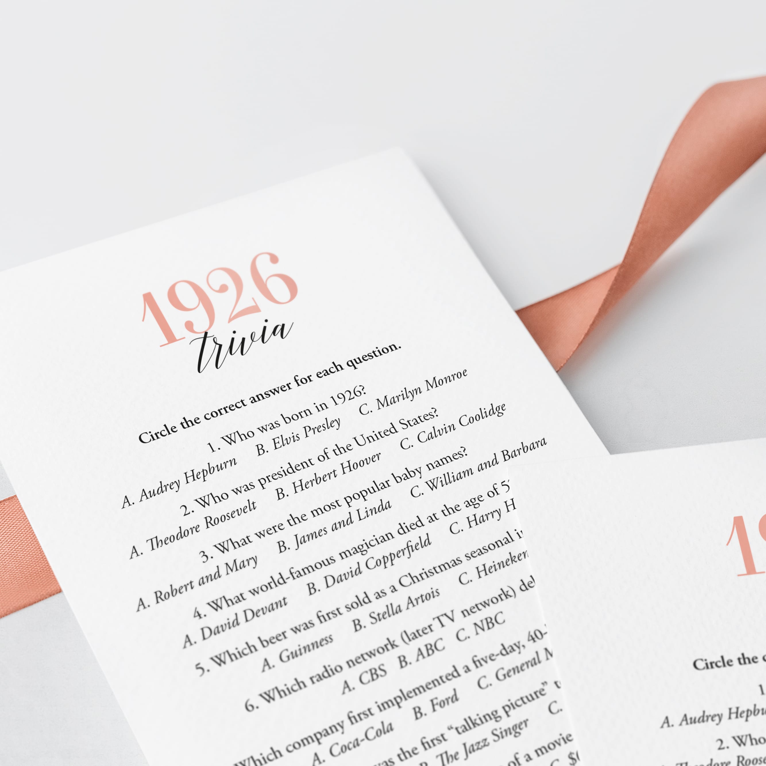 Are you looking for a fun game for a woman's 100th birthday party? Look no further! This 1926 Trivia, with 10 multiple-choice questions, is perfect for celebrating with friends and family. Test your guests’ knowledge of 1926 pop culture!