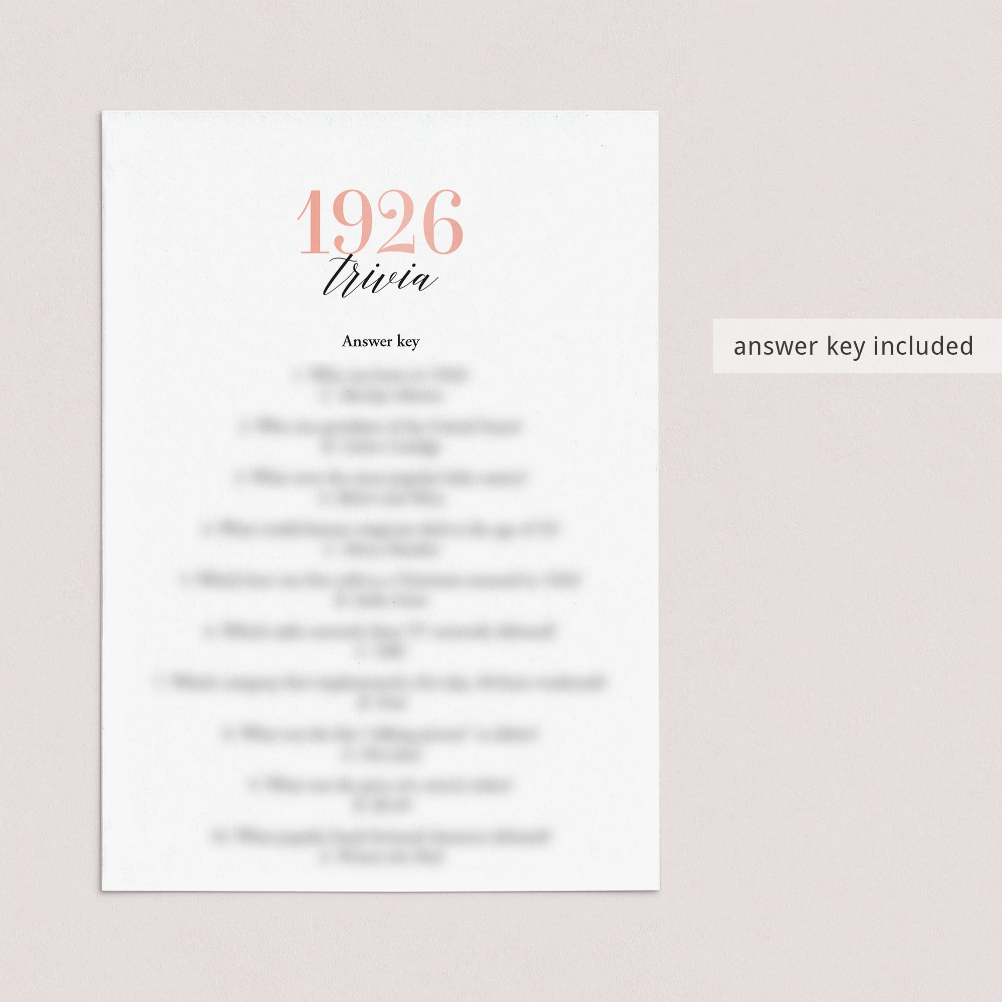 Just in case you are having trouble figuring out the answers, an answer key with the 1926 trivia answers is included.