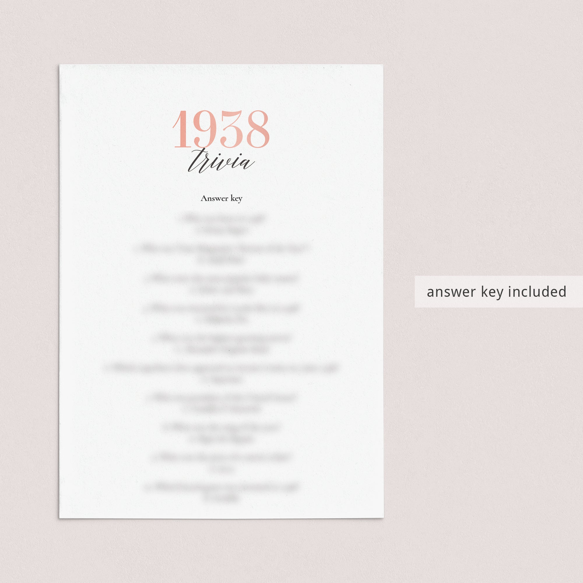 Just in case you are having trouble figuring out the answers, an answer key with the 1938 trivia answers is included.