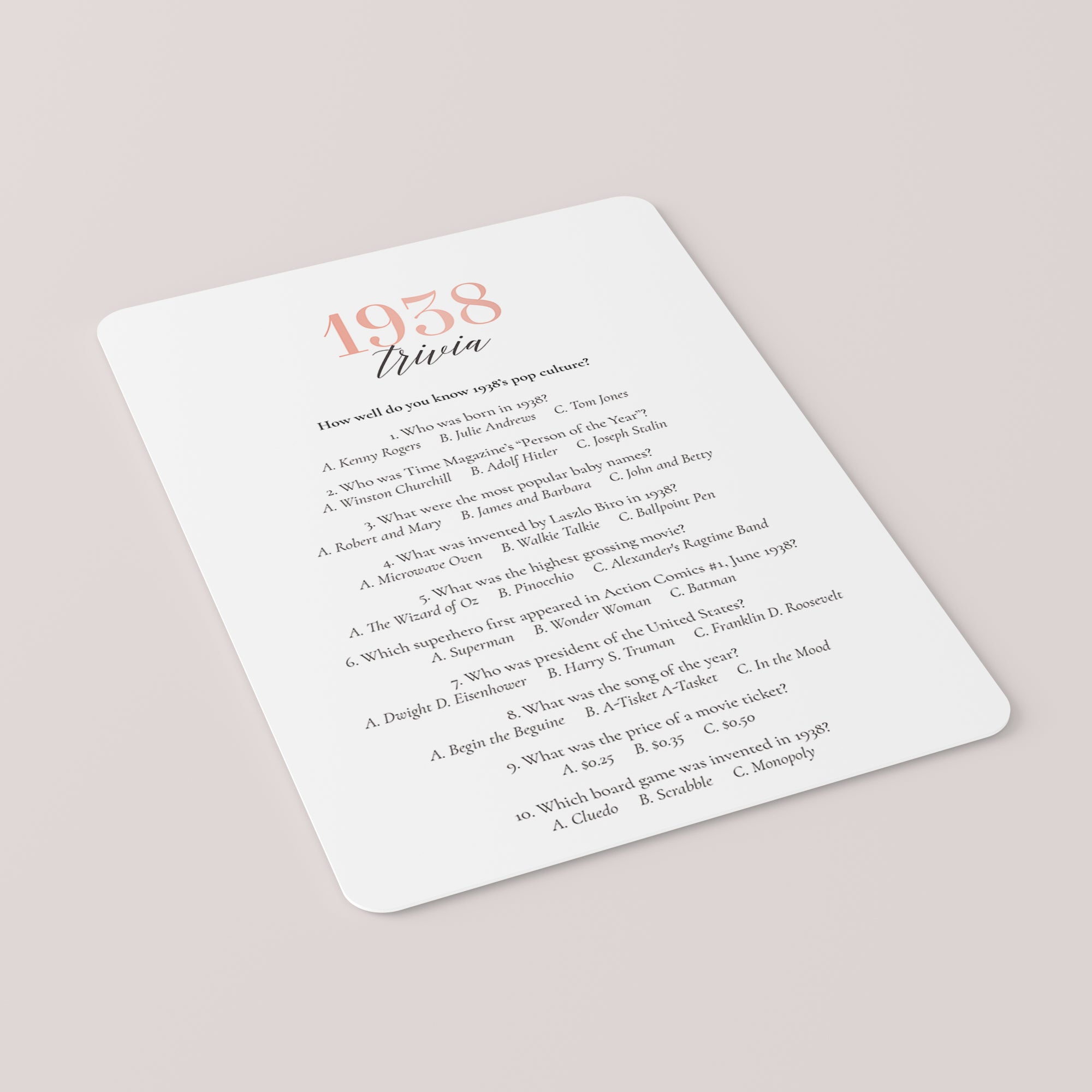 Are you looking for a fun game for a 87th birthday party? Look no further! This 1938 trivia is such a fun game to play with your friends and family. Test your guests how well they know 1938's pop culture. It's the perfect addition to a birthday party for a woman born in 1938.
