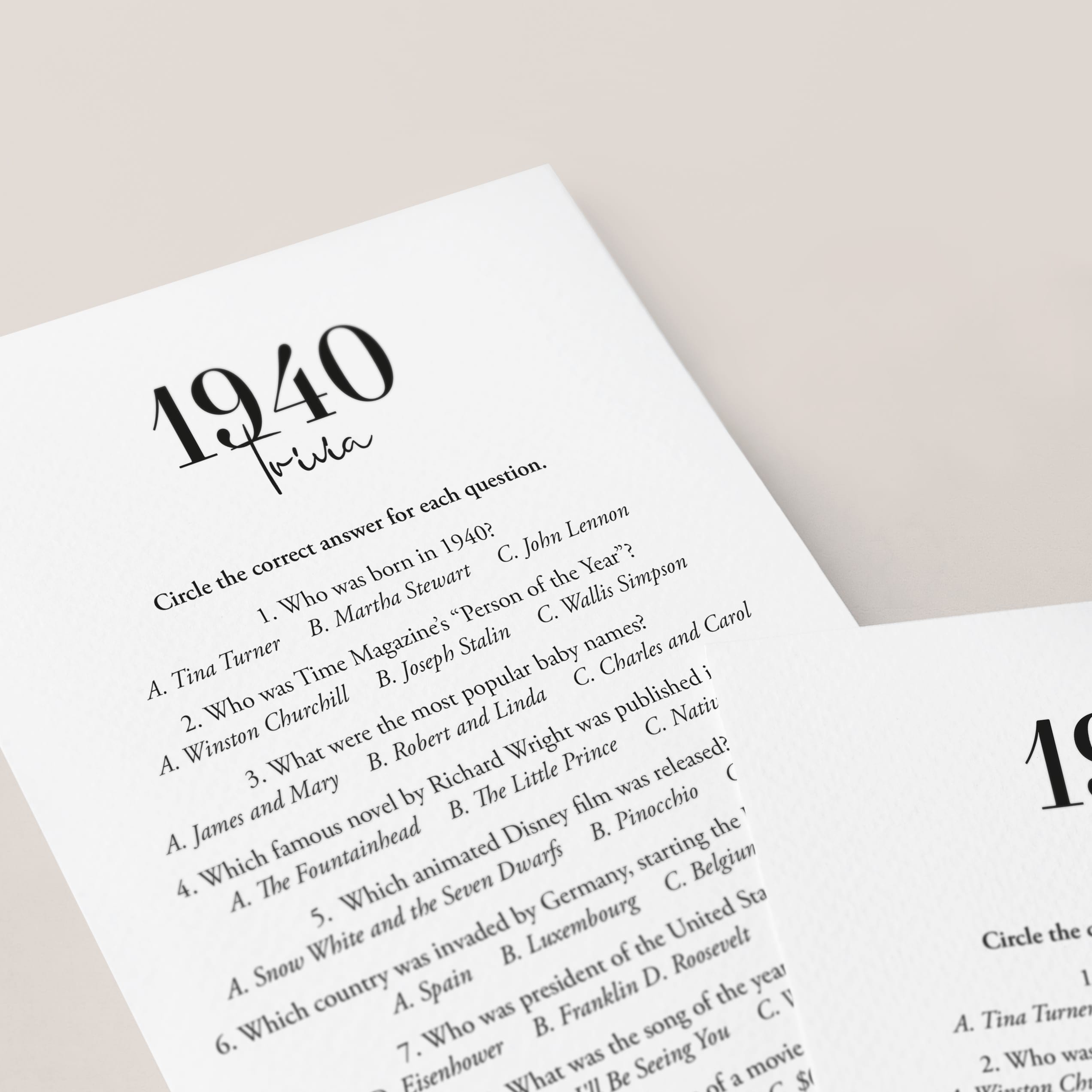 Are you looking for a fun game for a 85th birthday party? Look no further! This modern minimalist 1940 trivia with 10 multiple choice questions is such a fun game to play with your friends and family. Test your guests how well they know 1940's pop culture. It's the perfect addition to a birthday party for someone born in 1940.