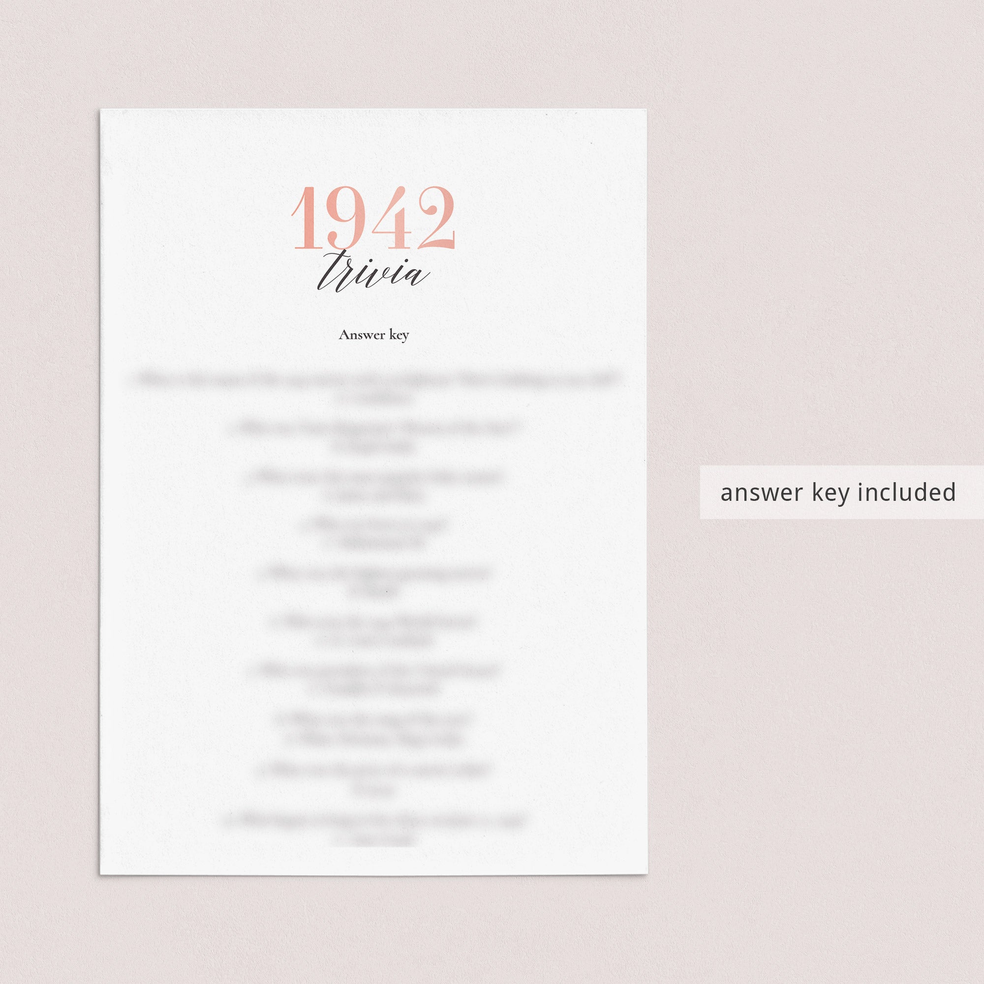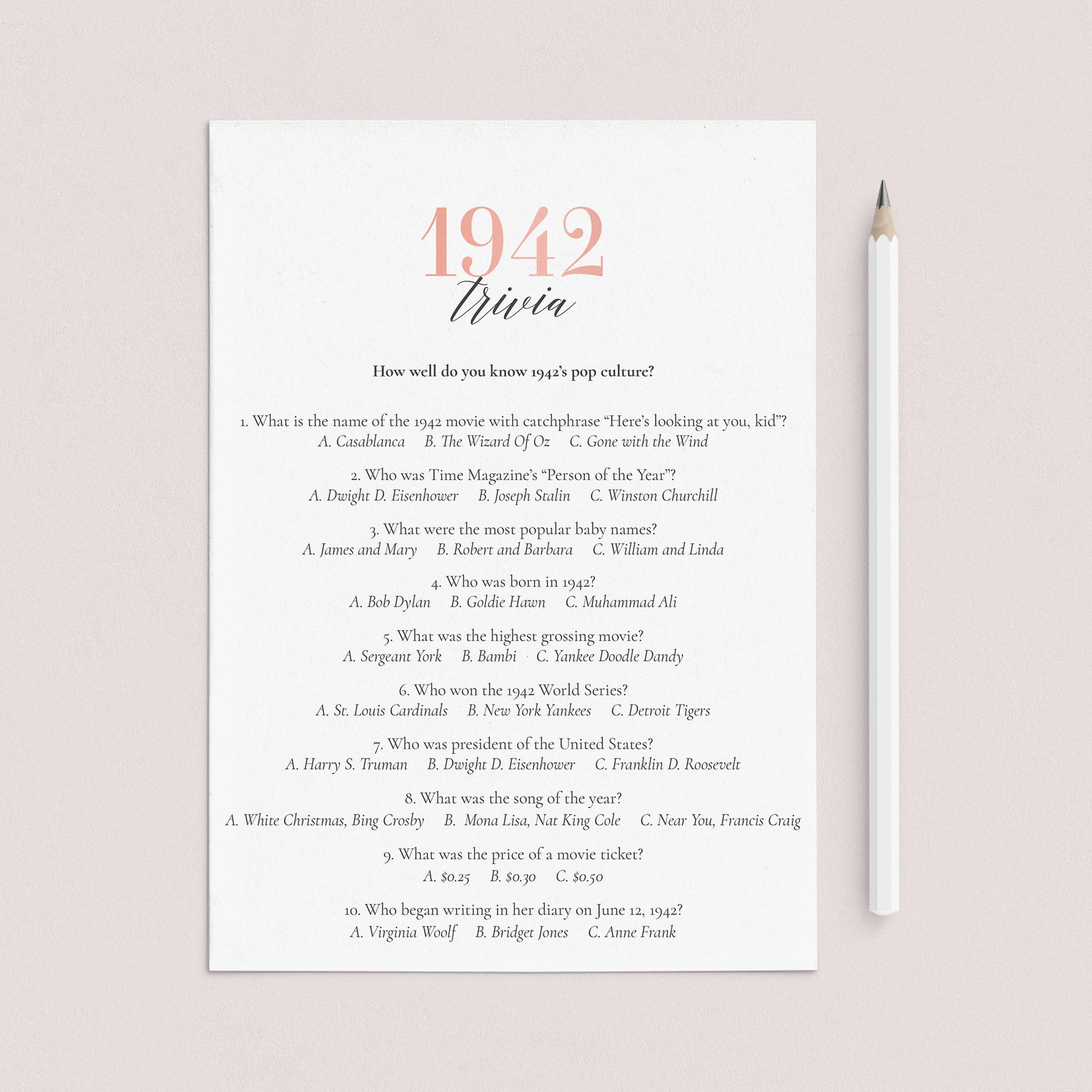 Are you looking for a fun game for a women's 83rd birthday party? Look no further! This modern blush 1942 trivia is such a fun game to play with your friends and family. Test your guests how well they know 1942's pop culture.