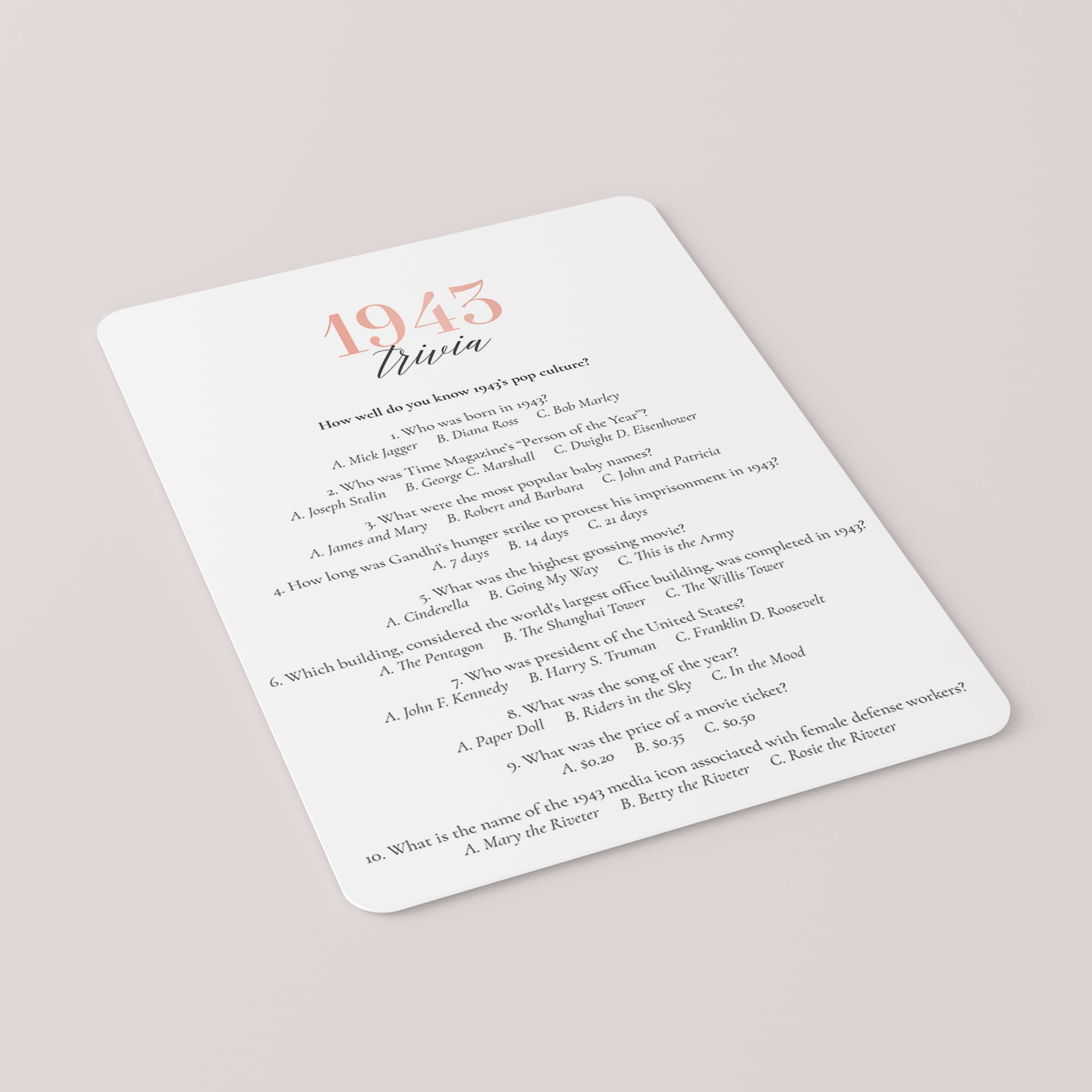 Are you looking for a fun game for a 82nd birthday party? Look no further! This 1943 trivia is such a fun game to play with your friends and family. Test your guests how well they know 1943's pop culture. It's the perfect addition to a birthday party for a woman born in 1943.