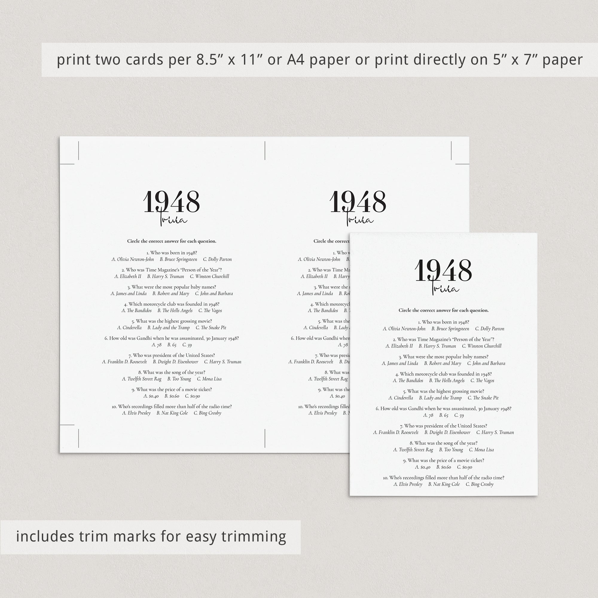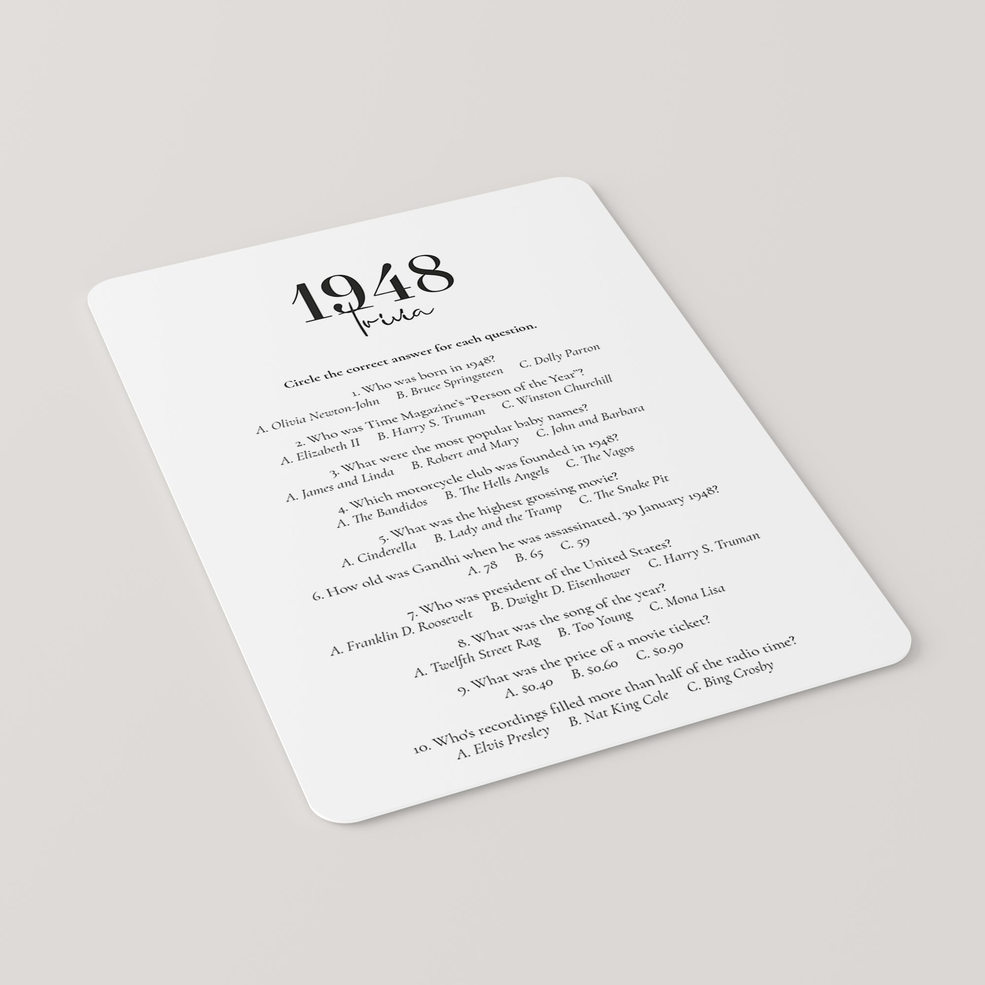 Are you looking for a fun game for a 77th birthday party? Look no further! This modern minimalist 1948 trivia with 10 multiple choice questions is such a fun game to play with your friends and family. Test your guests how well they know 1948's pop culture. It's the perfect addition to a birthday party for someone born in 1948.