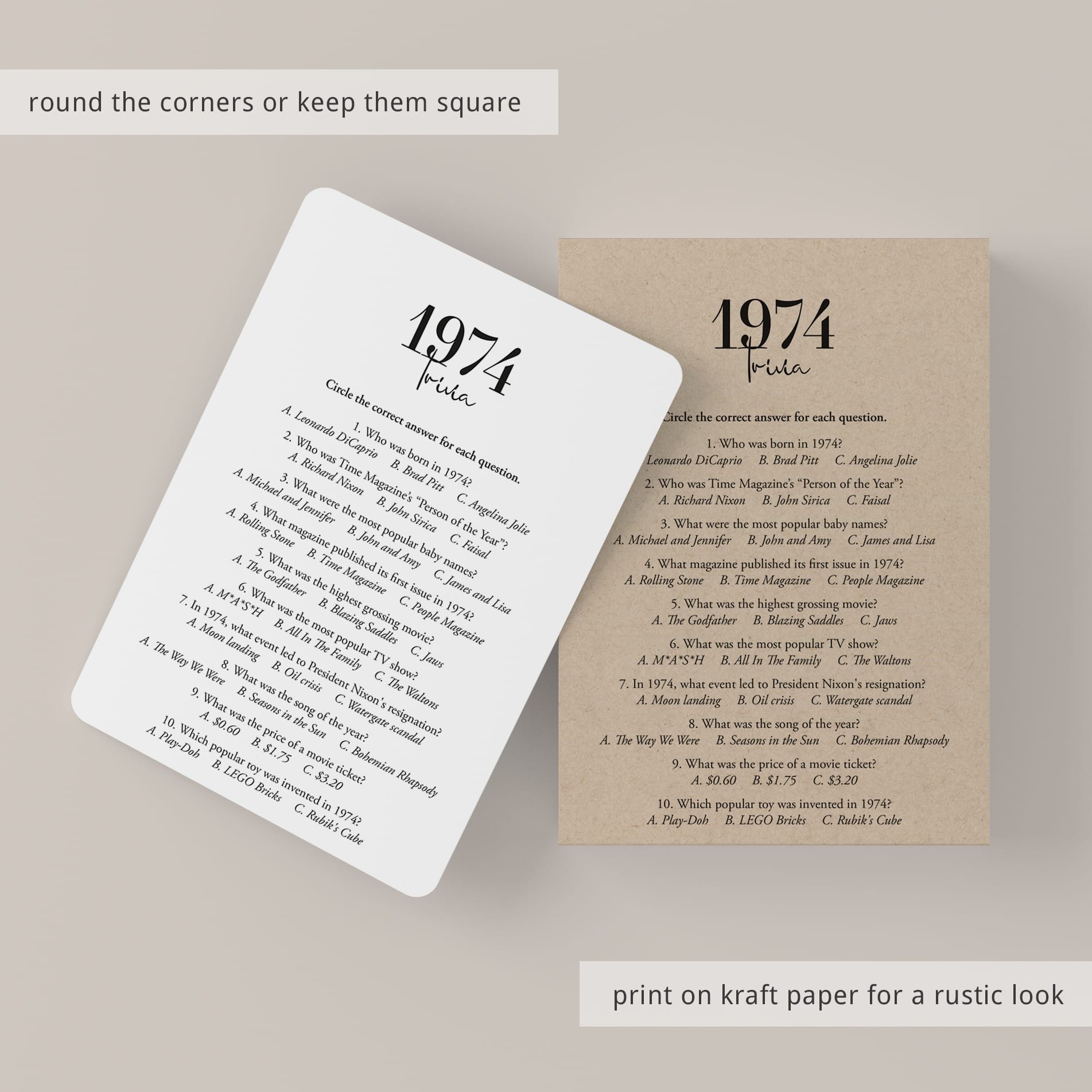 Are you looking for a fun game for a 51st birthday party or 51st anniversary? Look no further! This modern minimalist 1974 trivia with 10 multiple choice questions is such a fun game to play with your friends and family. Test your guests how well they know 1974's pop culture. It's the perfect addition to a birthday party for someone born in 1974 or to an anniversary party for a couple married in 1974.