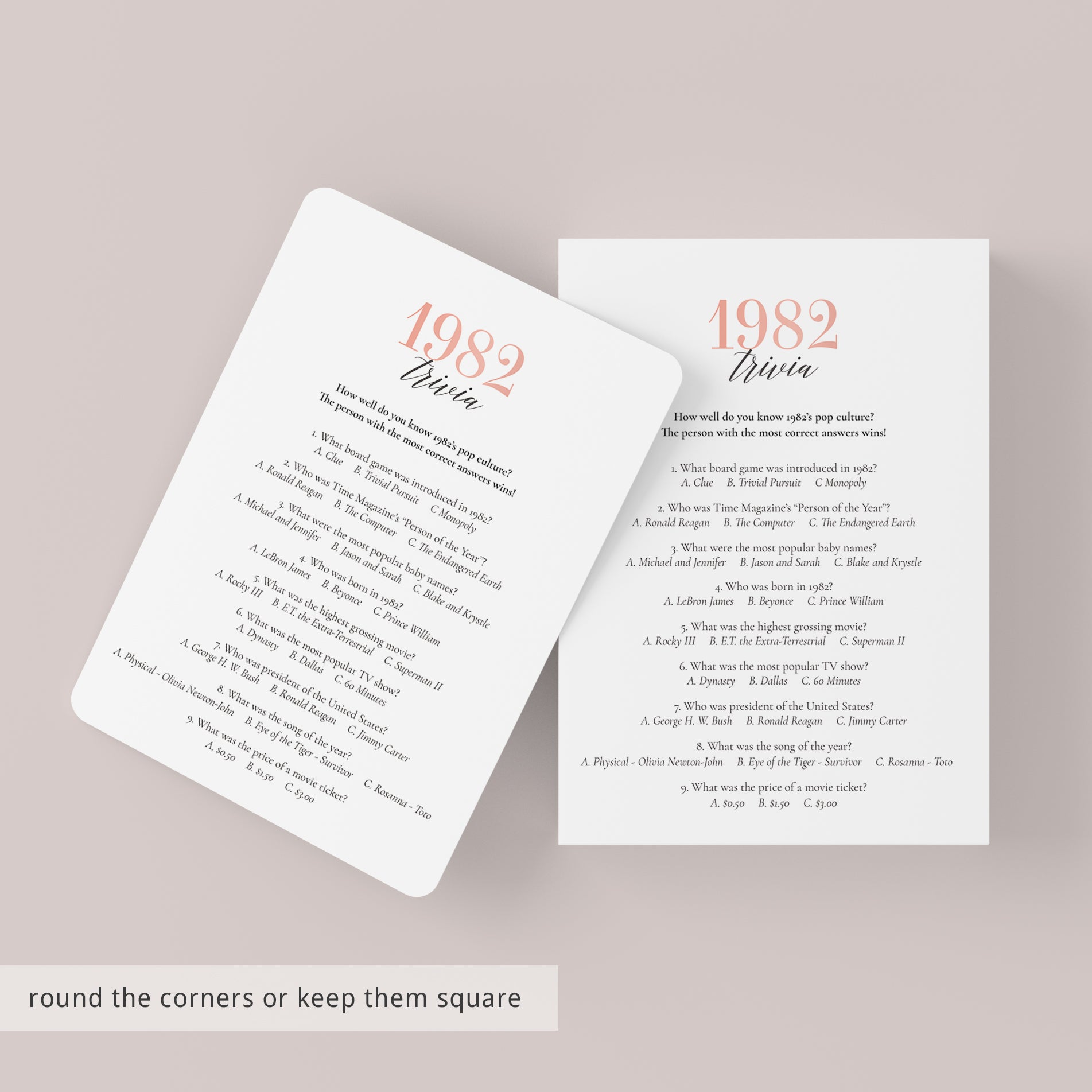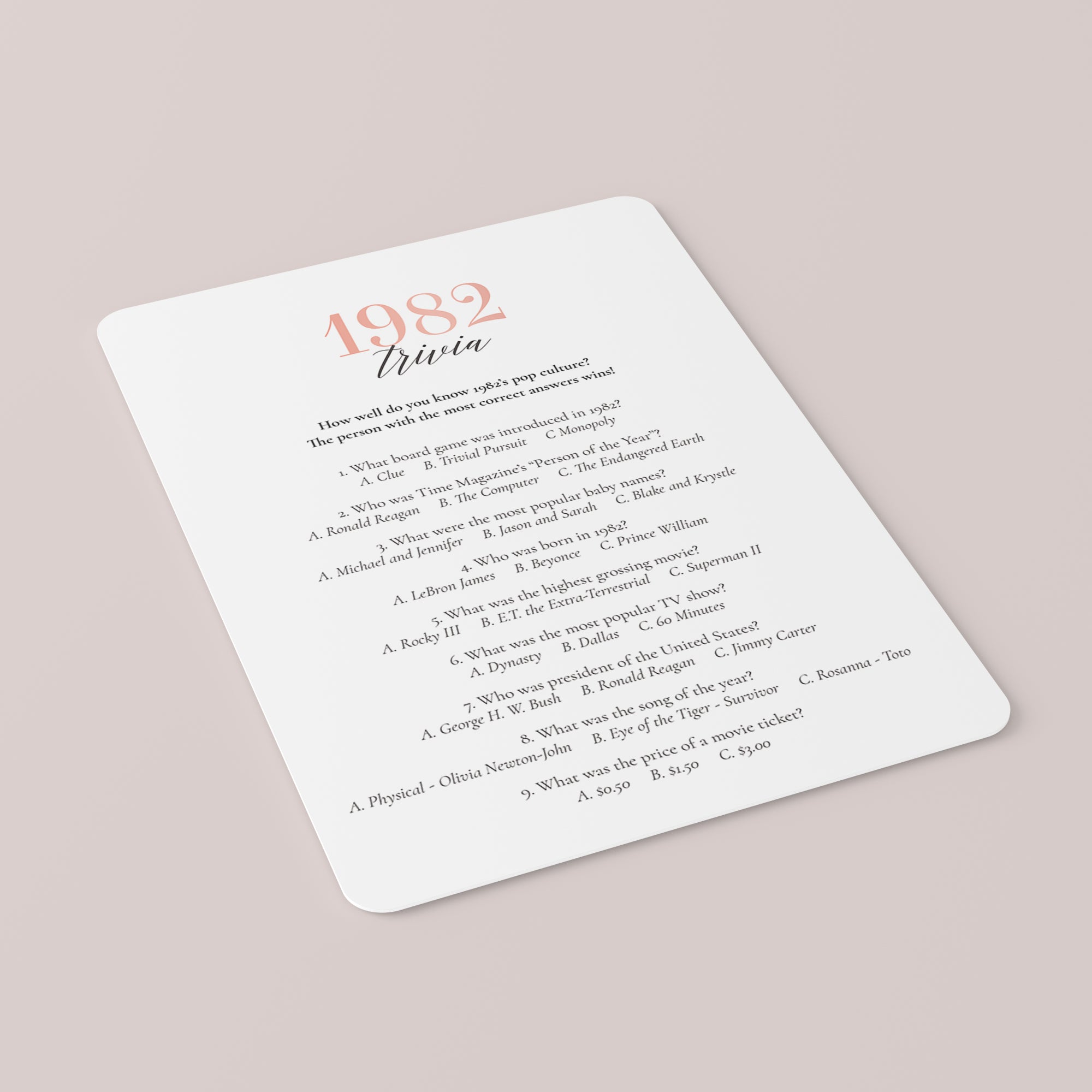 Are you looking for a fun game for a 43rd anniversary or 43rd birthday party? Look no further! This 1982 trivia game is such a fun game to play with your friends and family. Test your guests how well they know 1982's pop culture.