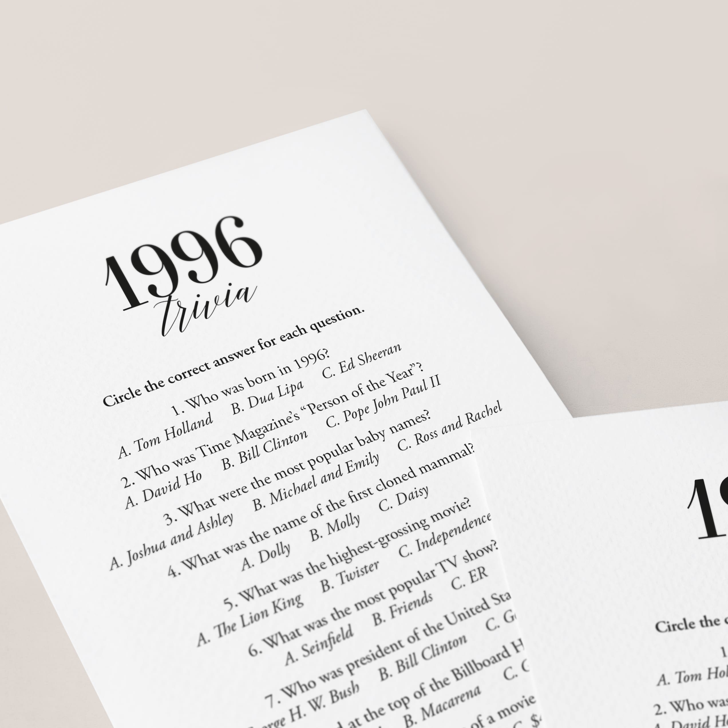 Are you looking for a fun game for a 30th birthday party or 30th anniversary? Look no further! This modern minimalist 1996 trivia is such a fun game to play with your friends and family. Test your guests how well they know 1996's pop culture. It's the perfect addition to a birthday party for someone born in 1996 or to an anniversary party for a couple married in 1996.