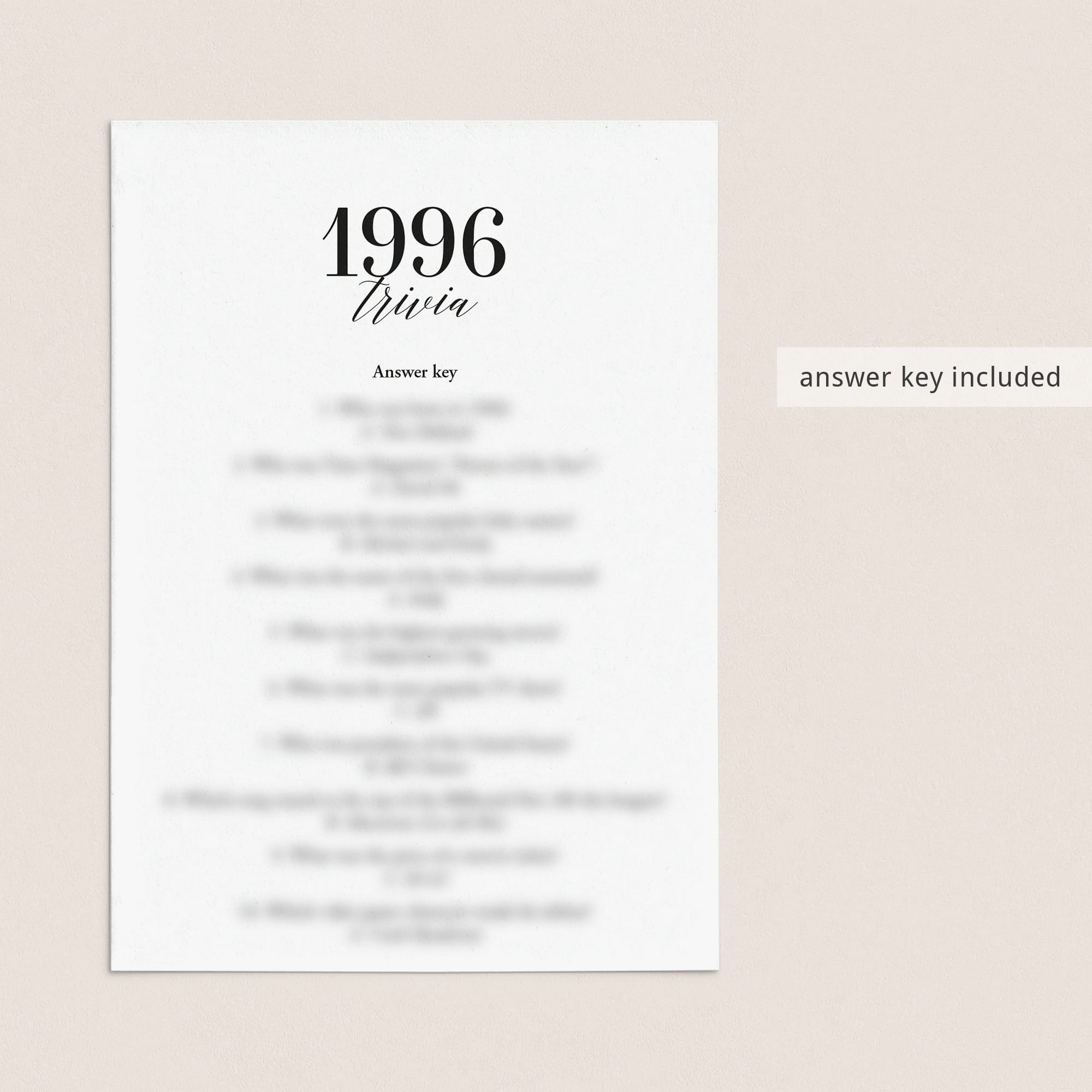 Just in case you are having trouble figuring out the answers, an answer key with the 1996 trivia answers is included.