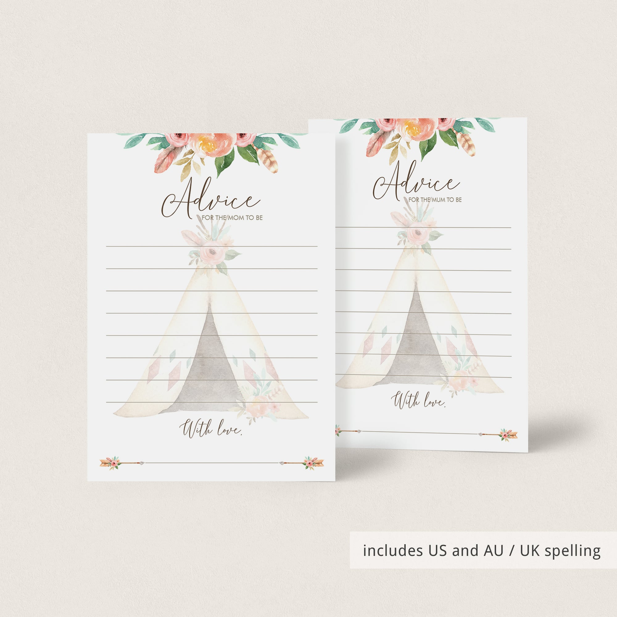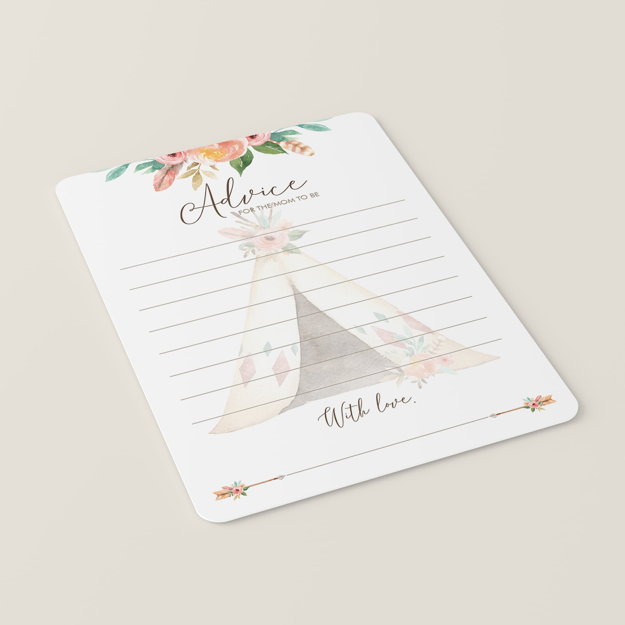 Create a meaningful keepsake for the new mom with these tribal baby shower advice cards with watercolor flowers and tipi. Let every guest write down their advice and collect the floral cards for the lucky mom-to-be. The cards are perfect for a boho themed baby shower.
