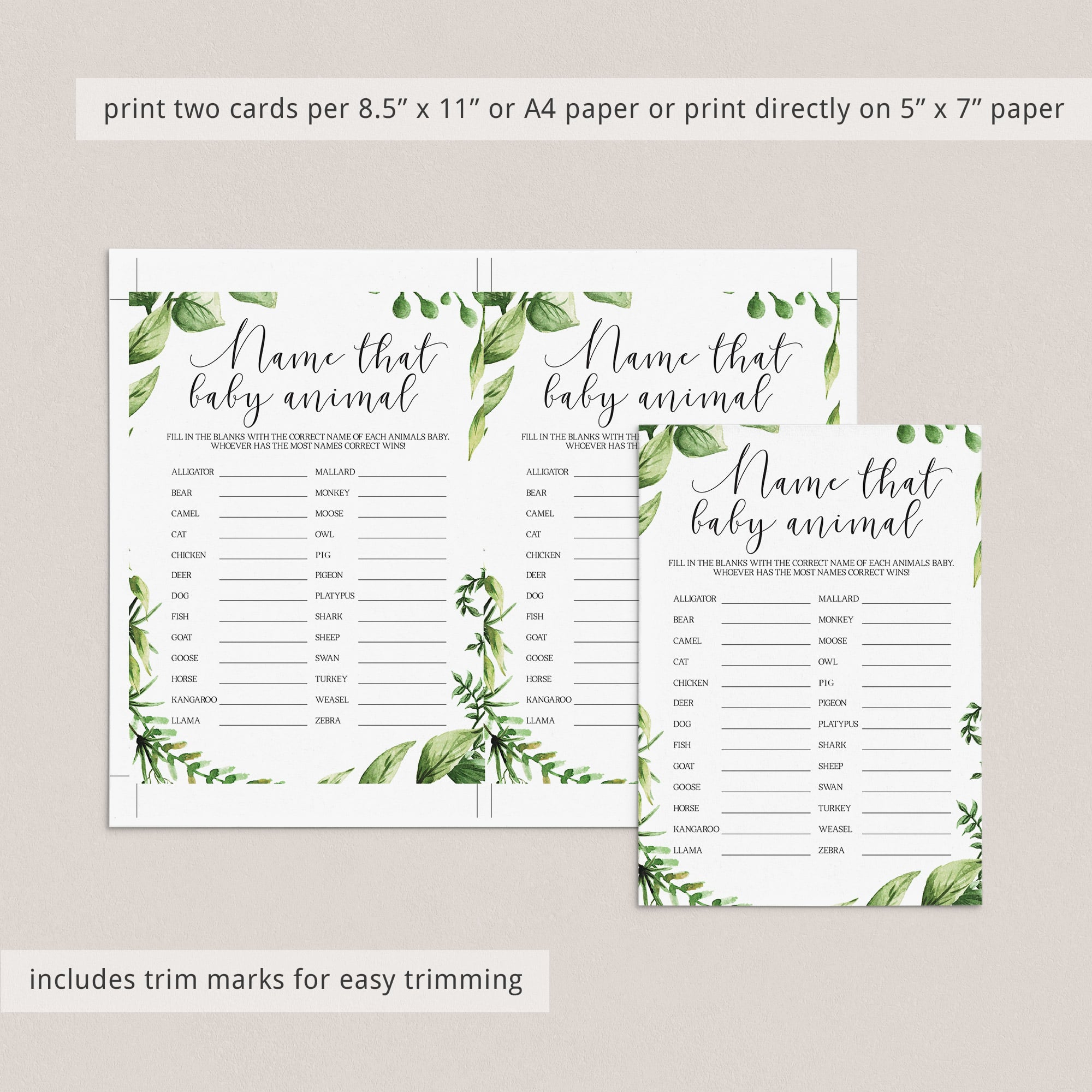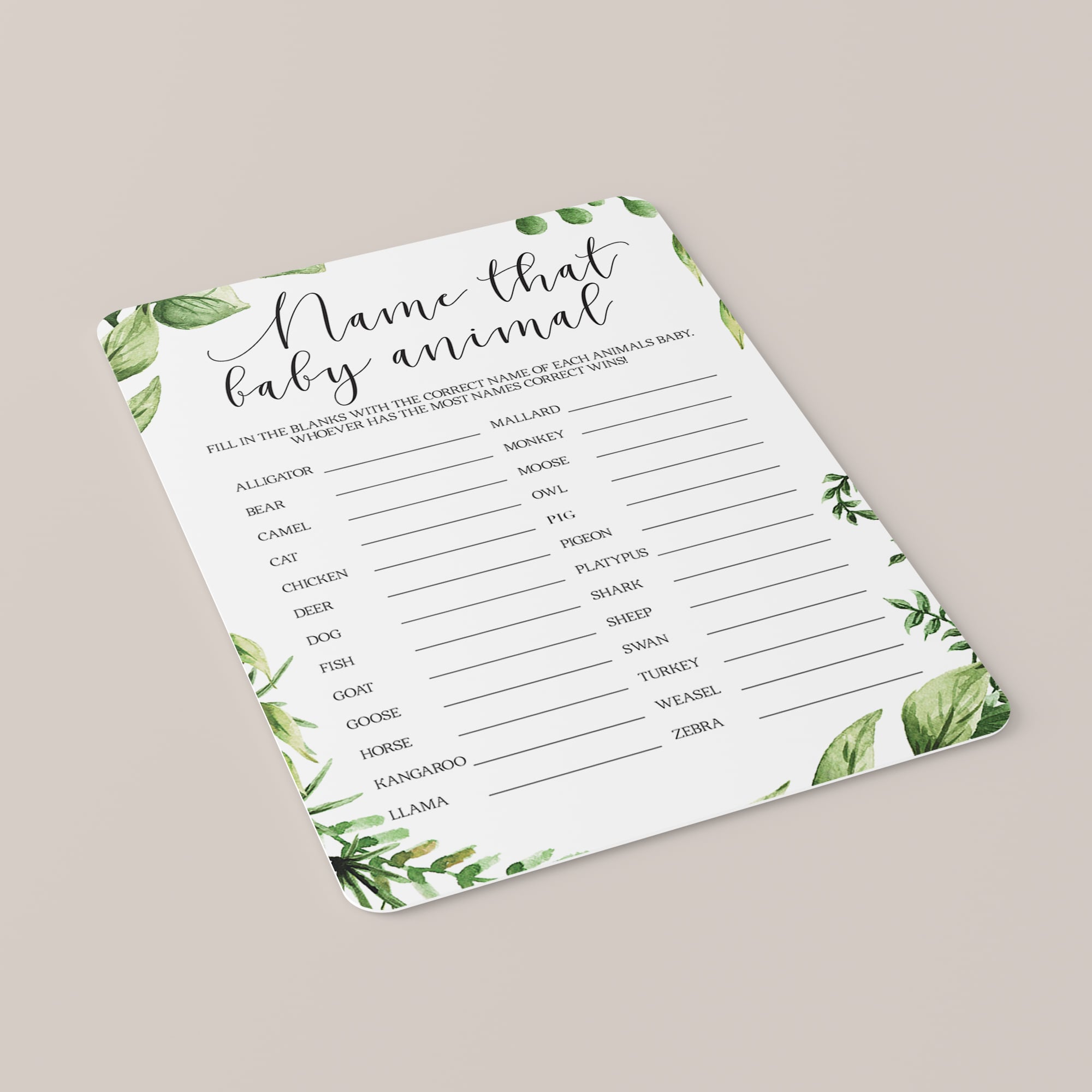 This greenery baby shower Name That Baby Animal game has a list of 26 animals and a space for your guests to write on. Ask your guests to write the proper name for the animal’s baby opposite the animal name. Whoever has the most names correct wins.
