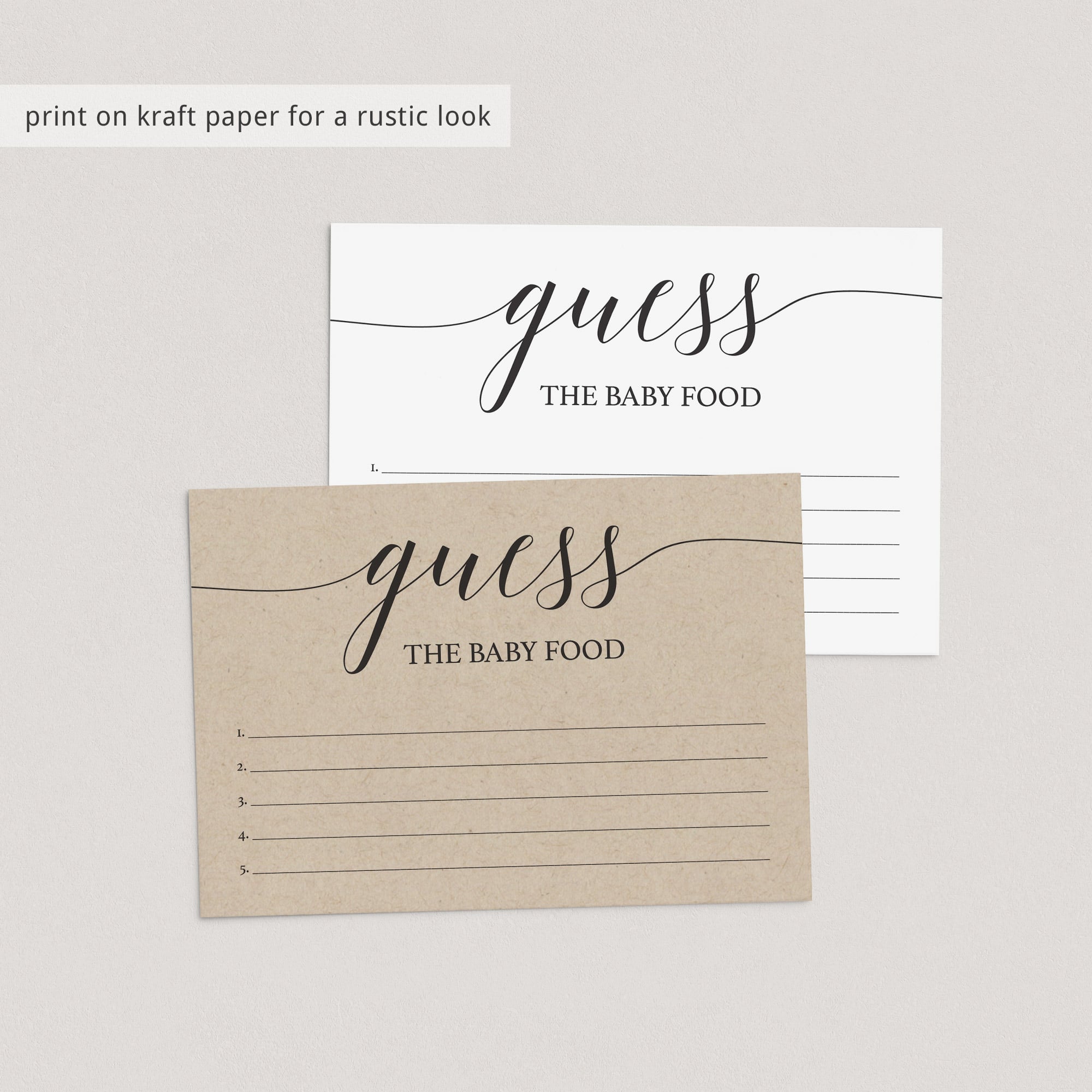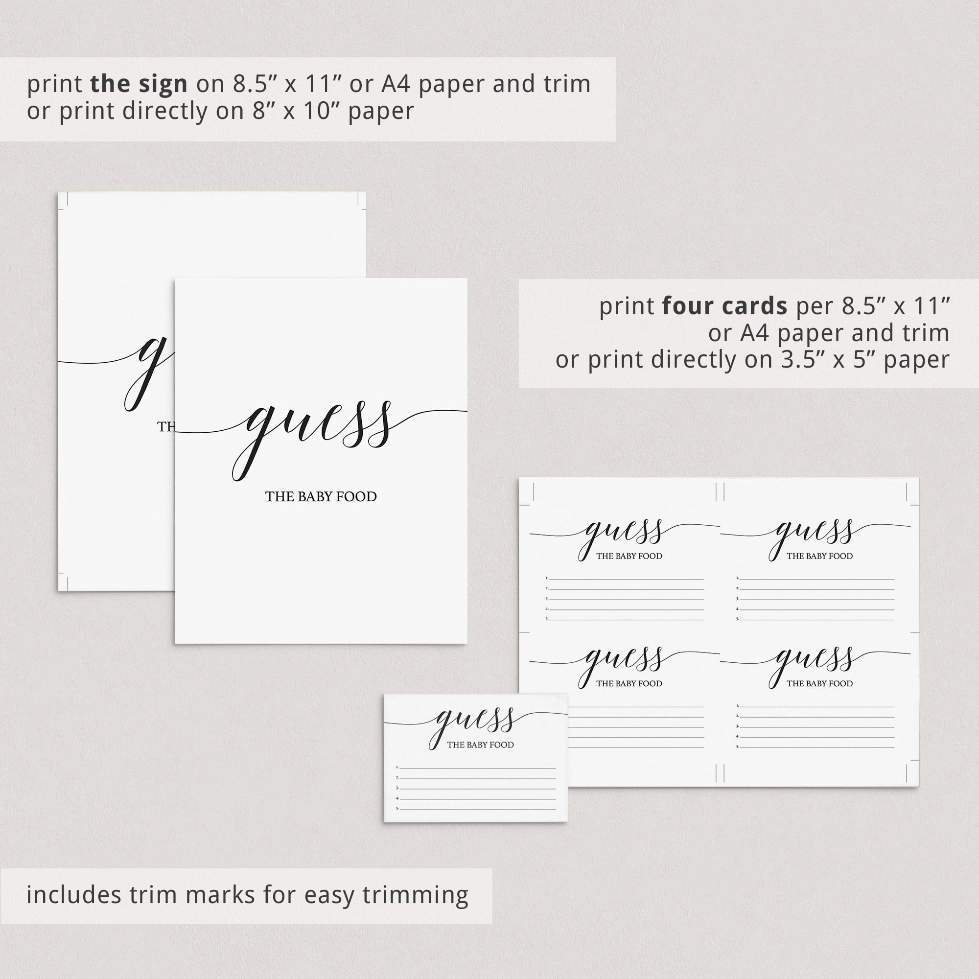 The Guess The Baby Food sign and cards have been designed in black and white. You can print on kraft paper to create a rustic look or print on colored cardstock for beautiful results. A detailed instruction guide with tips & tricks on editing, trimming, paper choices and more is included.