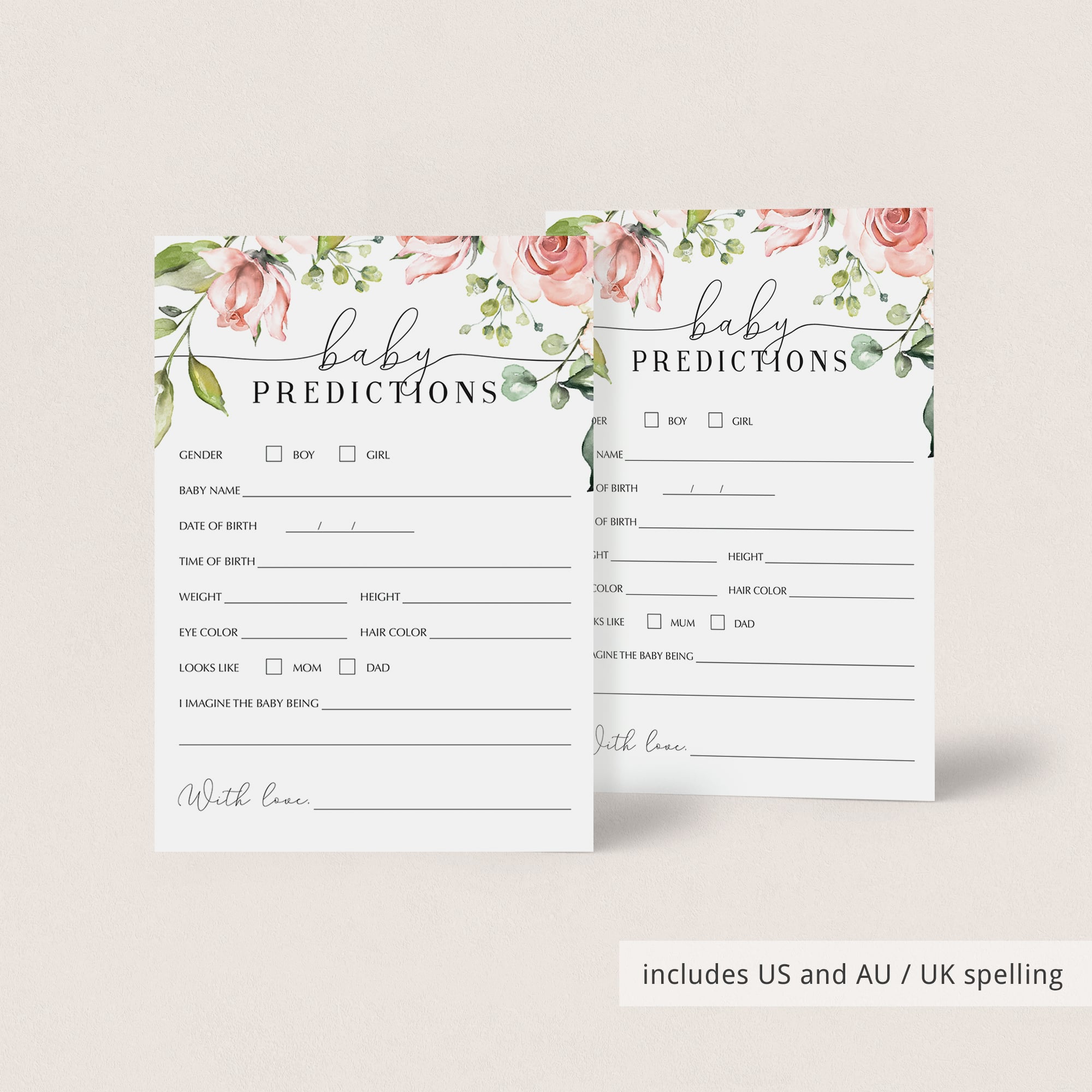 Baby Predictions card with and without baby gender prediction, in US English and AU / UK English, each: