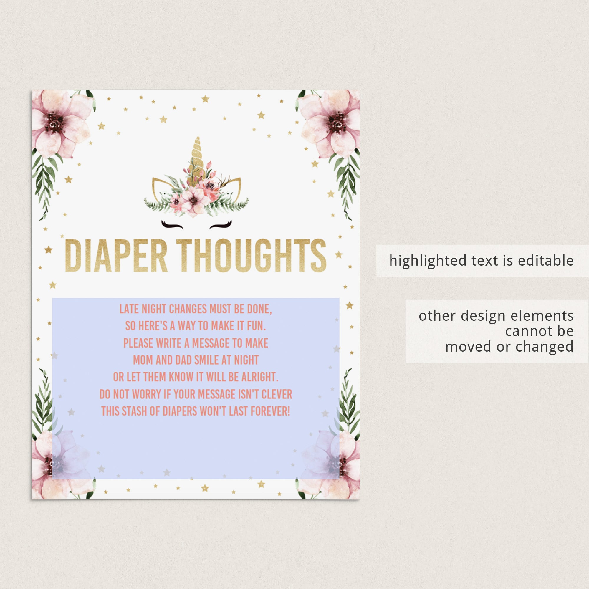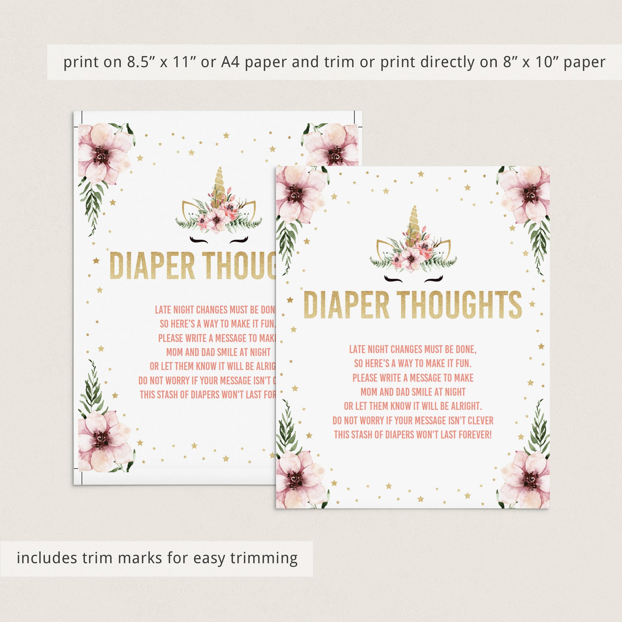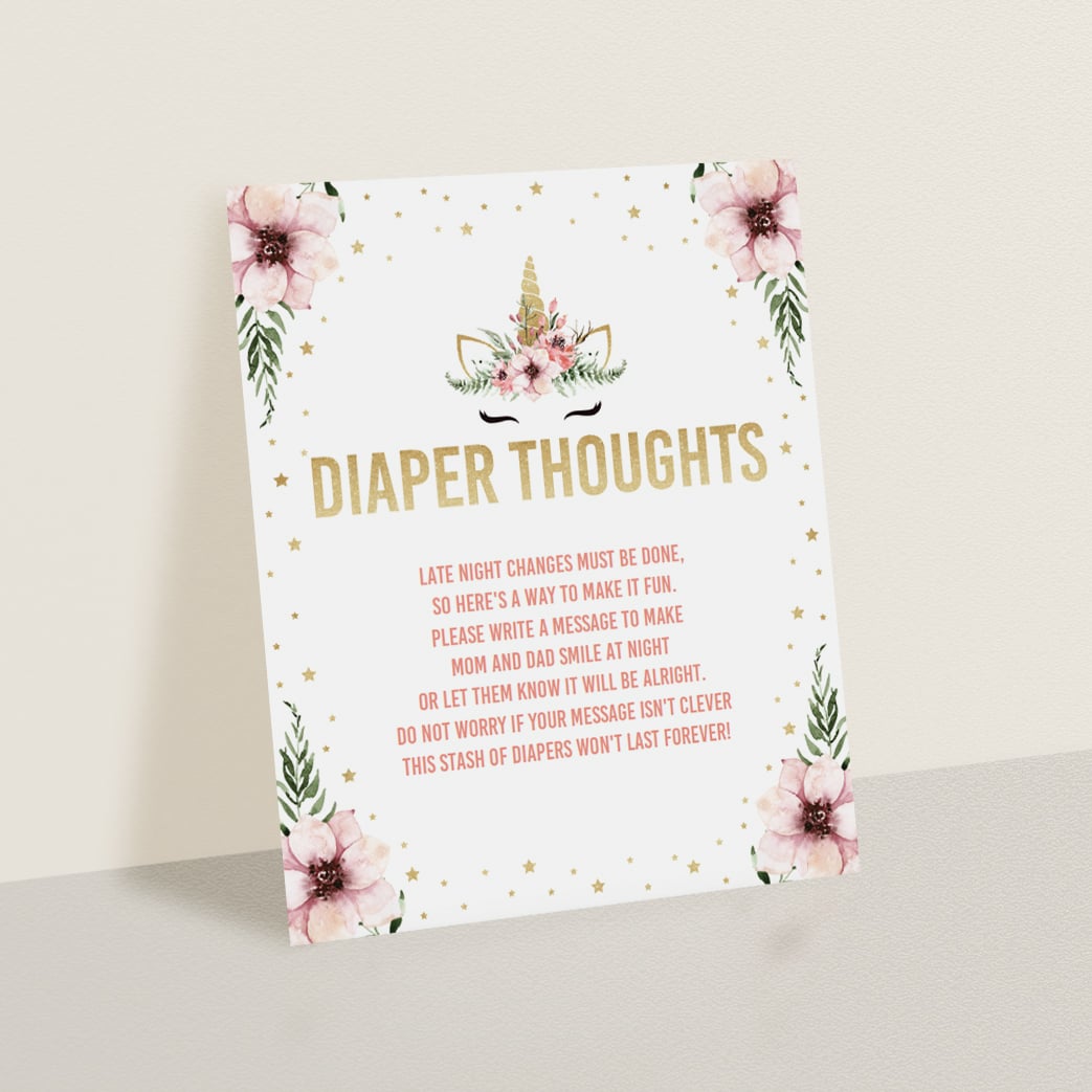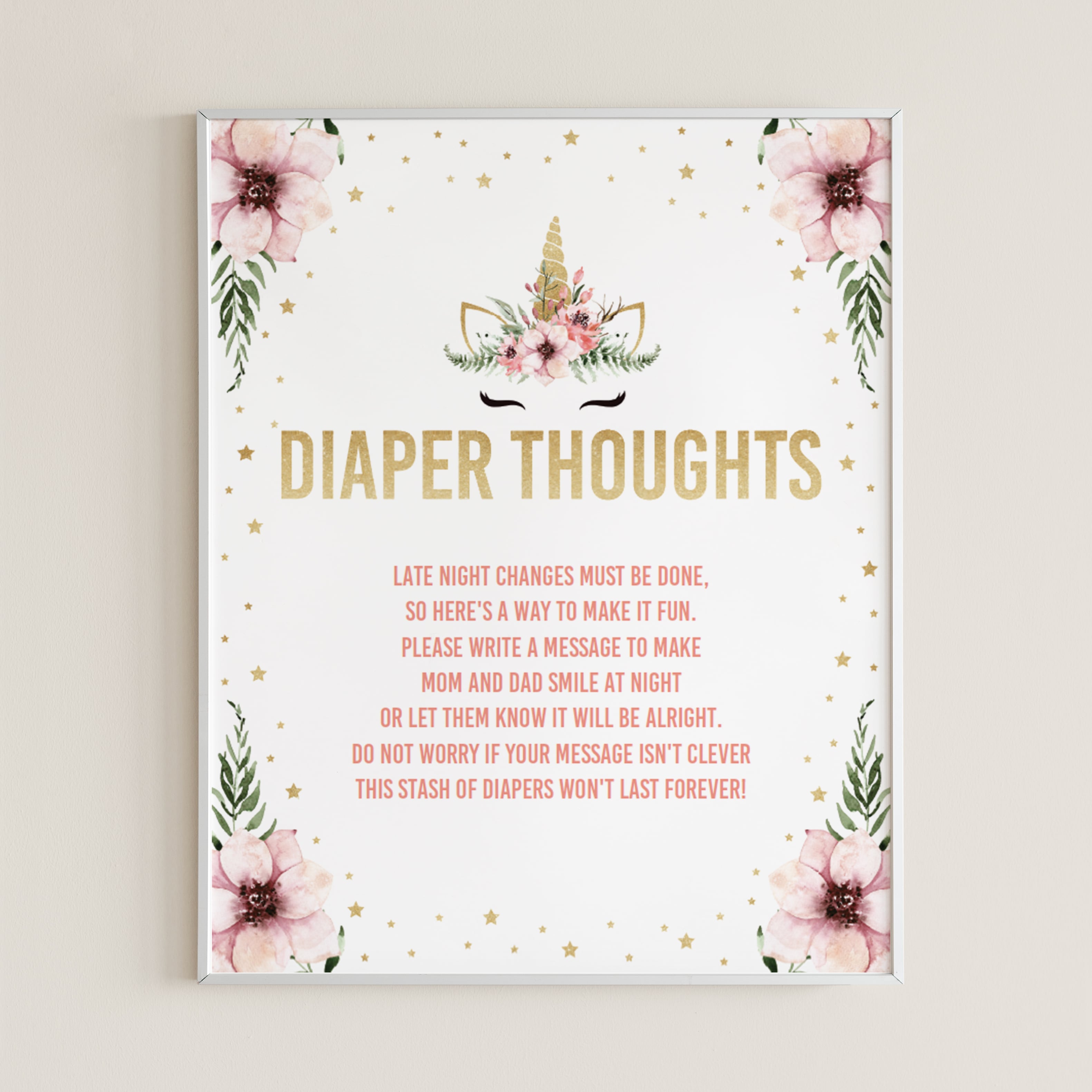 Are you looking for a funny baby shower activity? Set up a Diaper Thoughts station with this baby shower diaper thoughts sign template with floral unicorn. Guaranteed to be a huge hit at any girl baby shower!