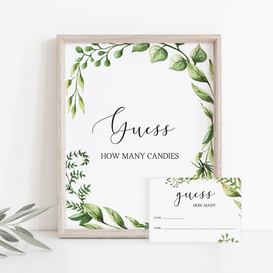 Kick off the fun and get your guests involved with this package of greenery themed baby shower guessing games. The printable signs and matching guessing cards with watercolor green leaves are perfect for a green themed baby shower.