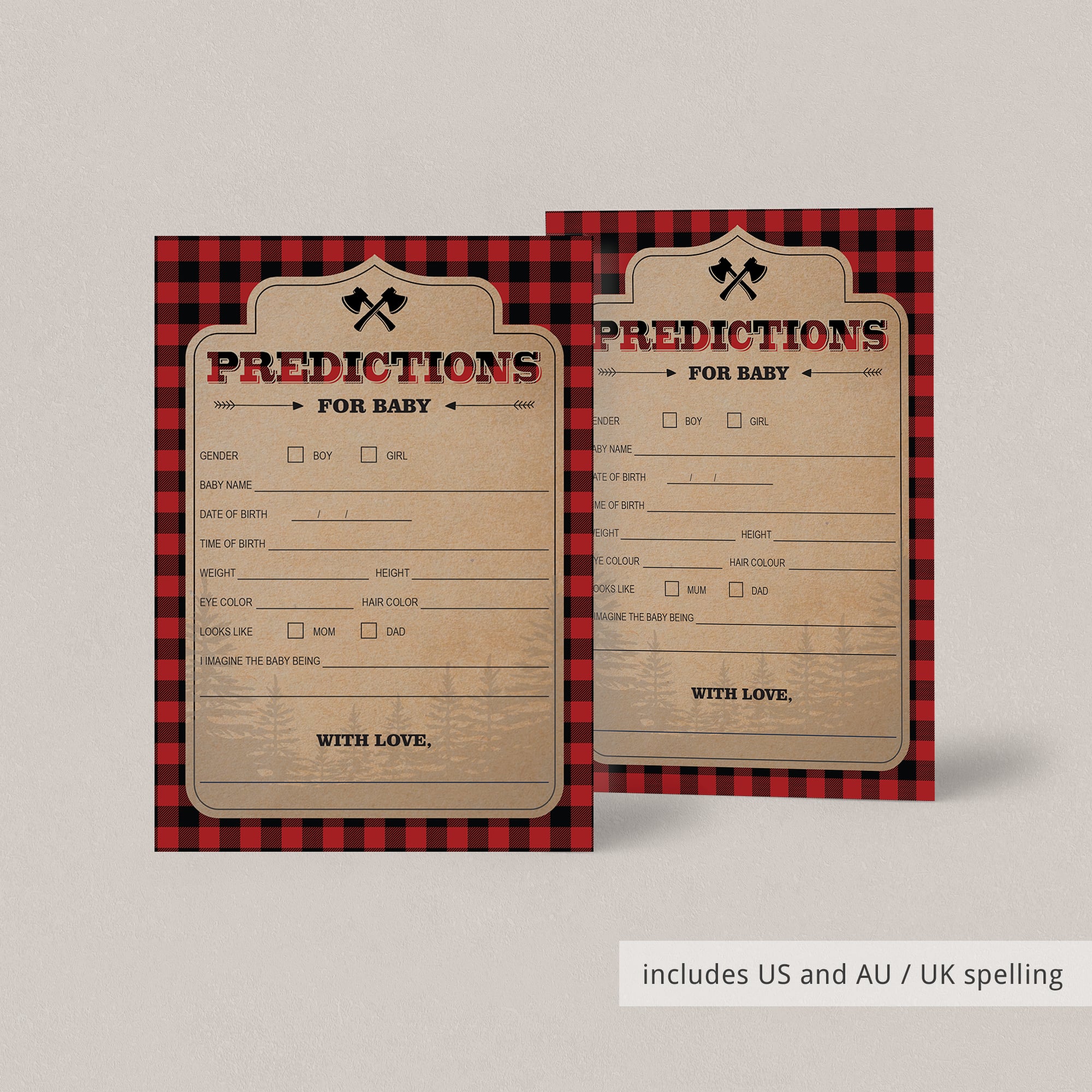 Let your guests make their best predictions at all the baby's birth stats and WOW everyone with your unique lumberjack baby shower prediction cards!