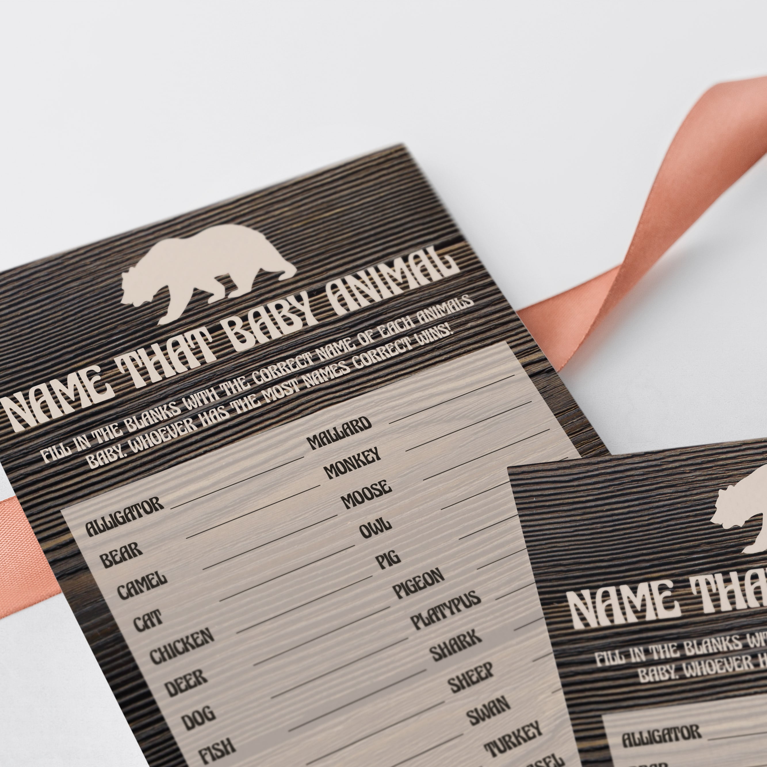 This rustic baby shower Name That Baby Animal game with little brown bear has a list of 26 animals and a space for your guests to write on. Ask your guests to write the proper name for the animal’s baby opposite the animal name.