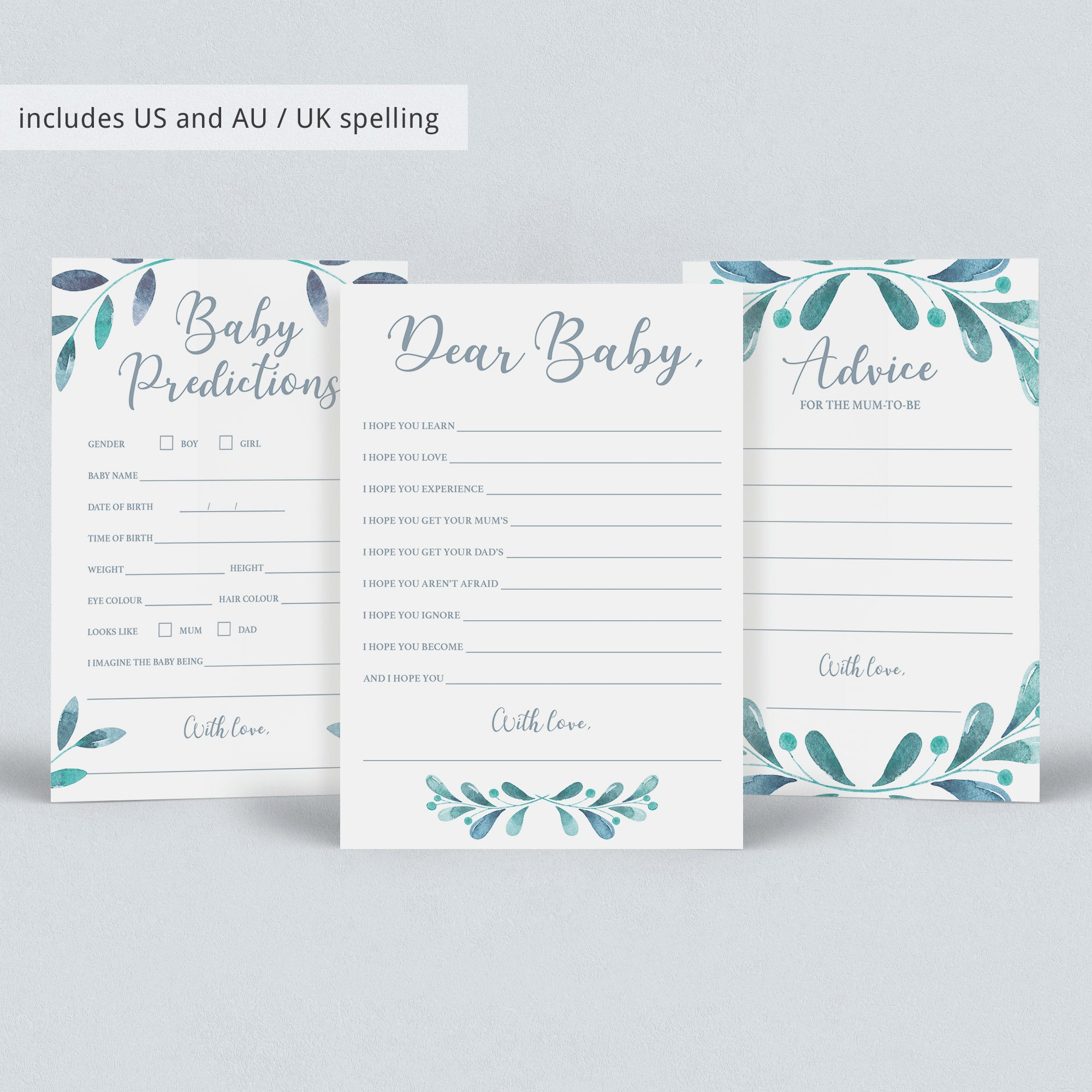 Advice card for the mom-to-be and for the parents-to-be, Baby Predictions card with and without baby gender prediction, Baby Wishes card, all in US English and AU / UK English, each: