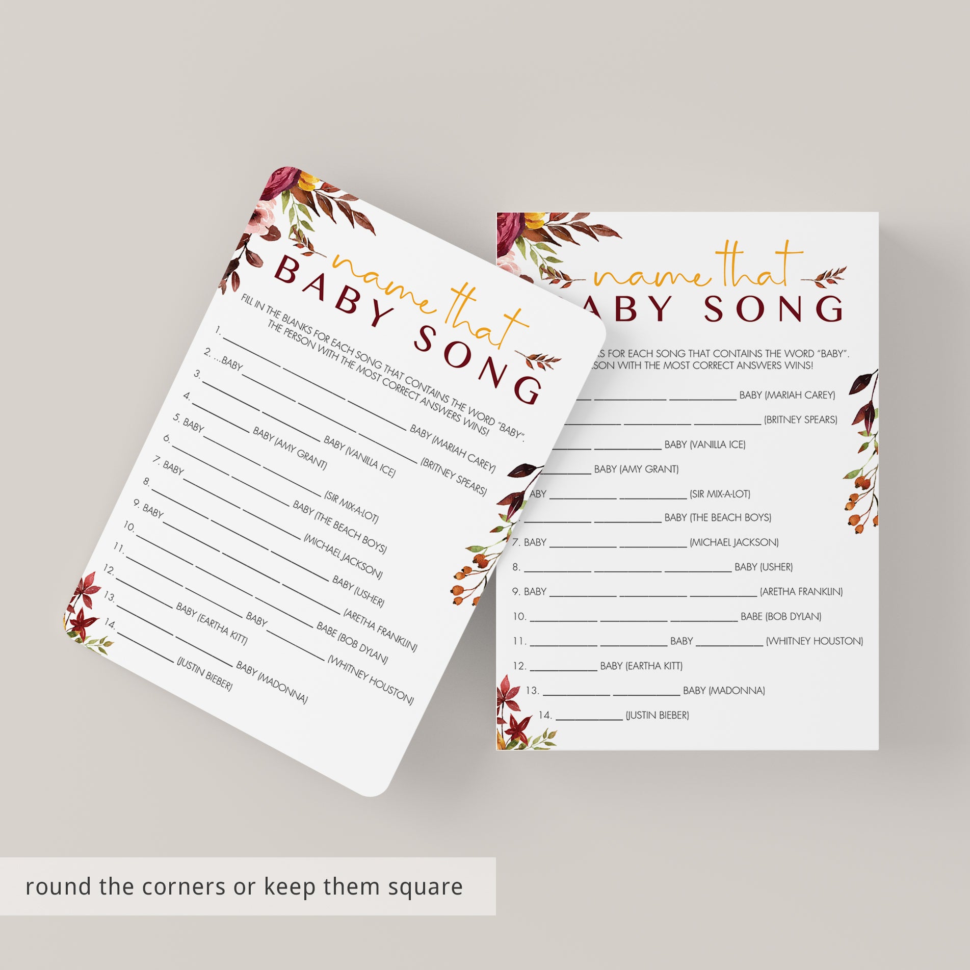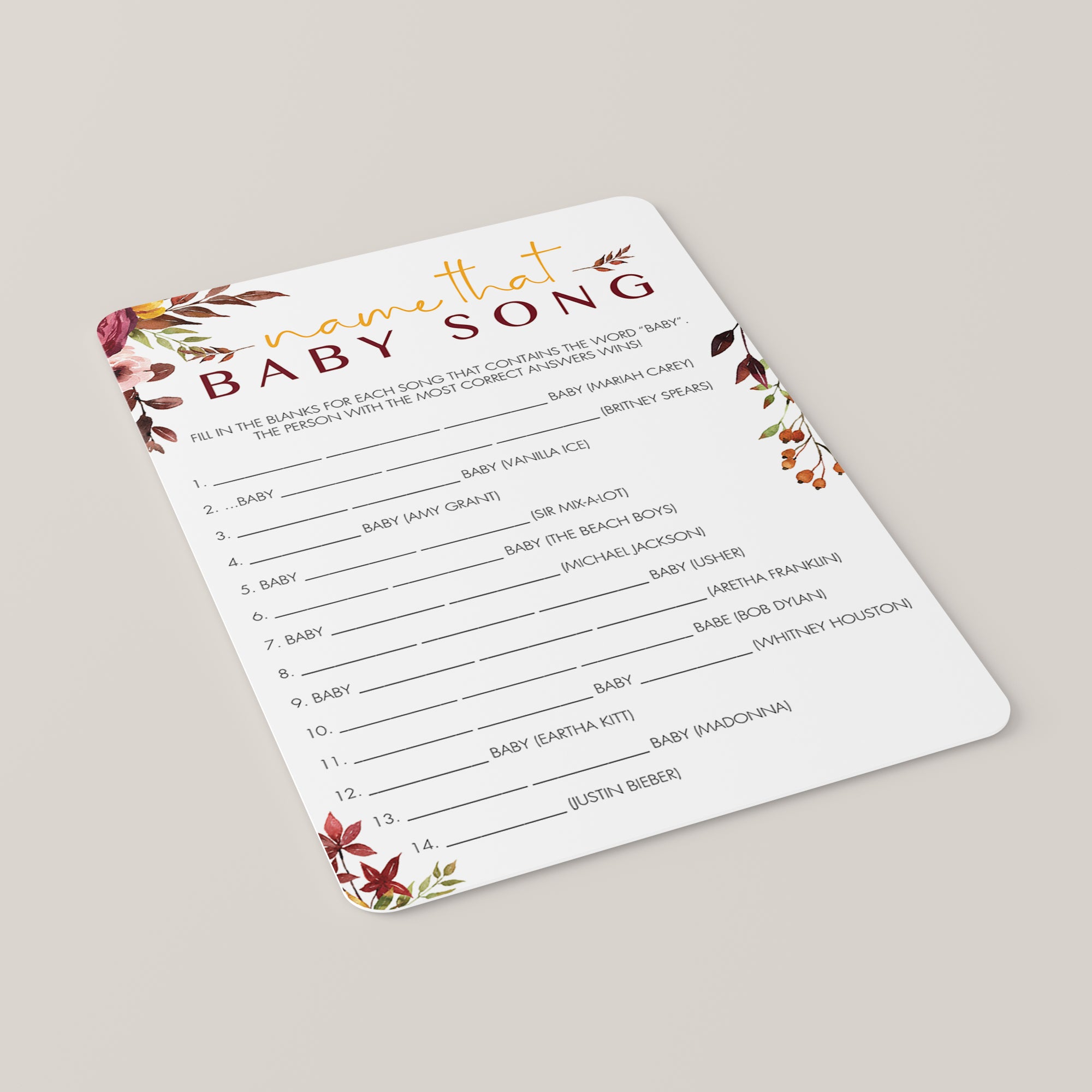 Print and distribute the boho chic game cards among your baby shower guests along with a pen. Have them fill in the blanks with the song title. They all have the word "Baby" in it.