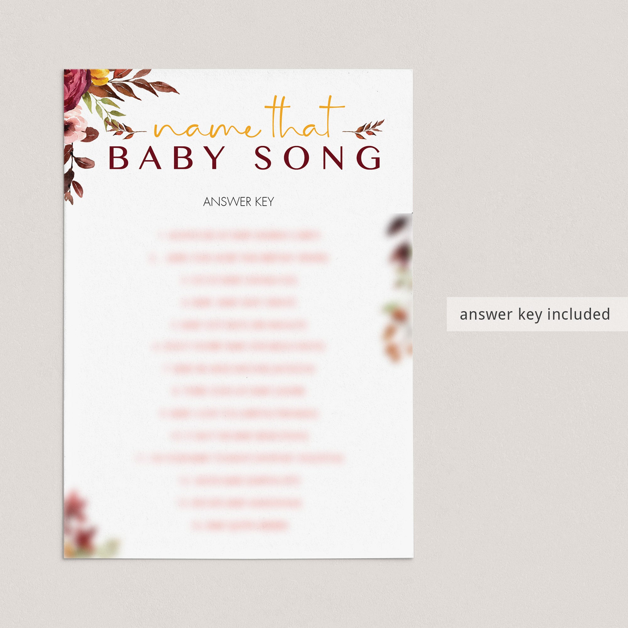 Then let your babyshower guests have fun with this boho chic babyshower game Name That Baby Song. With its burgundy floral arrangements, this game is the perfect addition to your bohemian themed baby shower.