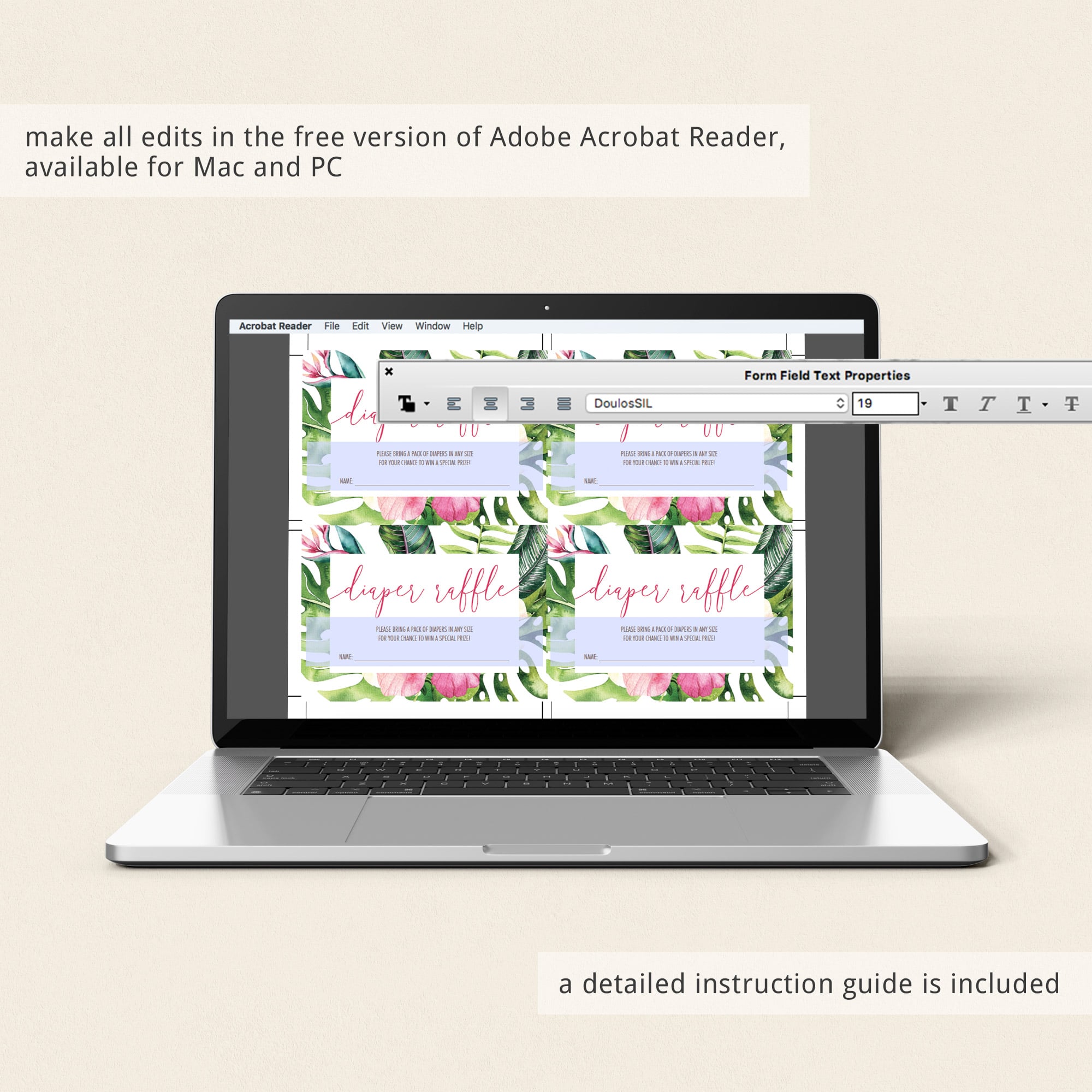 Print the botanical diaper raffle tickets right from your computer in a matter of minutes. Or have them printed at your favorite print shop.