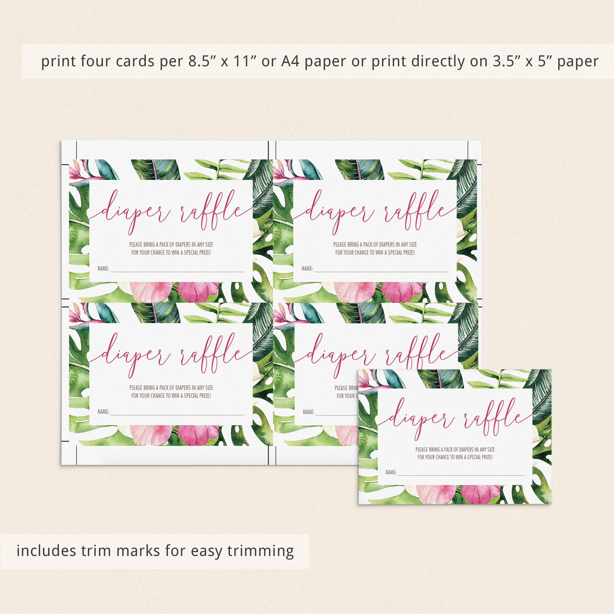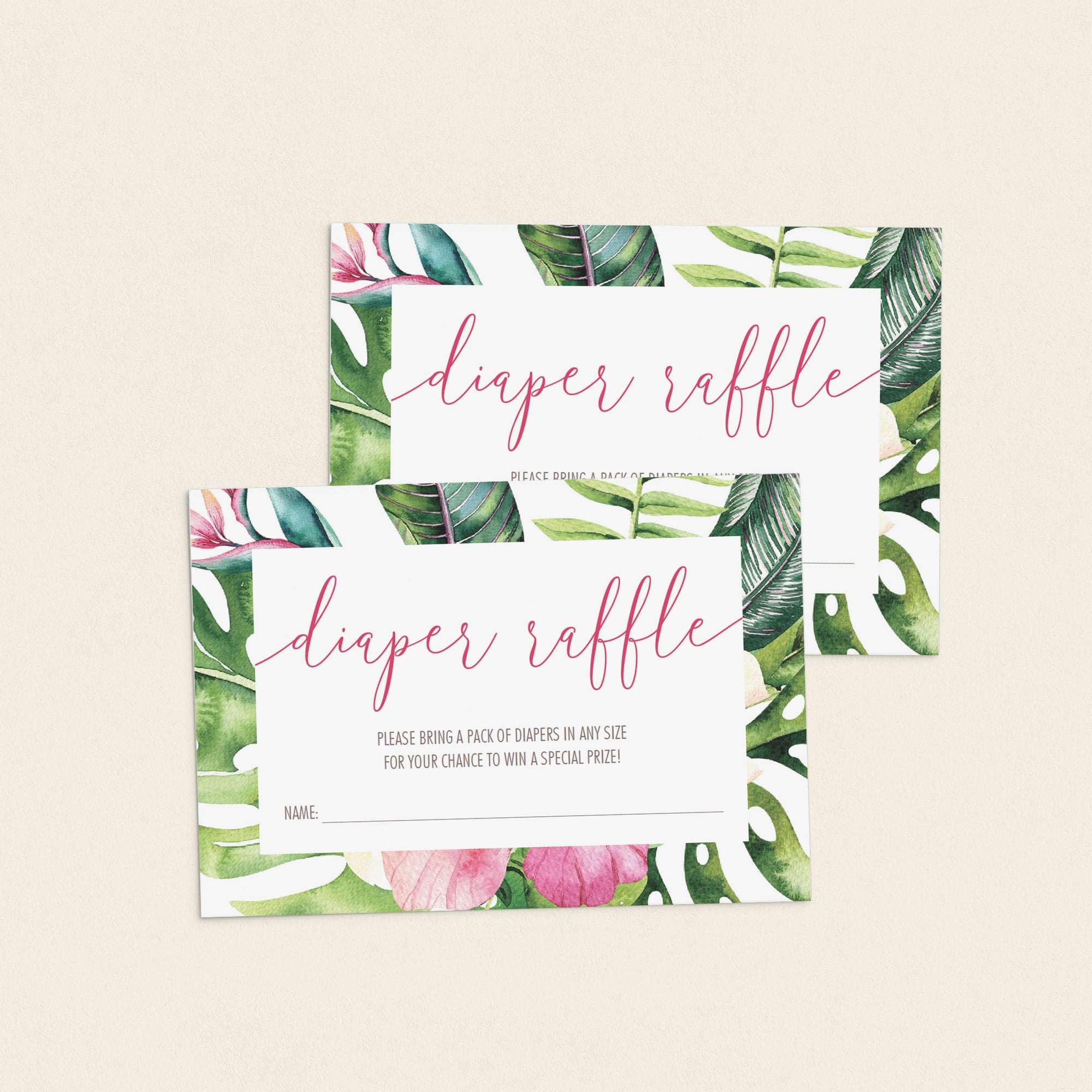 Who doesn't love a diaper raffle during a baby shower? Use this botanical Diaper Raffle ticket to let your guests know they can win a great prize by bringing a pack of diapers. With it's green leaves and pink flowers, these cards are perfect for a tropical baby shower to welcome a baby girl. Include the diaper raffle tickets in your baby shower invitations before sending them out.