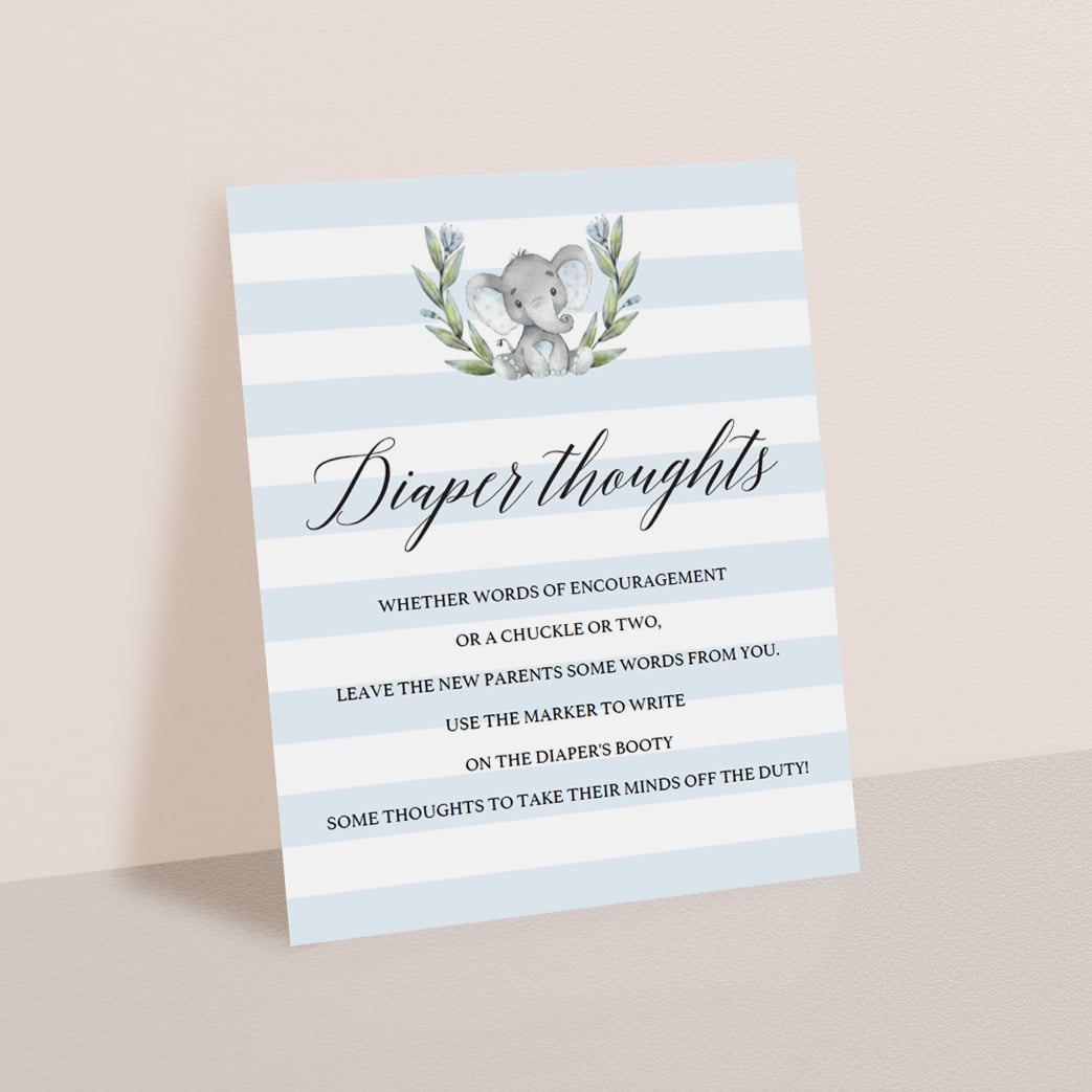 Are you looking for a creative and fun baby shower activity? Set up a Diaper Thoughts station with this boy baby shower Diaper Thoughts game sign with watercolor elephant. Guaranteed to be a huge hit!