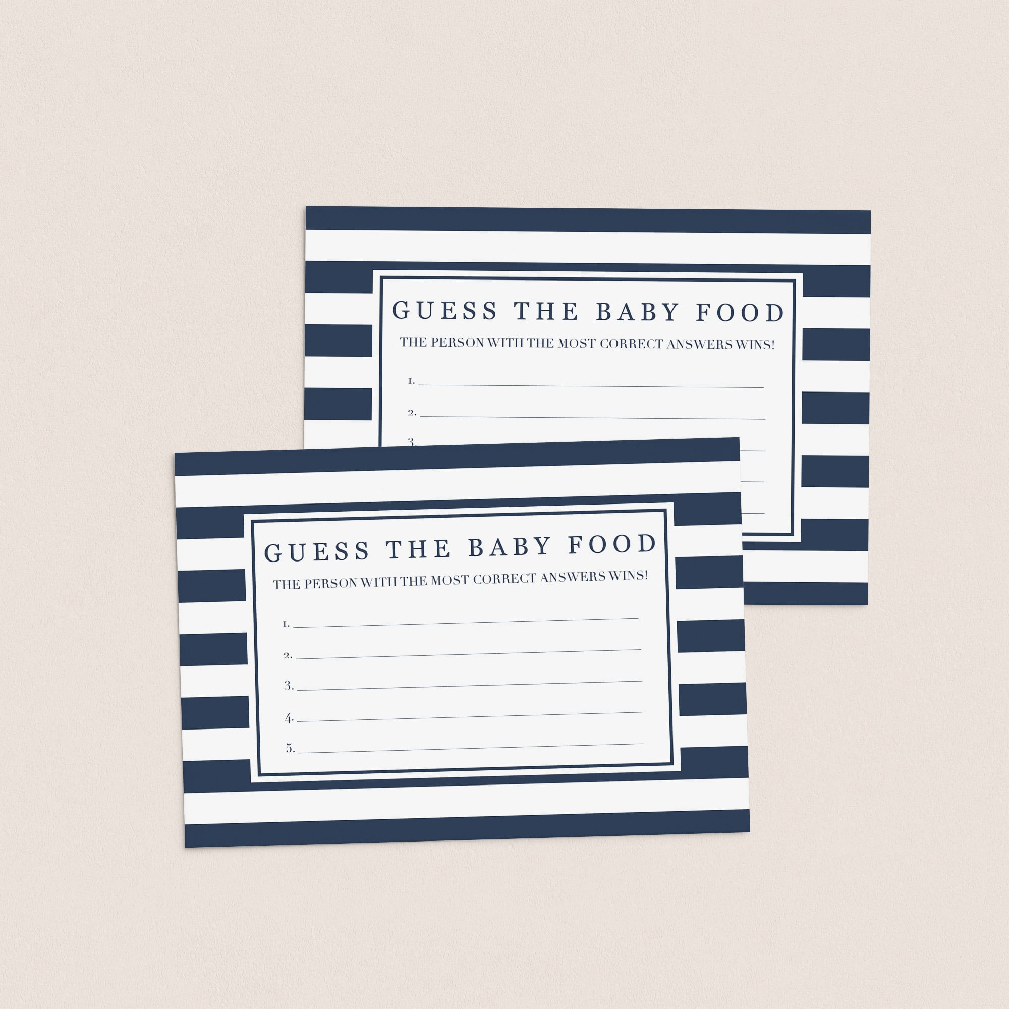 Are you hosting a baby shower to celebrate the arrival of a baby boy? Set up a funny baby shower activity with these nautical Guess The Baby Food sign and cards.
