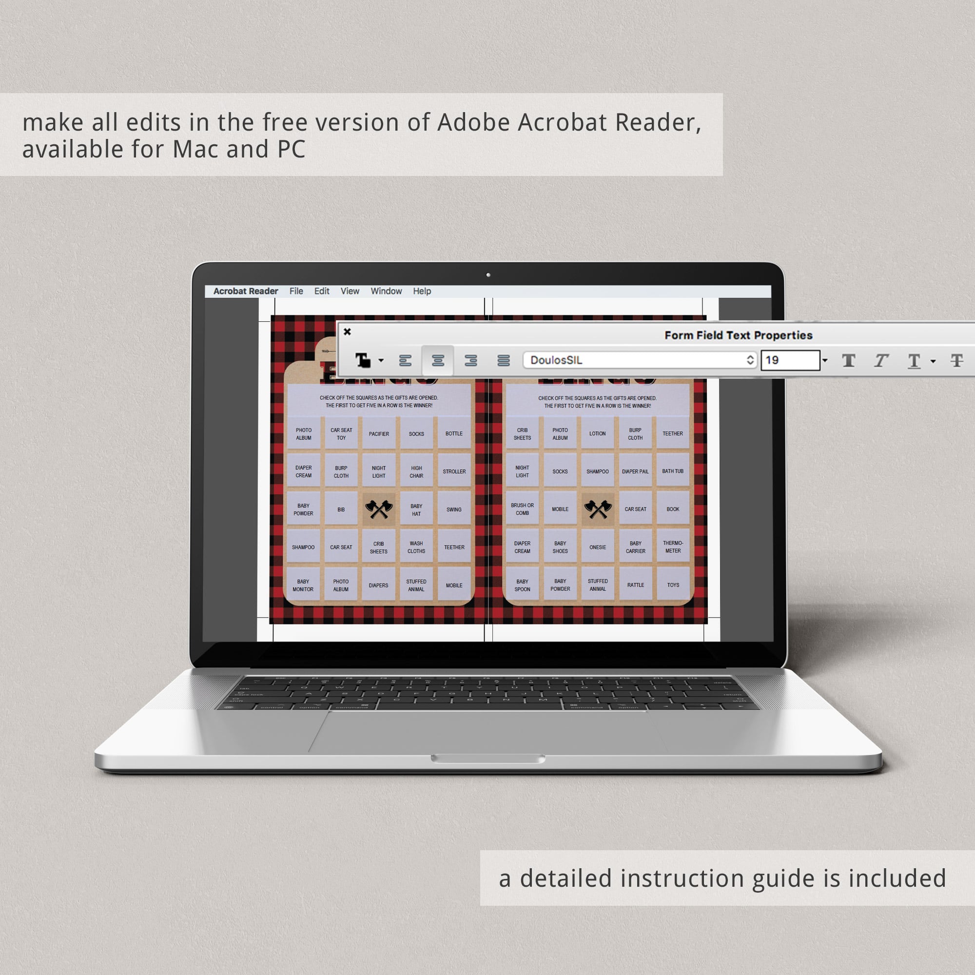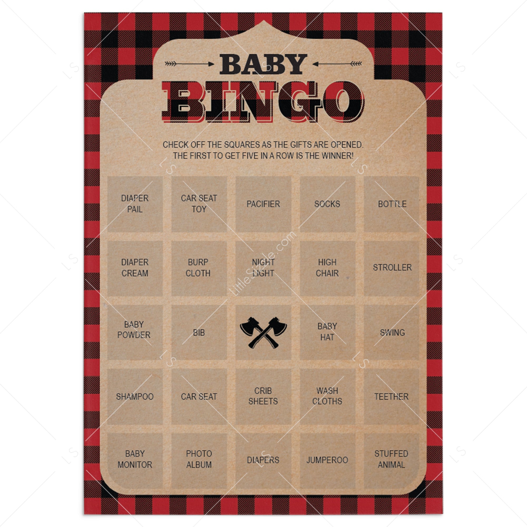 Let not only the mom-to-be enjoy unpacking the baby shower gifts! Play Bingo with these lumberjack themed baby bingo cards with buffalo plaid pattern. Check off the squares as the gifts are opened. The first to get five in a row is the winner.