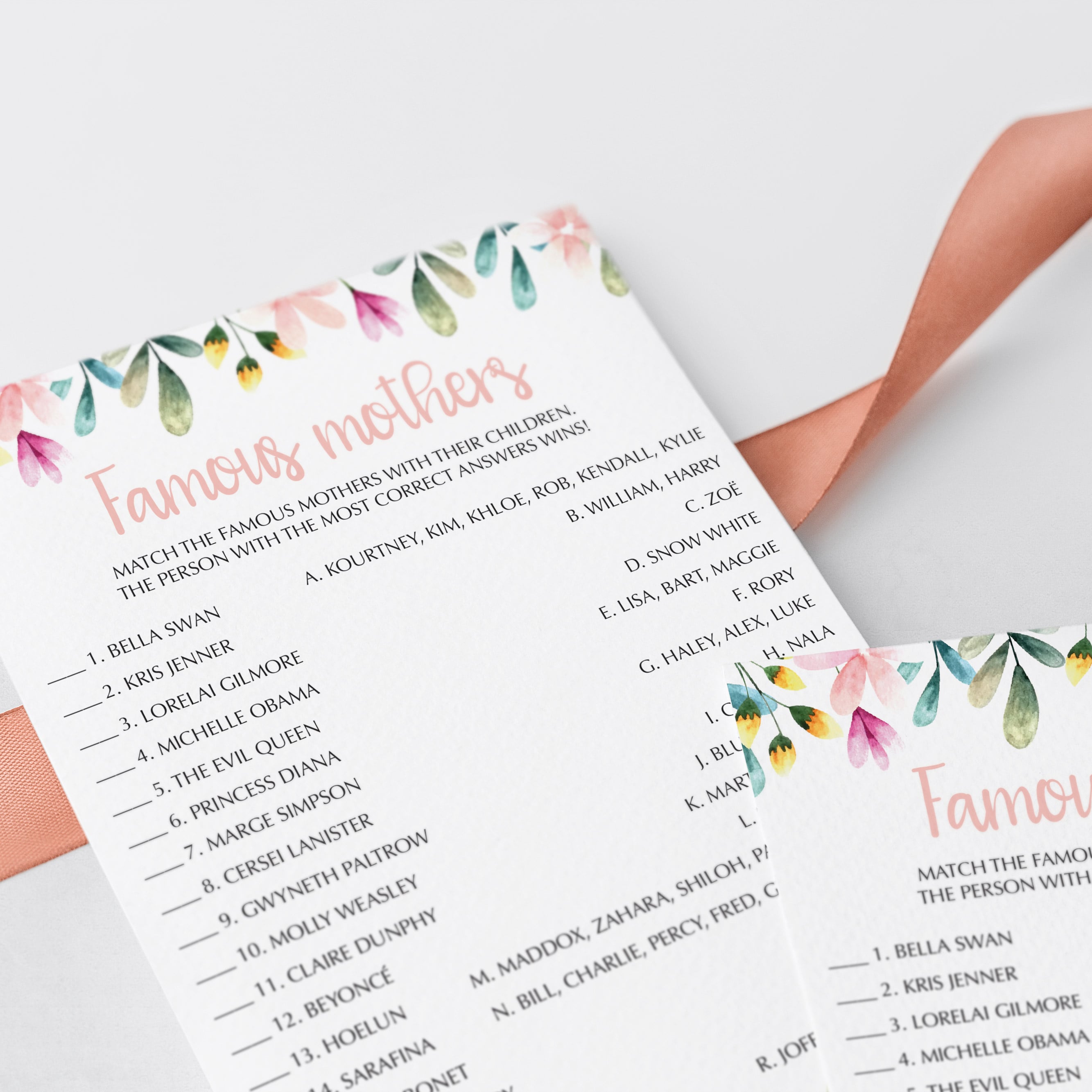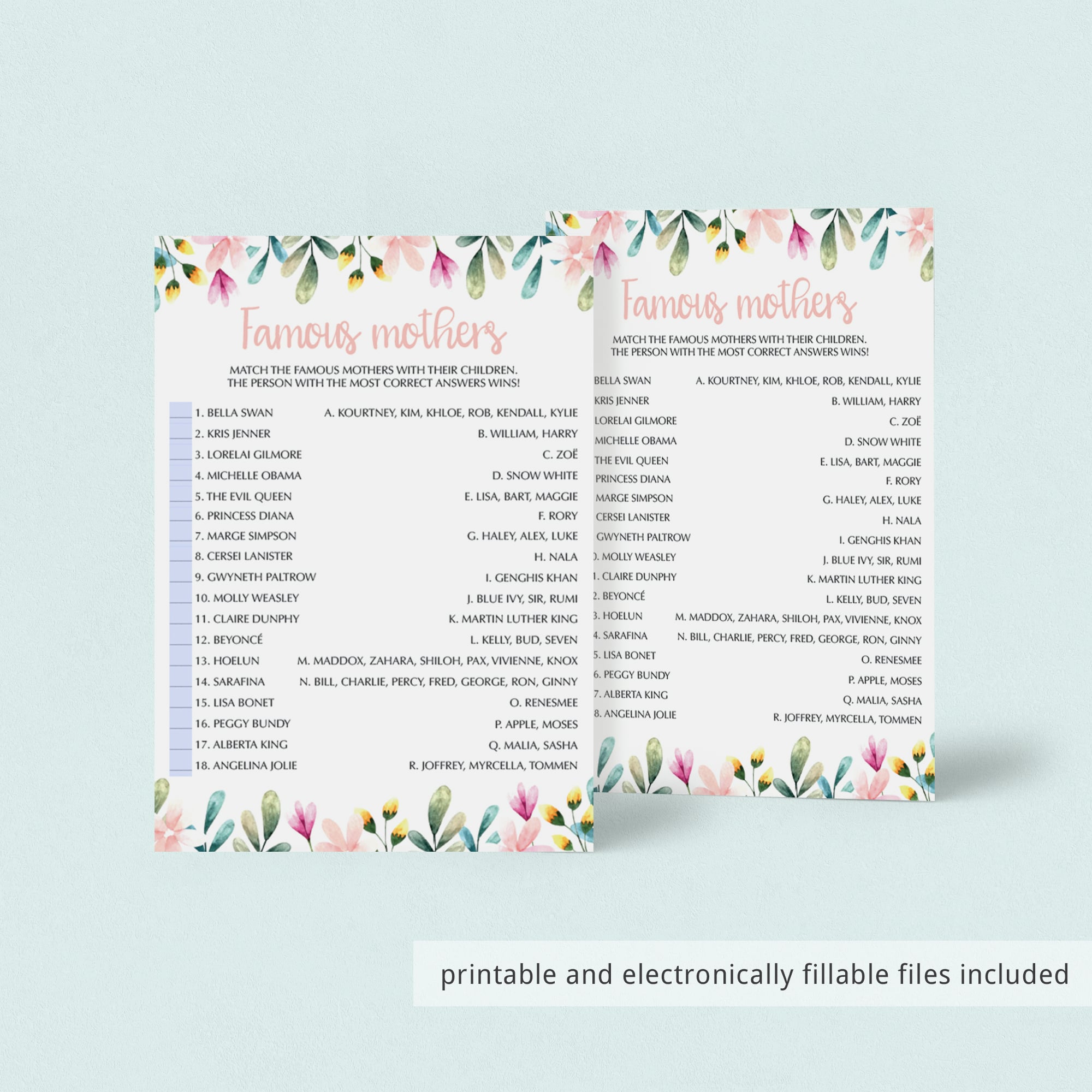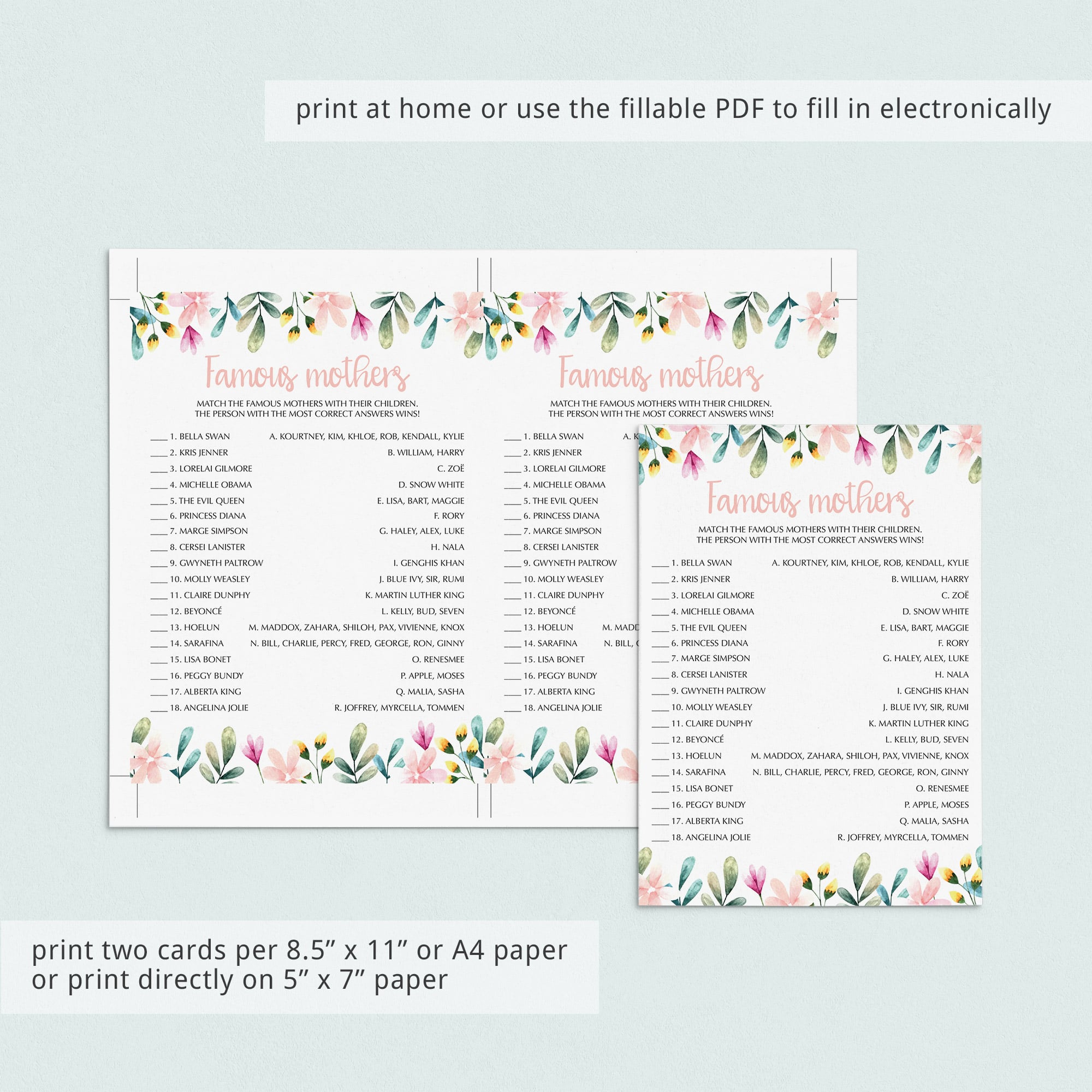 Are you looking for fun (virtual) Mother's Day game? Play Famous Mothers with this Celebrity Moms Match Up game card. Printable and electronically fillable files are included, so that you can print the cards at home or play online over a Zoom Call of Skype.