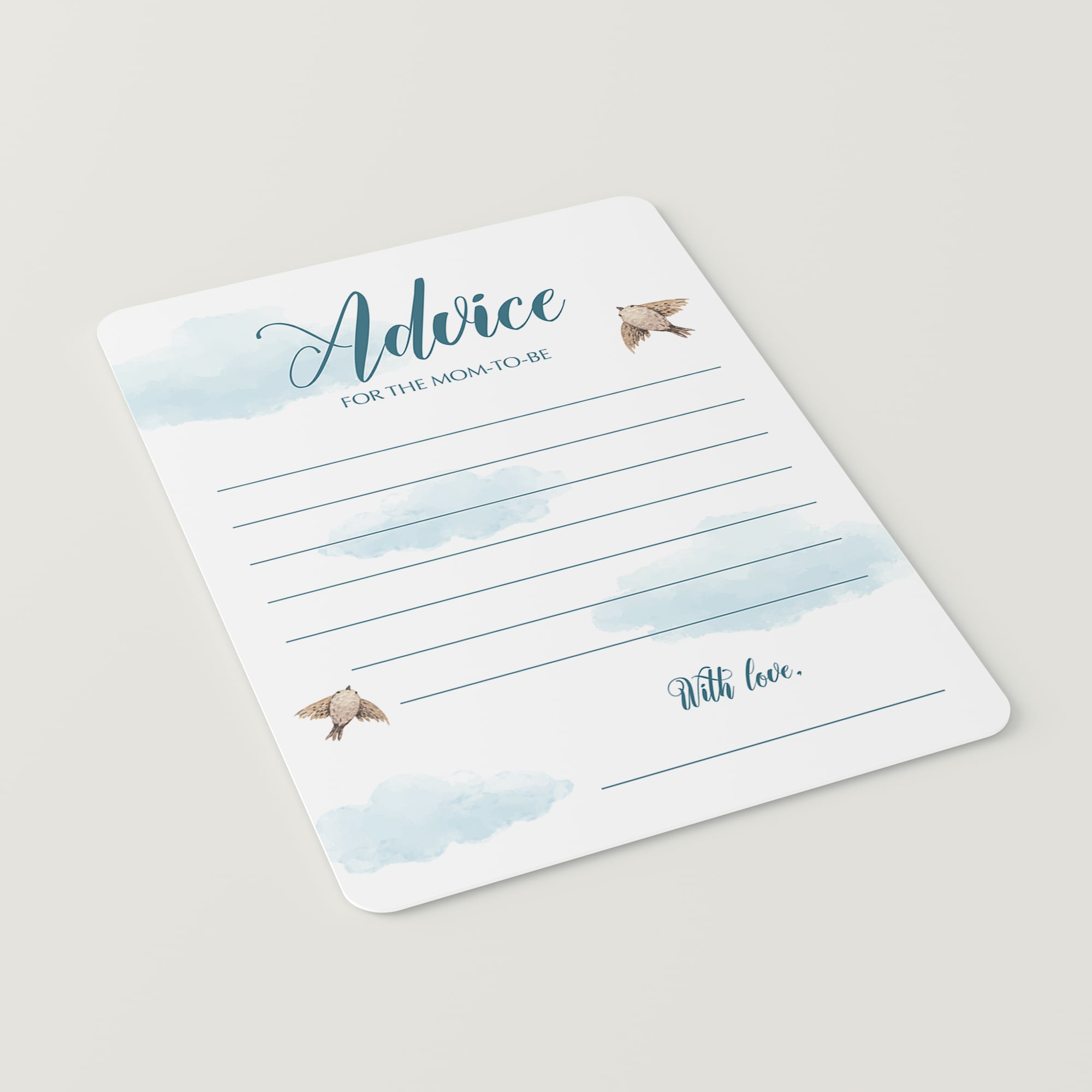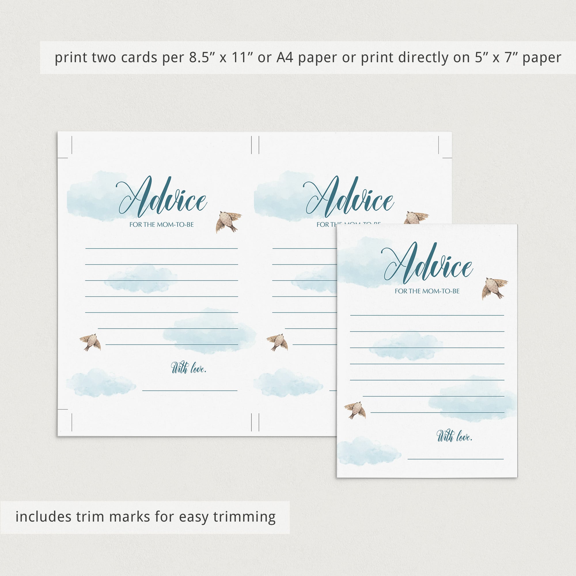 Print these blue baby shower advice cards right from your computer in a matter of minutes or have them printed at your favorite print shop.
