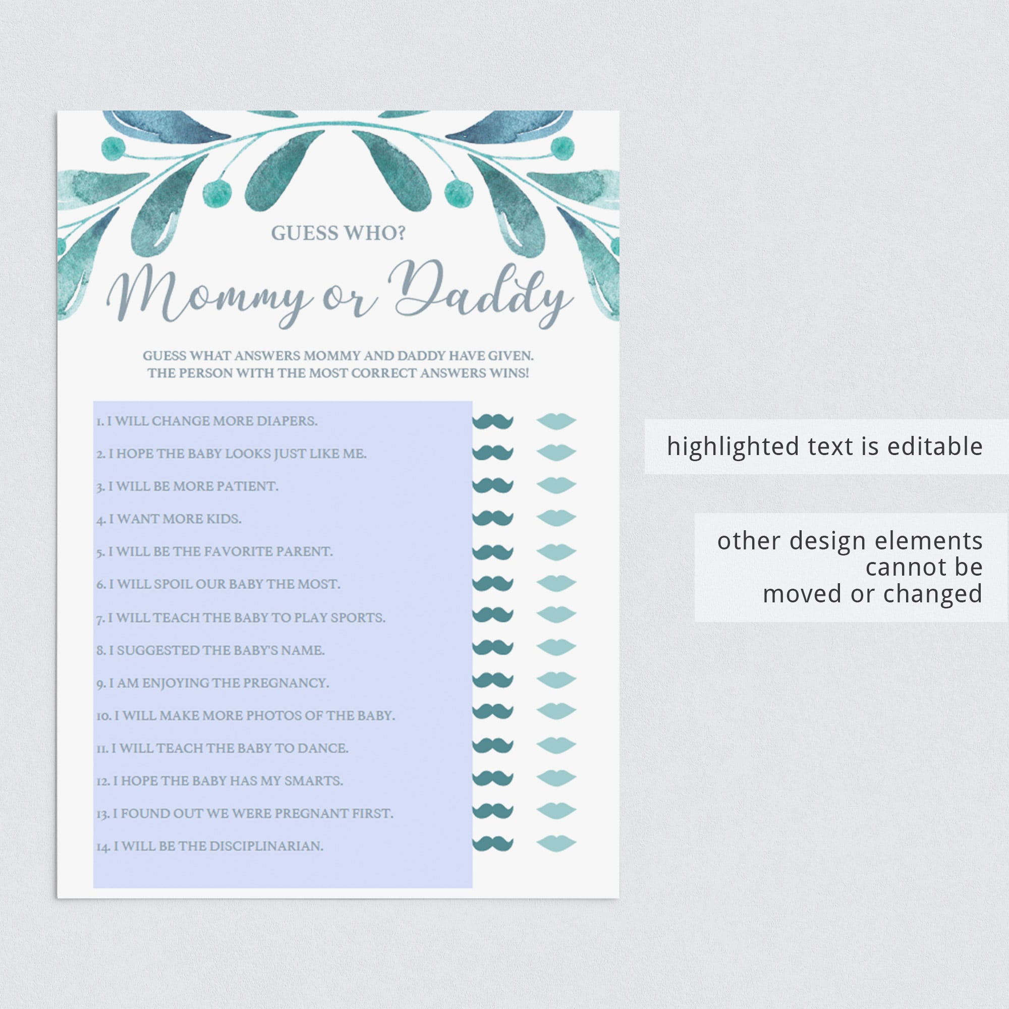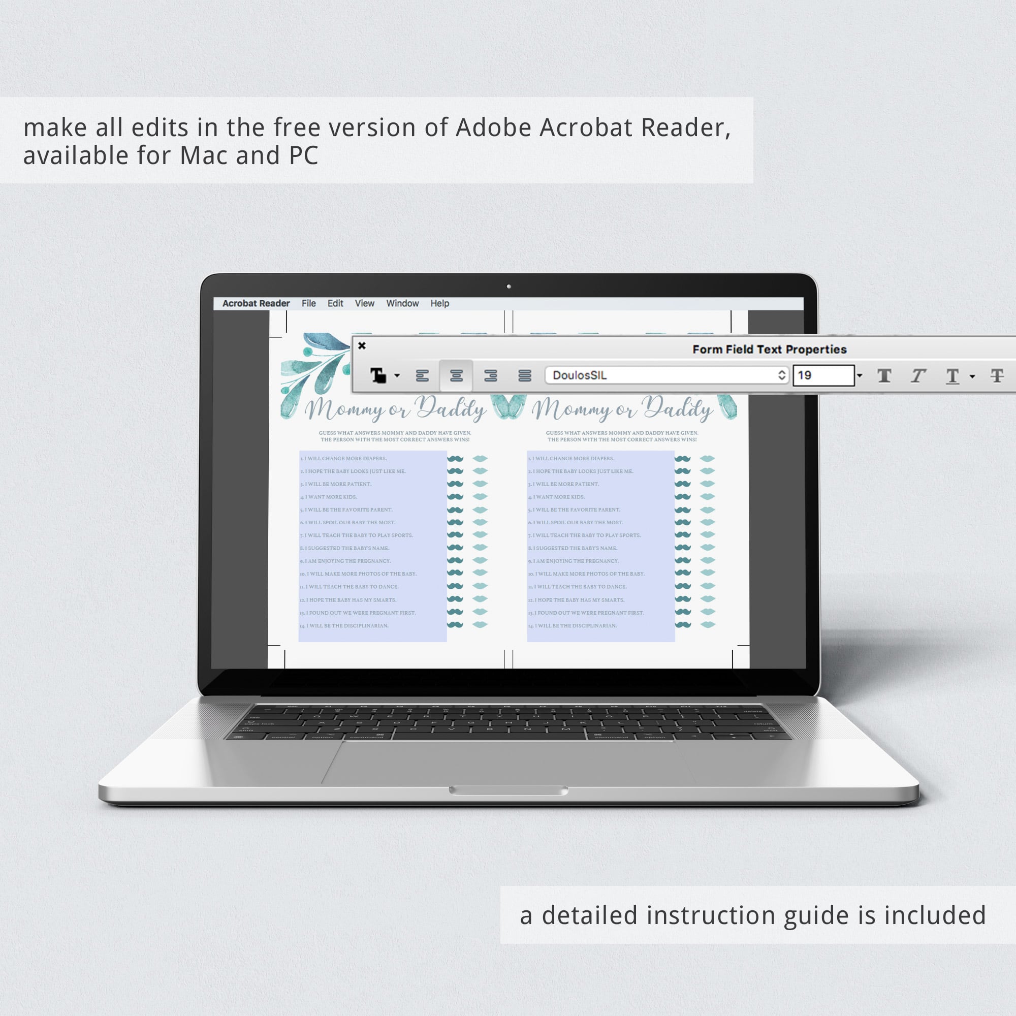 The game Mommy or Daddy is editable in the free version of Adobe Acrobat Reader, so that your can easily personalize the game. A detailed instruction guide with tips & tricks on editing, printing, trimming, paper choices and more is included. Print right from your computer in a matter of minutes or have the games printed at your favorite print shop.