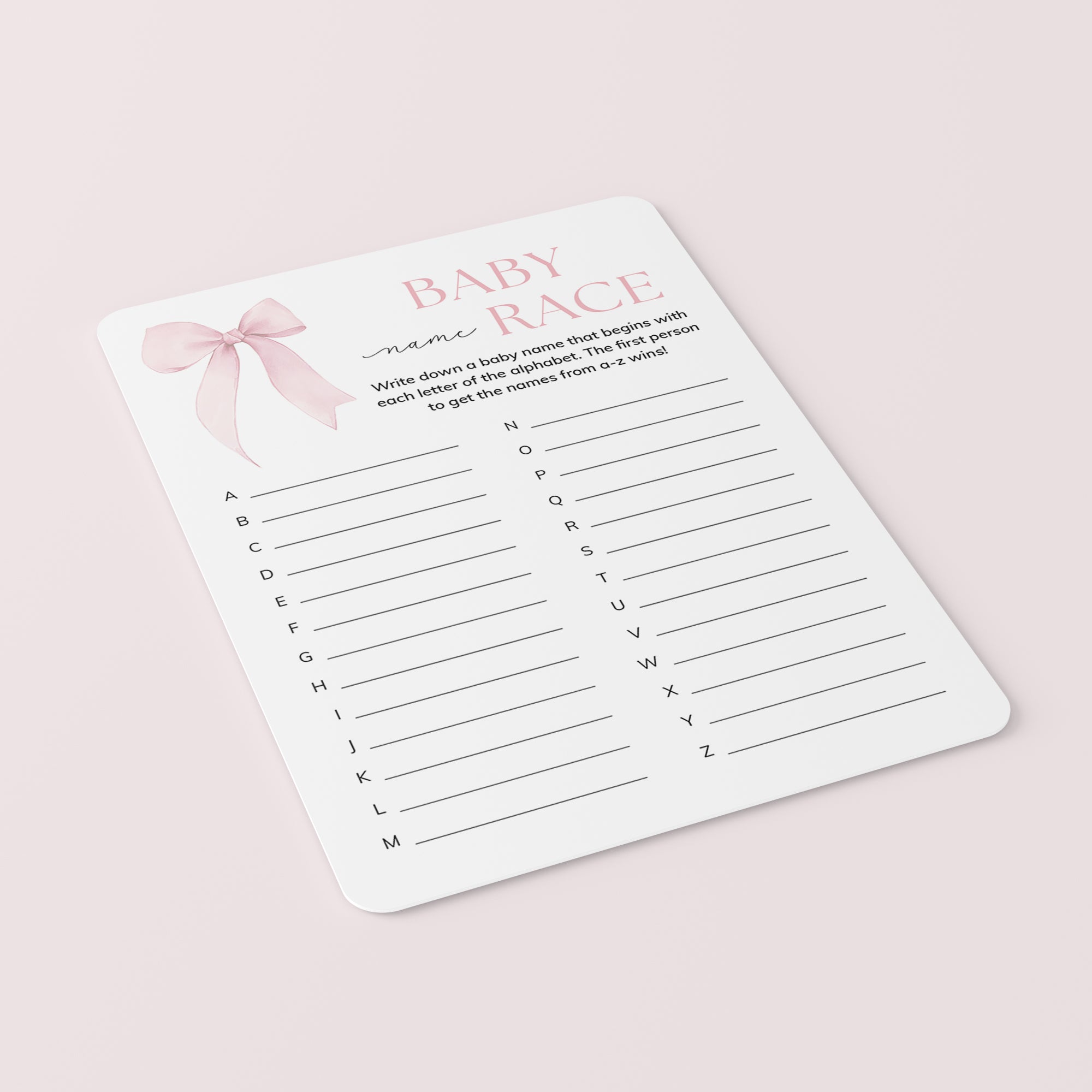 How many baby names do you know? Play Baby Name Race with this elegant coquette-themed baby shower Baby Names game with pink bow. It is the perfect addition to your girl baby shower.
