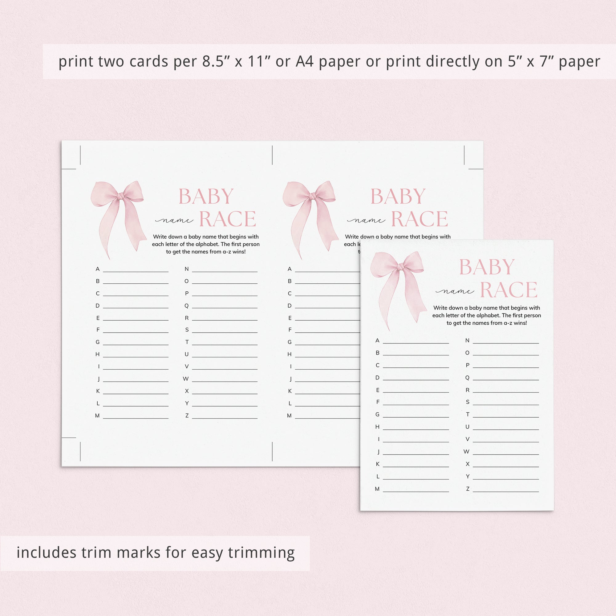 This Coquette Pink Bow Baby Name Race game is an instant download. After purchase you will receive a download link immediately on screen. Also within minutes of your order and payment, an e-mail will be sent to you with a link for your download.