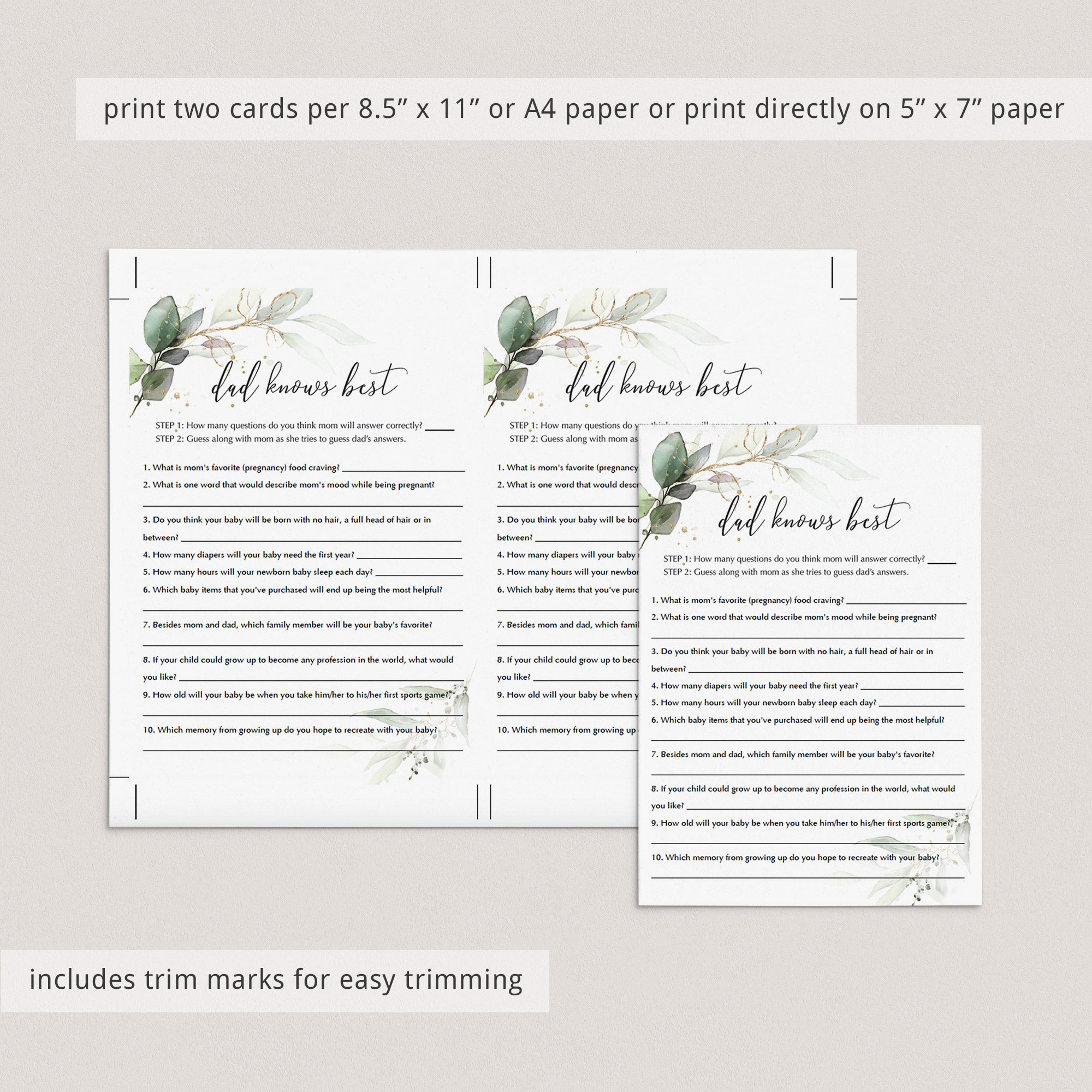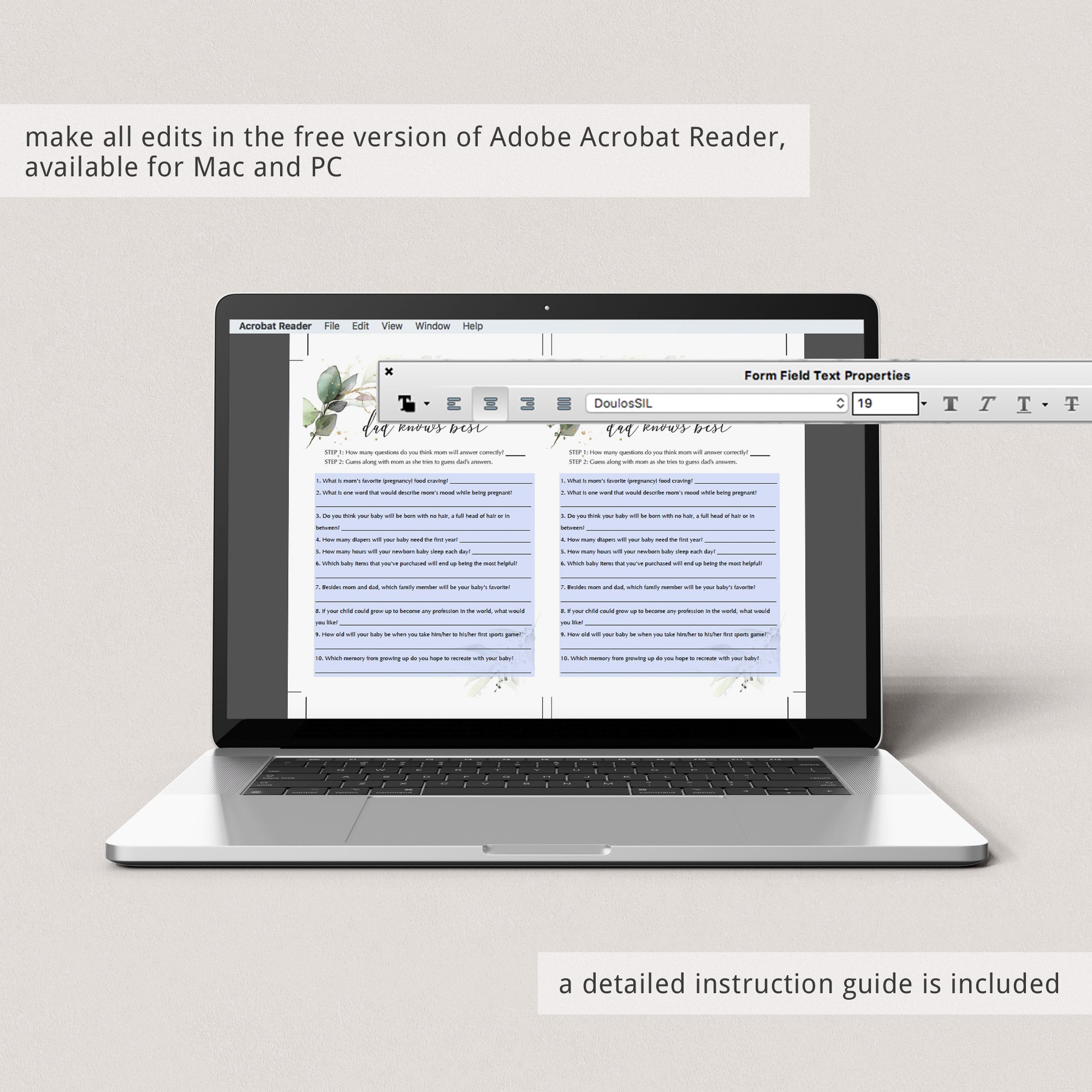 This Daddy Knows Best baby shower game template is editable in Adobe Acrobat Reader (free download). After downloading the file, fill in your own questions and print in just minutes. Print the game cards on any 8.5" x 11" paper of your choice. We recommend a nice heavy card stock for the highest quality feel. A detailed instruction guide with tips & tricks on editing, printing, trimming, paper choices and more is included.