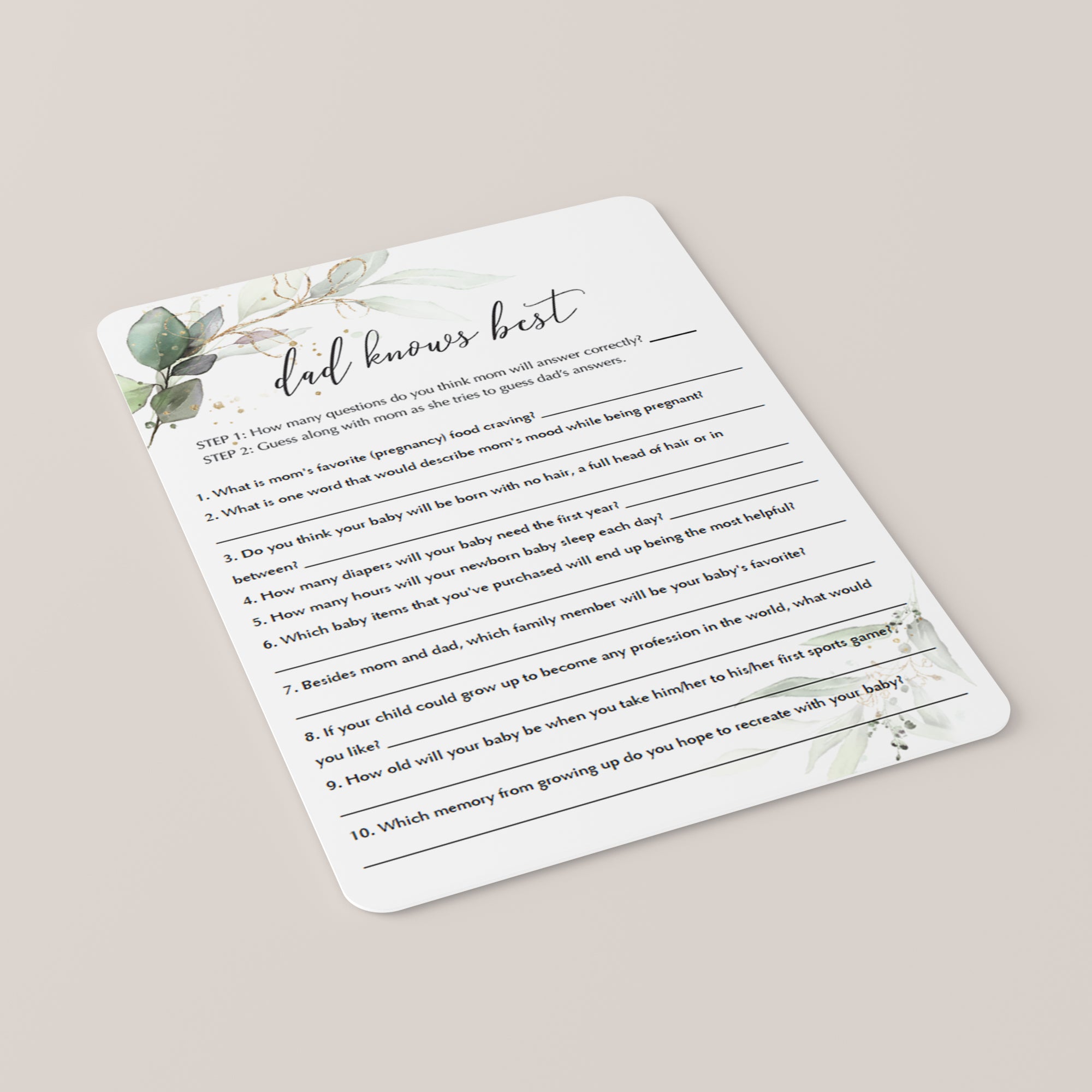 Before the baby shower, contact the daddy and ask him the questions about the pregnancy, birth, and baby listed on this gorgeous greenery and gold game card. The questions can be personalized. Write down the answers, or, to make it even more fun, consider a short video of the answer.