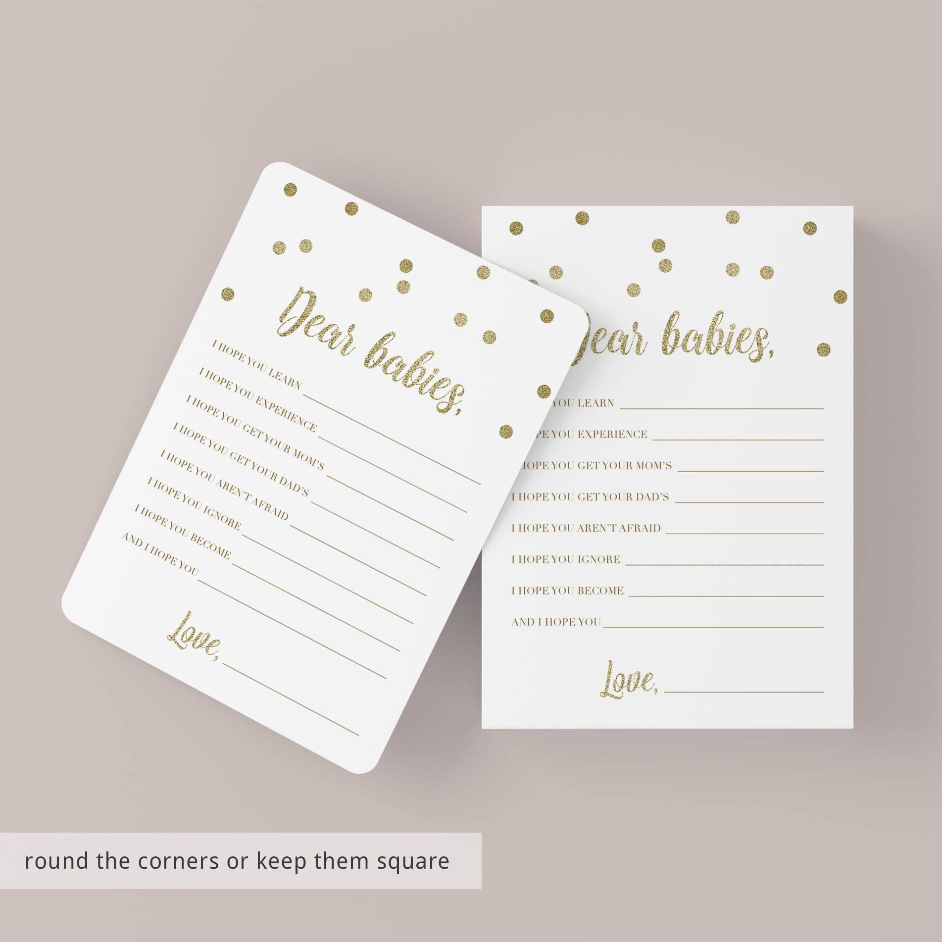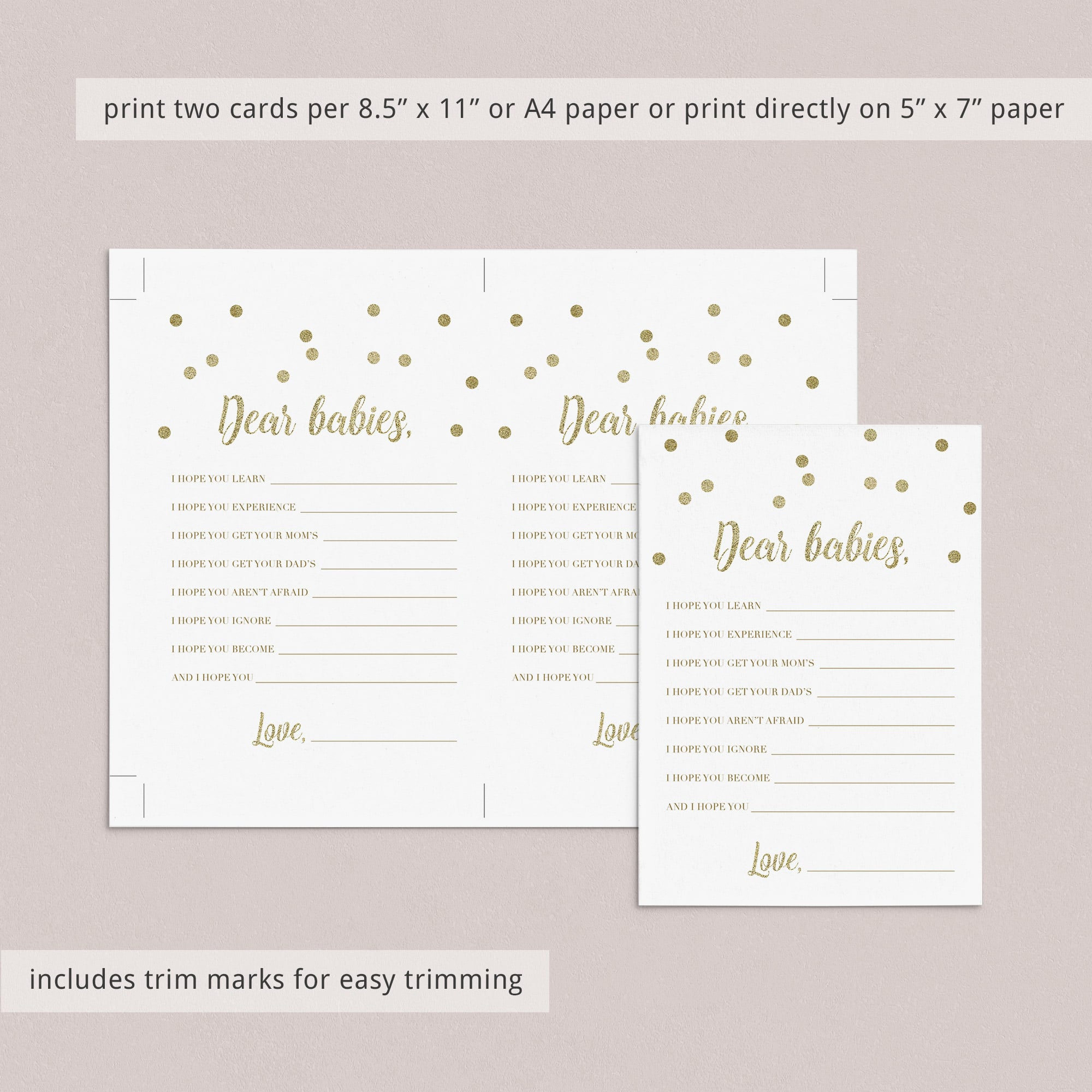 This gold confetti Dear Babies card is an instant download, so simply download and print the cards as many times as you need. We recommend printing on a nice heavy card stock for highest quality feel.