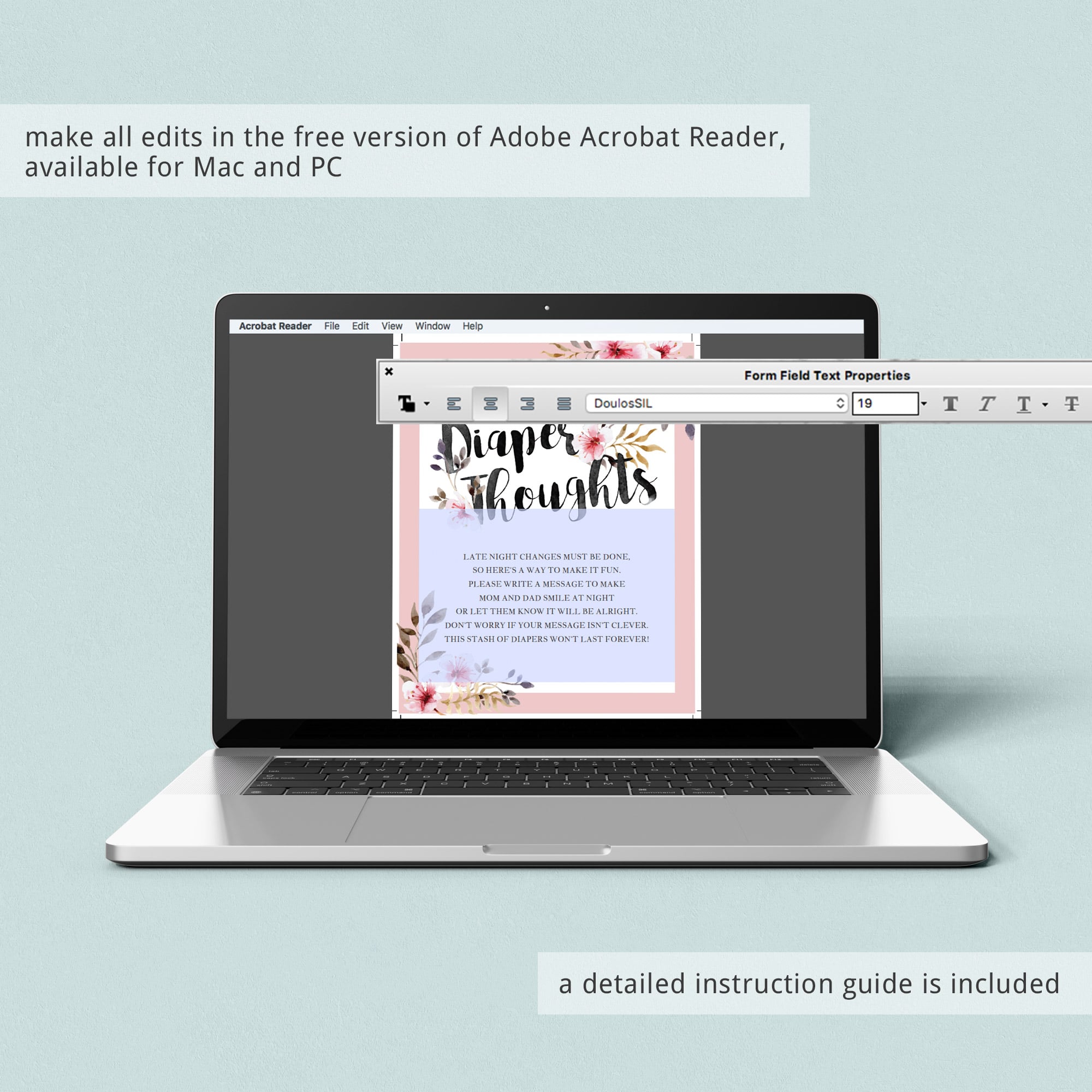 Easily personalize the Diaper Thought sign with your own words. A detailed instruction guide with tips & tricks on editing, trimming, paper choices and more is included. Simply download, edit, print and display.