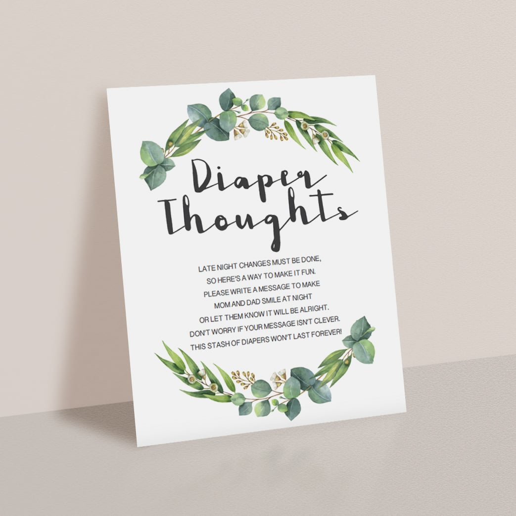 Are you looking for a creative and fun baby shower activity? Set up a Diaper Thoughts station with this gorgeous baby shower sign with greenery wreath. Guaranteed to be a huge hit at any neutral baby shower!