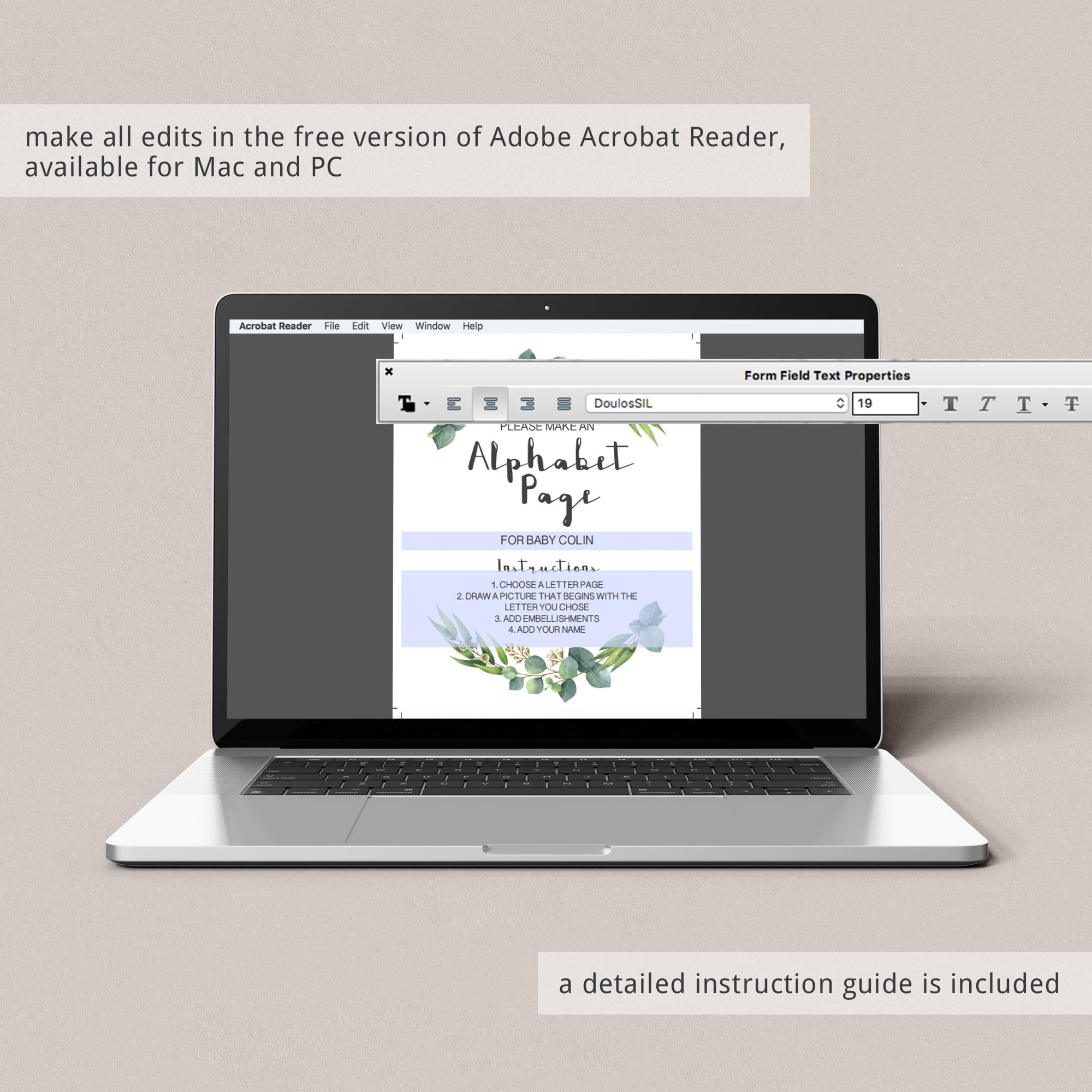 The Alphabet Page sign and Baby Face sign are editable in Adobe Acrobat Reader, so that you can personalize the signs (please check the photos to see what parts can be edited).