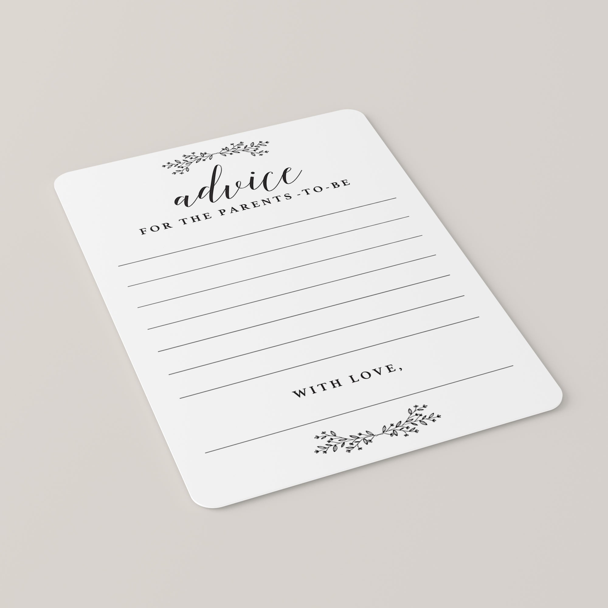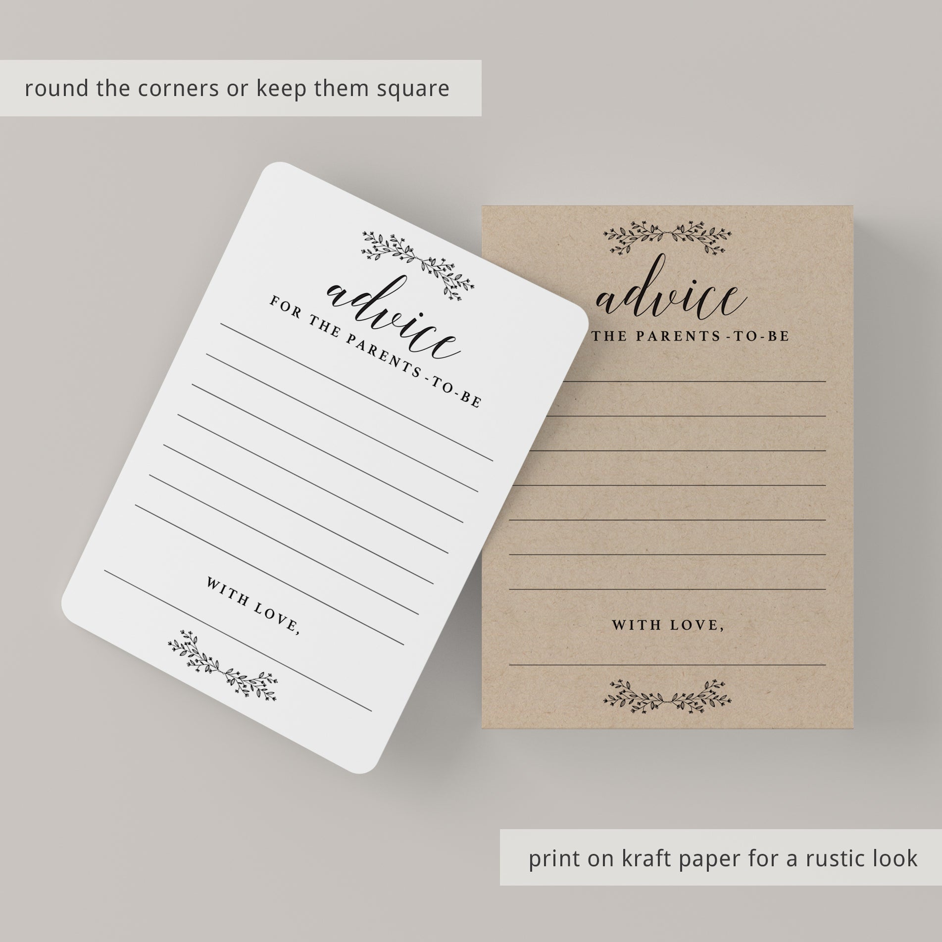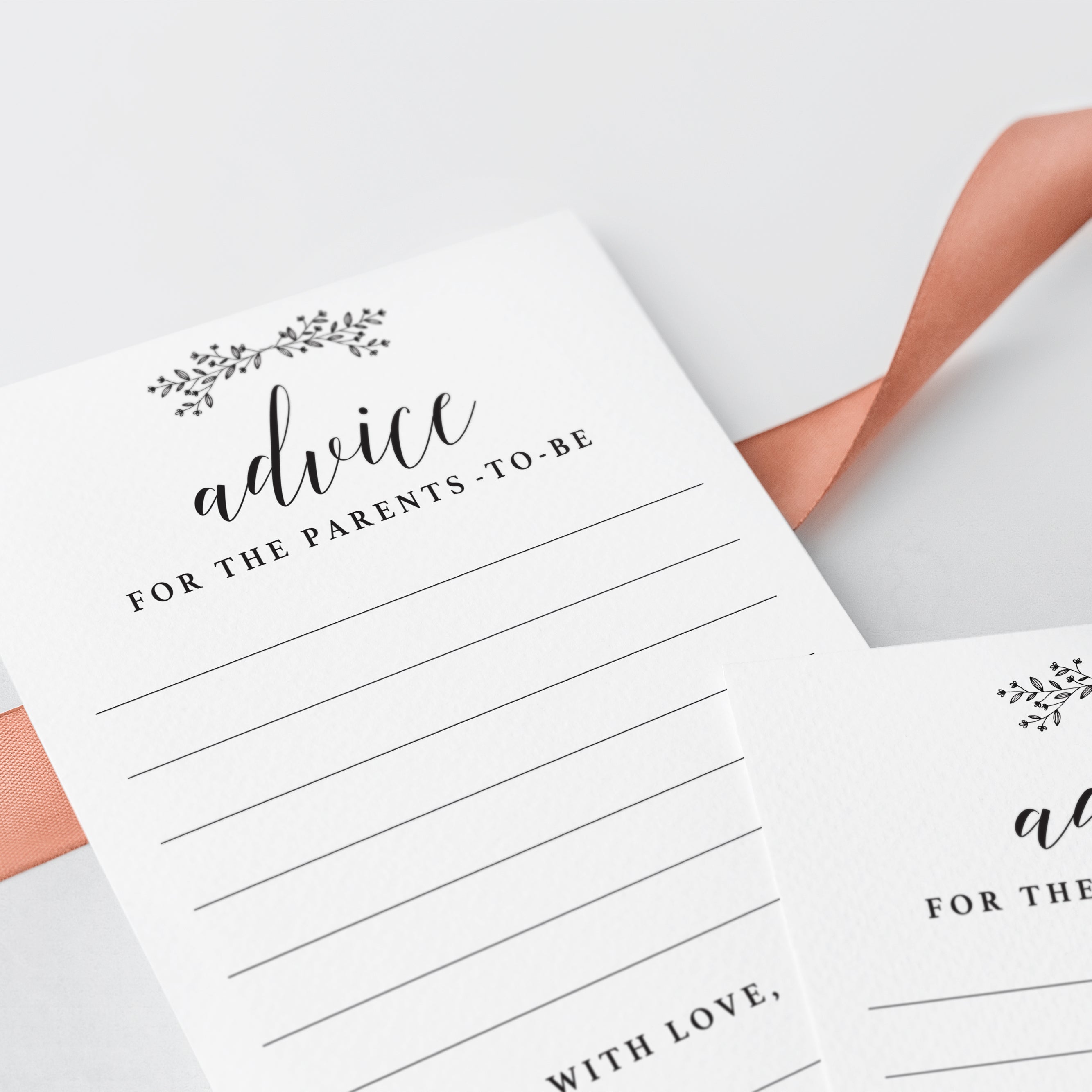 Are you hosting a couples baby shower? Create a meaningful keepsake for the new parents with these elegant baby shower advice cards. Let every guest write down their advice for the new parents and collect the cards for the lucky couple. The simple, yet elegant cards are perfect for a gender neutral baby shower.