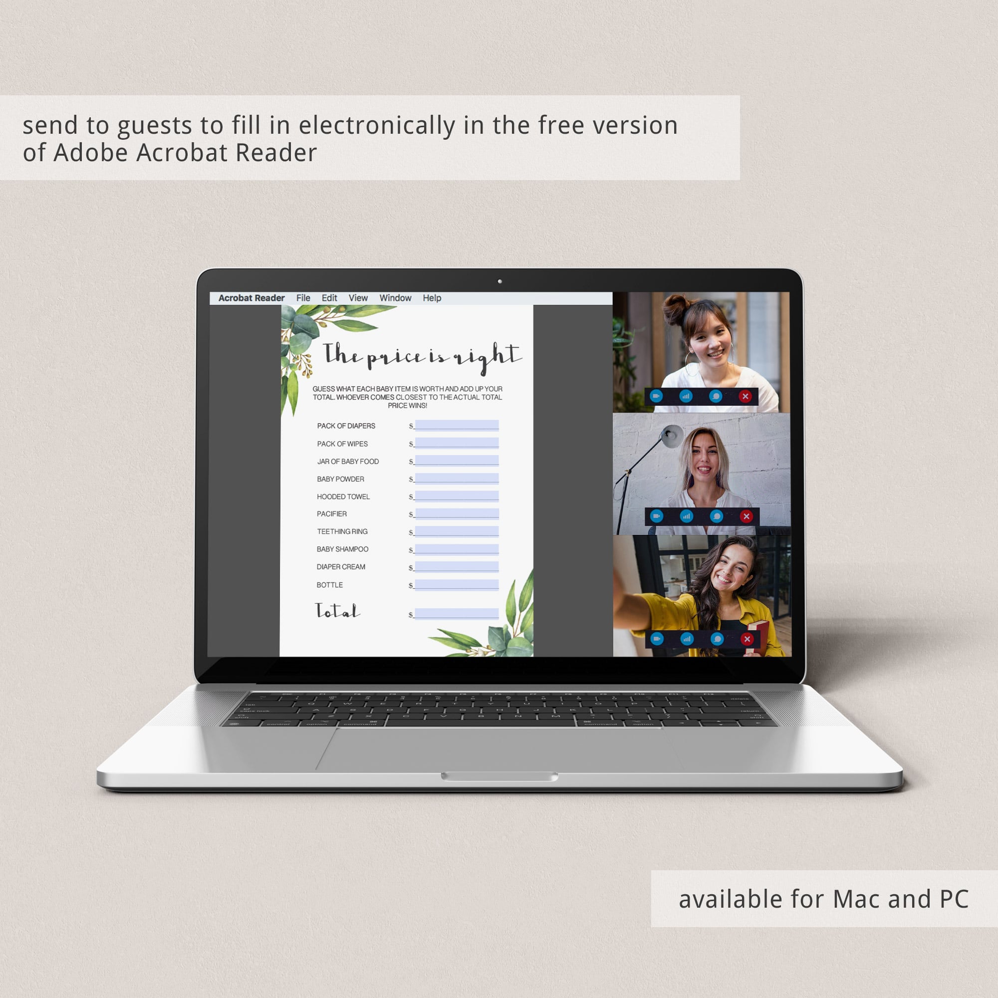 And if you are hosting a zoom baby shower, you can email the game cards to friends and family and have them print the cards at home or fill in the prices electronically in the free version of Adobe Acrobat Reader.